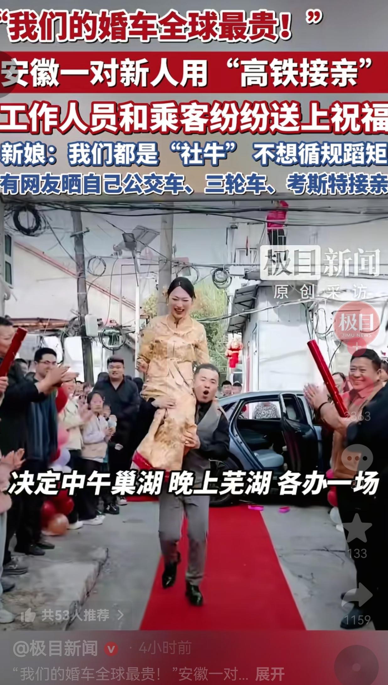 安徽这对新人高铁接亲火了!“别人结婚用豪车接亲,他俩直接把高铁当婚车,拎着两大篮喜糖满车厢撒,全车乘客集体送祝福,新娘一句话直接封神:“我们的婚车,全球最贵!” 这事儿发生在安徽芜湖高铁站,新娘老家在芜湖,新郎是巢湖人,俩人4年前因为工作认识,今年3月28日办婚礼。 为了兼顾两边的亲戚,他俩干脆定了个狠主意:中午在巢湖办一场,晚上回芜湖再办一场!那怎么来回?租车队?太俗套!俩人一拍大腿:坐高铁! 婚礼当天,新娘穿着一身金灿灿的龙凤褂,新郎穿得笔挺的西装马甲,俩人手里各拎着一个藤编篮子,里面装满了喜糖,直接就上了高铁。 一进车厢,俩人就开始给每一位乘客发喜糖,逢人就说“我们今天结婚啦,沾沾喜气!” 整个车厢瞬间炸了!乘客们本来还在低头玩手机,一抬头看见穿龙凤褂的新人,全乐了,纷纷站起来鼓掌、拍照,连列车工作人员都过来送祝福,整个车厢全是欢呼声,比办婚礼还热闹! 新娘后来接受采访的时候,笑得特别灿烂:“我俩都是社牛,就不想循规蹈矩,别人结婚都是豪车车队,我们觉得高铁才是全球最贵的婚车!这是国家的名片,坐着高铁结婚,又环保又有意义,还能把喜气分享给所有人,多好啊!” 俩人发完喜糖,还对着镜头比心,跟全车乘客挥手,那股子幸福劲儿,隔着屏幕都能感受到!消息一出来,网友们直接炸锅,有网友调侃:“1.8亿的婚车确实贵哈”,还有不少人纷纷晒出了自己当年的接亲方式:有坐双层公交车接亲的,有骑三轮车的,还有开着考斯特就把新娘接走的,全是满满的回忆杀! 网友看到后评论说: 这才是结婚该有的样子啊!比那些租一排劳斯莱斯撑场面的强一万倍!喜气是分享出来的,不是摆出来的! 也有的网友说: 我酸了!当年我结婚就是租的豪车,花了好几万,结果路上堵了俩小时,新娘差点迟到!人家这高铁多爽,准时、环保,还能让全车人沾喜气,太会了! 还有的网友说: 实名羡慕这俩社牛!换我我肯定不敢在高铁上发喜糖,但是看着真的好幸福啊!这才是爱情该有的样子,不攀比、不虚荣,就是开开心心过日子! 更有网友说: 我在高铁上见过无数次接亲,这对是最暖的!整个车厢都被他们的喜气感染了,祝福这对新人,永远幸福! 说实话,我看完这个视频,直接破防了! 现在的结婚风气,真的太爱攀比了!好像不租一排劳斯莱斯、不搞个几十辆车队,就不算结婚;好像彩礼不给个几十万、不买个大钻戒,就不算爱对方! 多少年轻人被所谓的“婚礼排场”压得喘不过气,多少家庭因为彩礼、车队闹得鸡飞狗跳,好好的喜事,变成了攀比的战场! 可这对安徽新人,直接给所有人上了一课! 什么是最贵的婚车?不是几百万的劳斯莱斯,不是限量版的超跑,是咱们中国的高铁!是国家发展的名片,是普通人出行的底气,是带着全车厢陌生人祝福的幸福列车!网友调侃的“1.8亿的婚车”,说的就是这份刻在骨子里的底气和骄傲! 他们不攀比、不虚荣,不搞那些虚头巴脑的排场,就是用最朴素的方式,分享最真实的幸福!俩人社牛又可爱,拎着喜糖满车厢撒,把自己的快乐传递给每一个陌生人,这才是结婚的意义啊! 结婚,从来不是给别人看的,是过给自己的!不是摆给亲戚朋友看的排场,是两个人往后余生的烟火气!那些租豪车撑场面的,婚后日子过得一地鸡毛的,大有人在;可像这样,两个人心往一处想,劲往一处使,哪怕坐高铁、坐公交、骑三轮车、开考斯特,日子也能过得甜甜蜜蜜! 这件事火遍全网,根本不是因为他们的婚车有多贵,而是因为他们活成了所有人羡慕的样子! 他们打破了世俗对婚礼的偏见,告诉所有人:结婚,从来没有标准答案!不用循规蹈矩,不用攀比排场,只要两个人真心相爱,哪怕坐高铁、坐公交、骑三轮车,都是最幸福的婚礼! 现在的年轻人,越来越清醒了!不再被所谓的“婚俗”绑架,不再为了面子活受罪,而是选择自己喜欢的方式,过自己想要的人生!这才是最珍贵的! 高铁有价,幸福无价;排场有价,真心无价!这对新人用行动告诉我们:最好的婚姻,从来不是物质的堆砌,而是两个人一起,把平凡的日子,过成满是喜气的样子! 最后,我想说的是:真正的幸福,从来不需要豪车撑场面,心在一起,坐高铁都是全世界最甜的婚车! 对此,你怎么看?