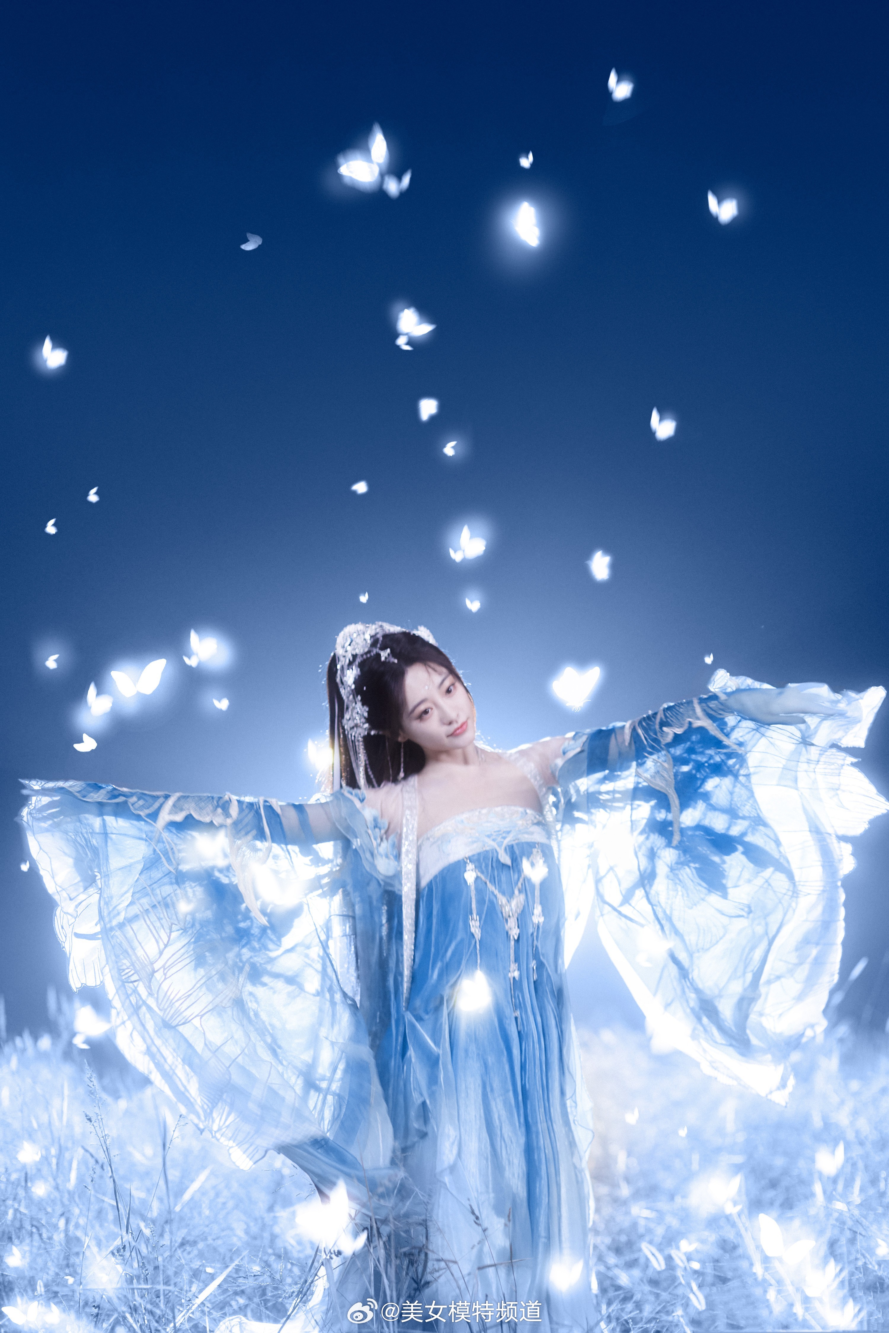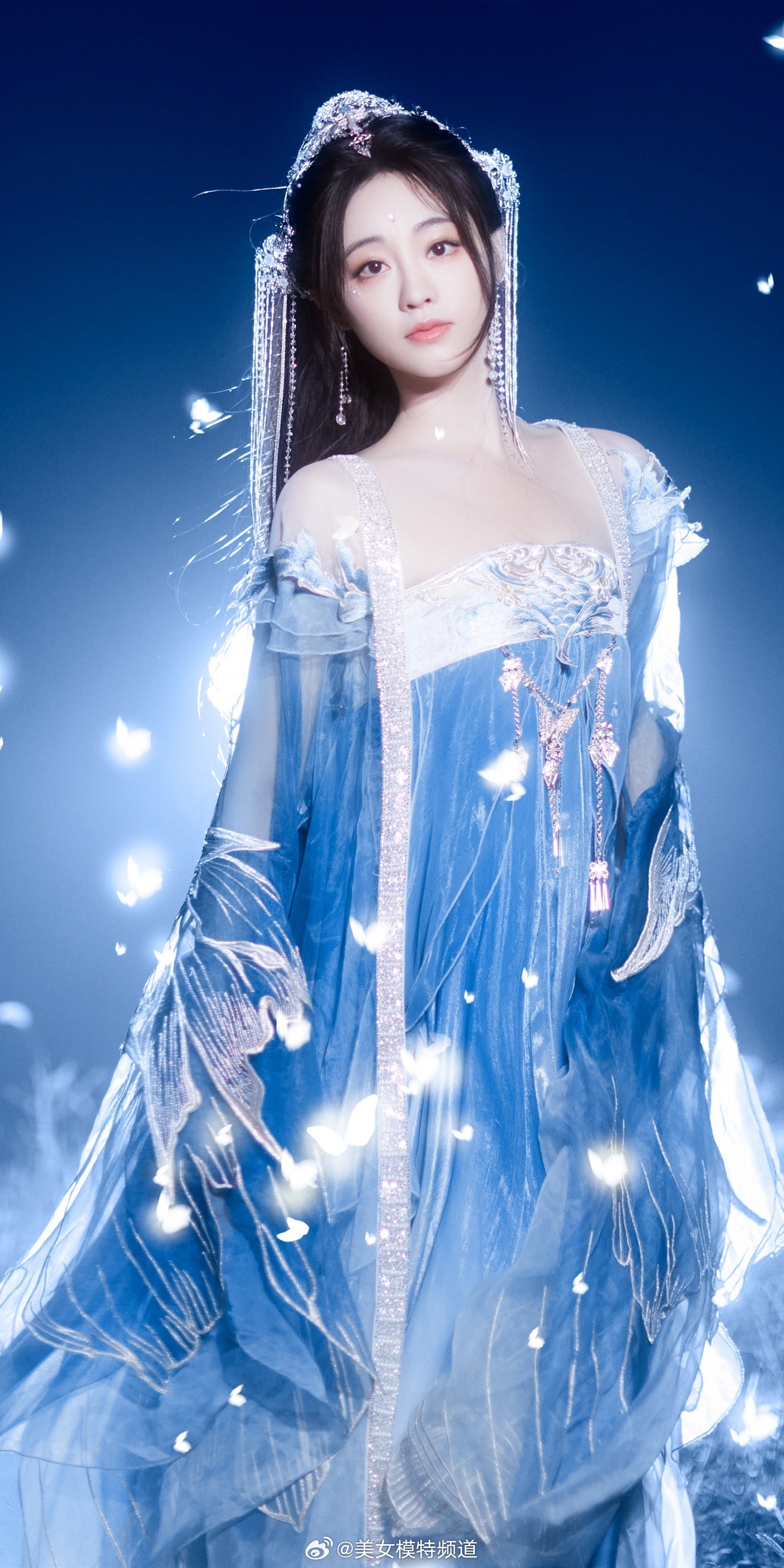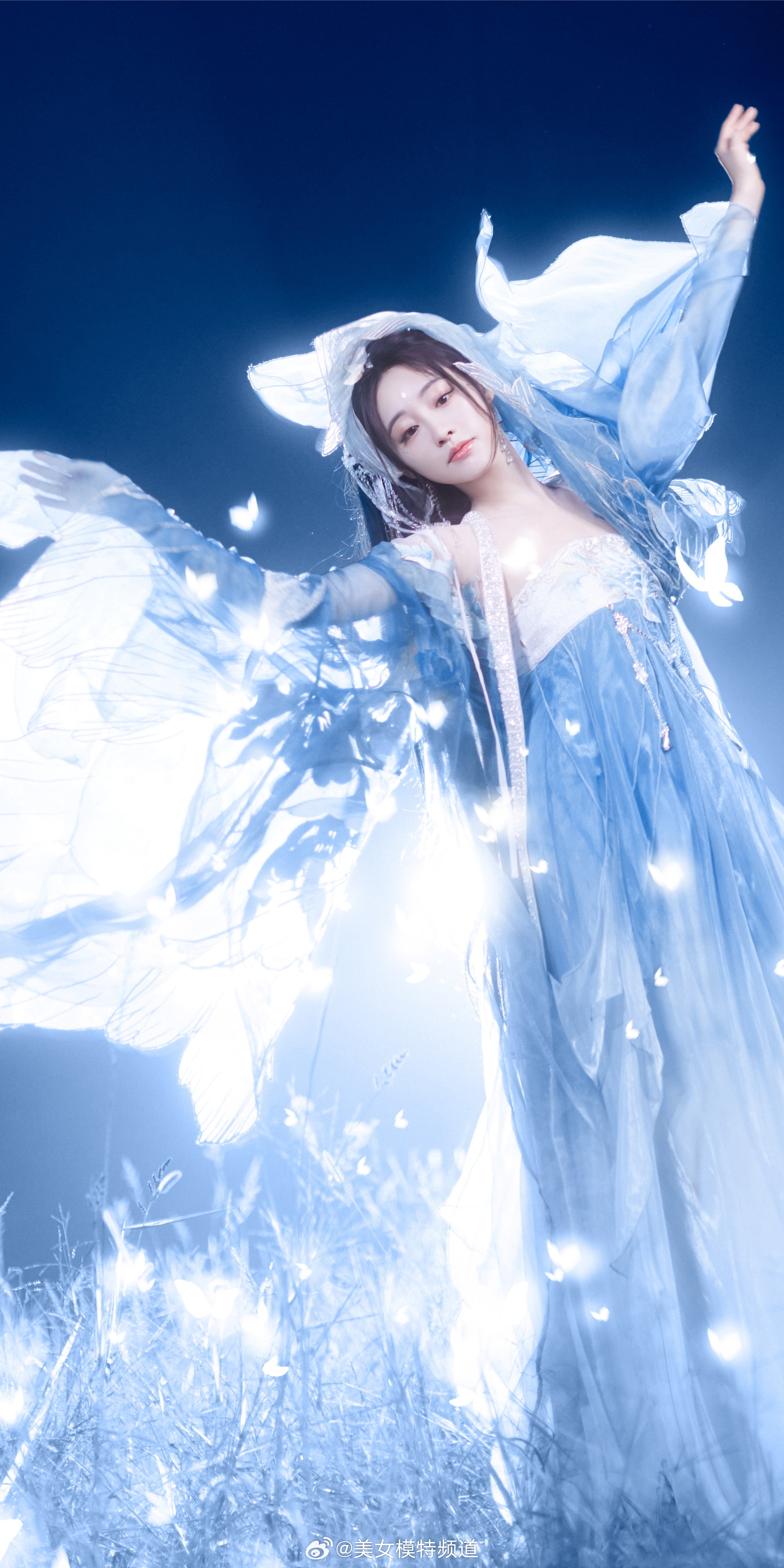 古典美人漫步花径,蓝衣金花,韵味十足!