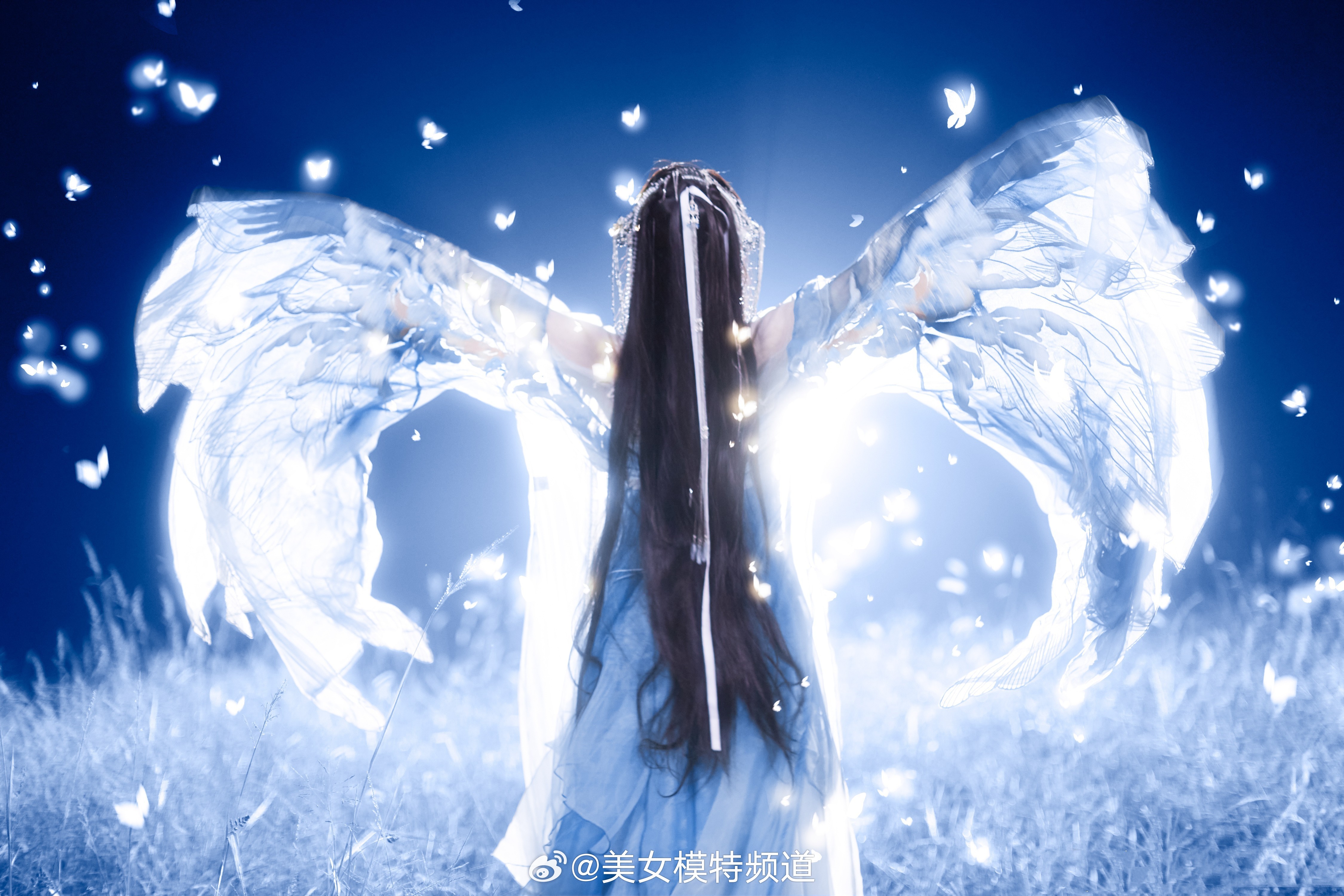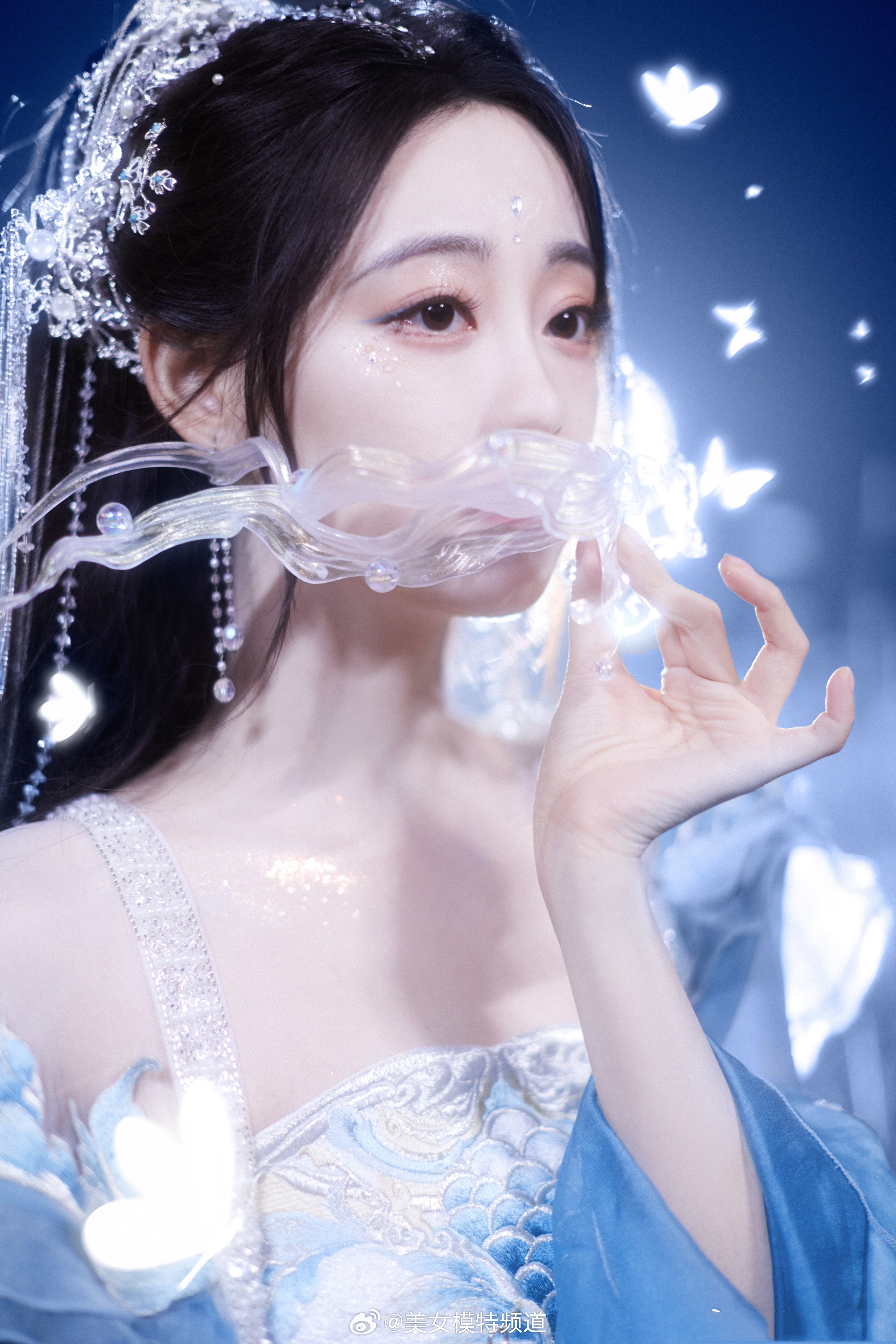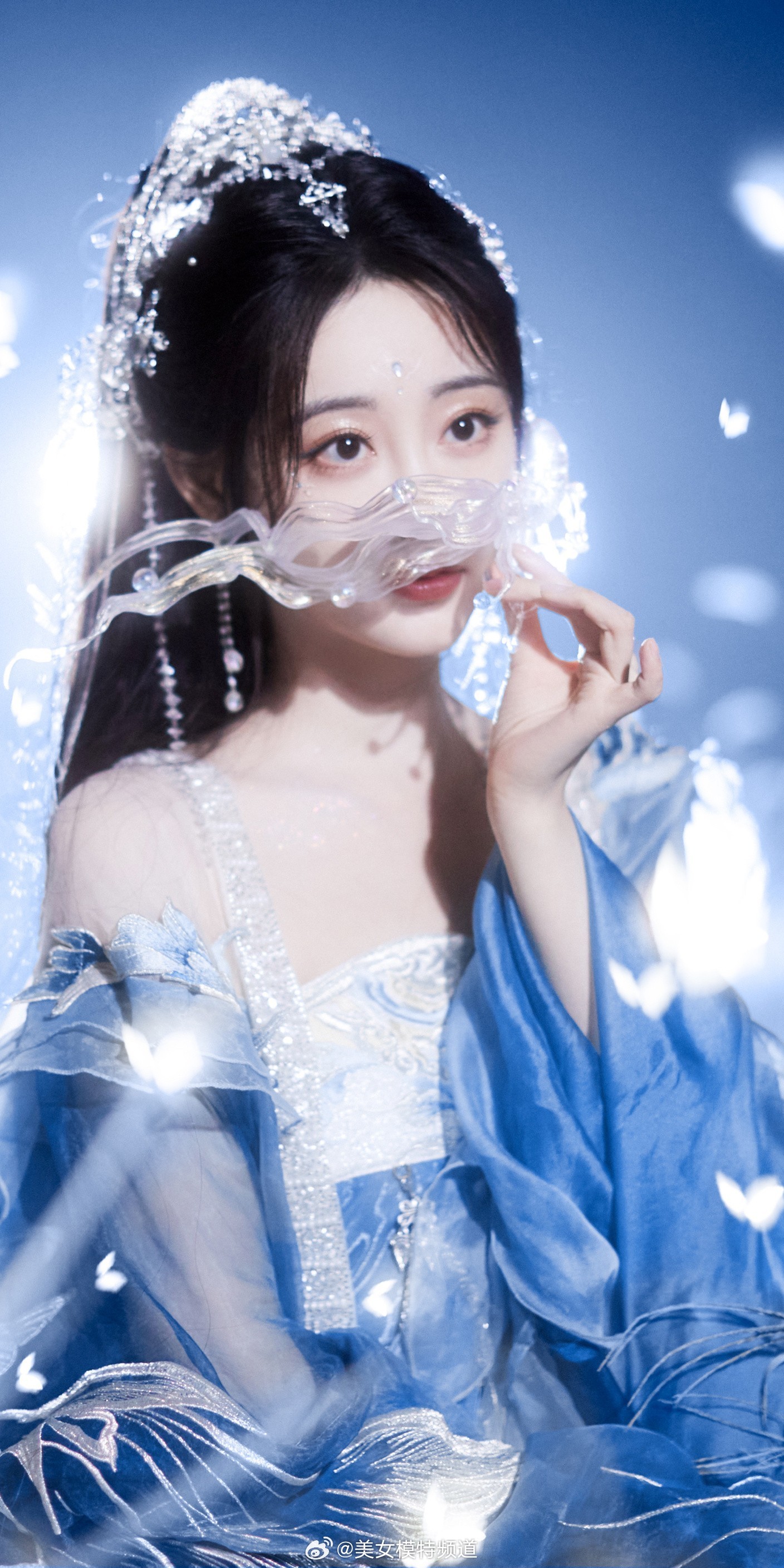 古典美人漫步花径,蓝衣金花,韵味十足!