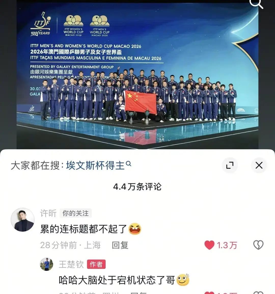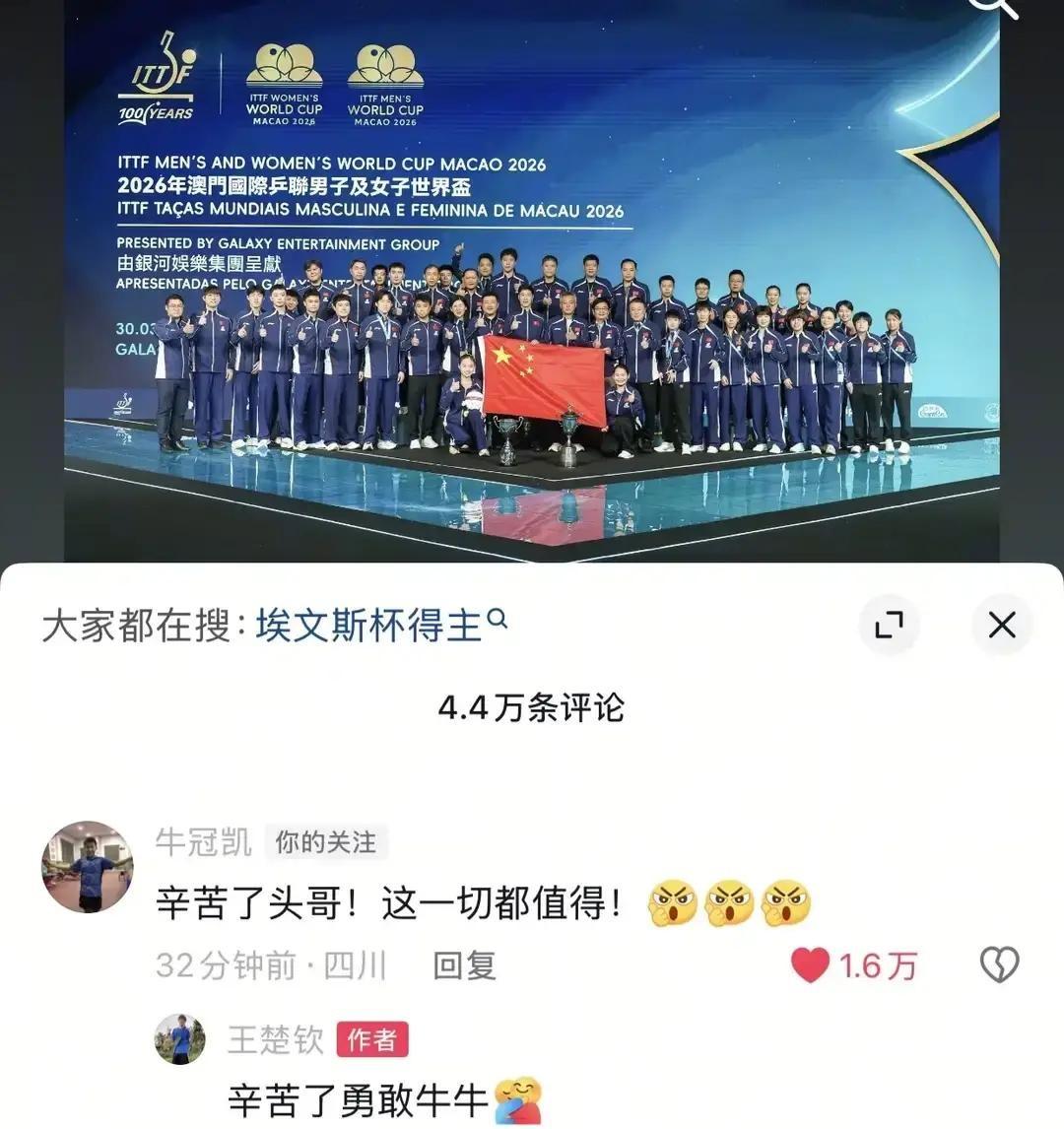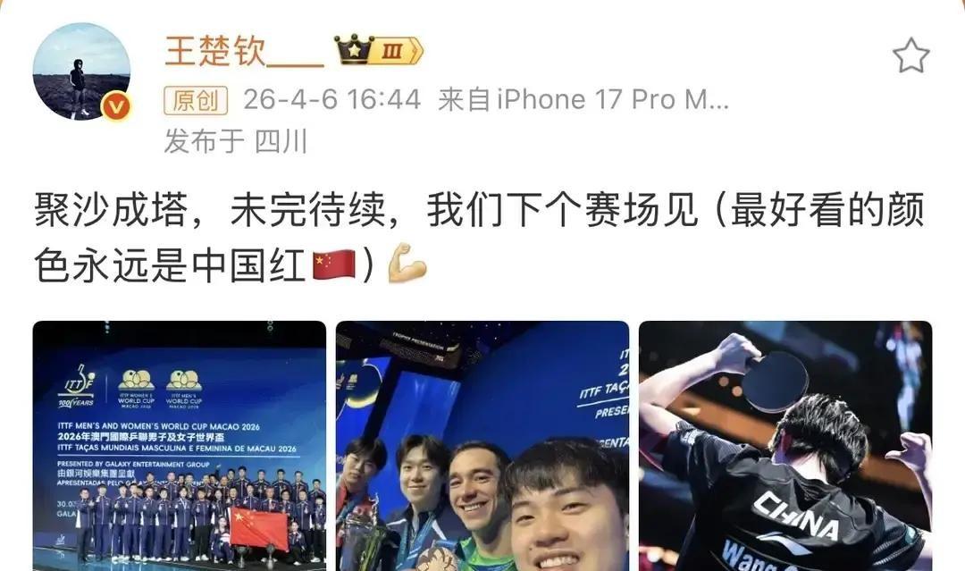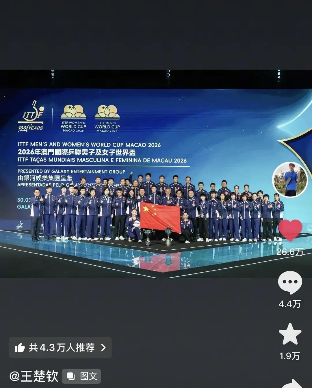 王楚钦成都晒动态,许昕一句话戳破孙颖莎合照细节笑翻网友 刚刷到王楚钦抵达成都后更新的社交动态,国乒老大哥许昕直接在线调侃,王楚钦也乖乖接话互动,氛围太有意思。还有队友牛牛关心他赶行程累不累,大头也热情给了回复,看得出来队内关系真的很轻松松弛。 最戳笑点的还是王楚钦无意中提的合照小细节:这次同框里孙颖莎根本没准备好,就被按下了快门。这个小细节放出来,瞬间引发网友调侃,谁能不爱看国乒这种接地气的日常互动啊。