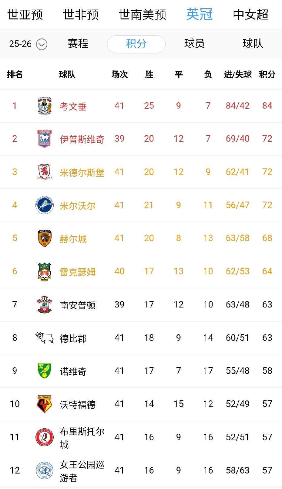 谁能想到英冠领头羊竟然0-0被逼平!第41轮考文垂仅仅收获1分,比第三的米尔沃尔领先12分,未能提前锁定直升英超名额。 联赛还剩5轮,下一轮考文垂大概率能锁定。另一个直升名额在伊普斯维奇、米尔沃尔、米堡中产生,三队目前积分相同,不过伊普斯维奇少赛两场。
