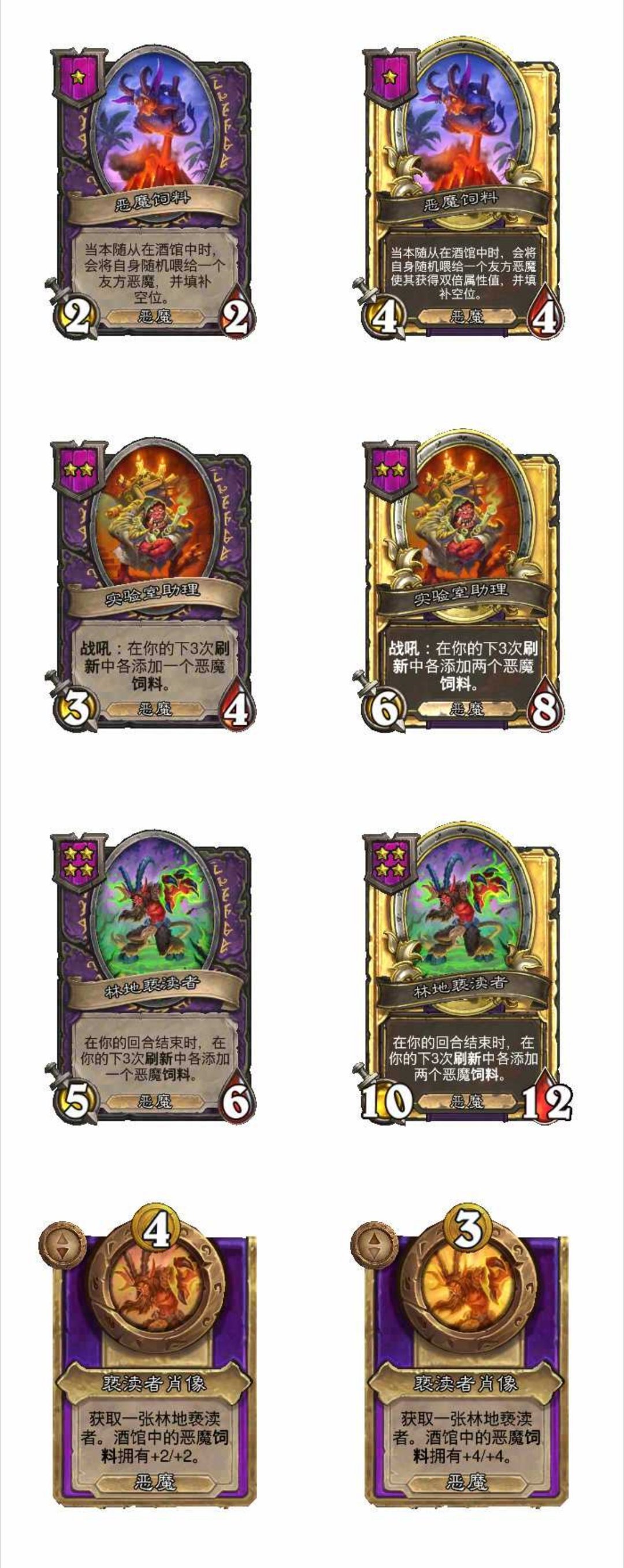 带有“饲料”关键词的随从会被加入你的专属随从池。每当你刷新酒馆并出现饲料随从时,一个饥肠辘辘的友方恶魔便会将其吞噬,获得其属性值,并重新填补该酒馆栏位。