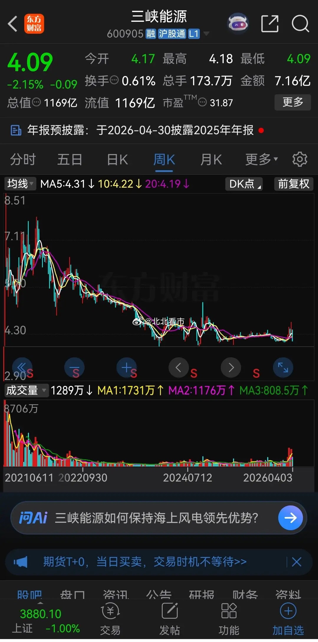 2024年924行情前,三峡能源股价最低3.94元,当时大盘是2689点,最近大盘虽然下跌了不少,但仍然在3880点,而三峡能源的股价距新低价只有一毛多钱了,这五年来进场的股民几乎全部被套牢,你说持仓的股民有多难受吧!