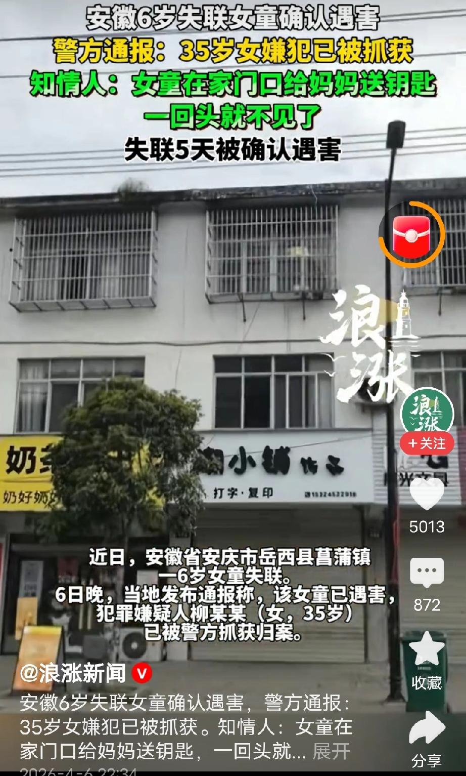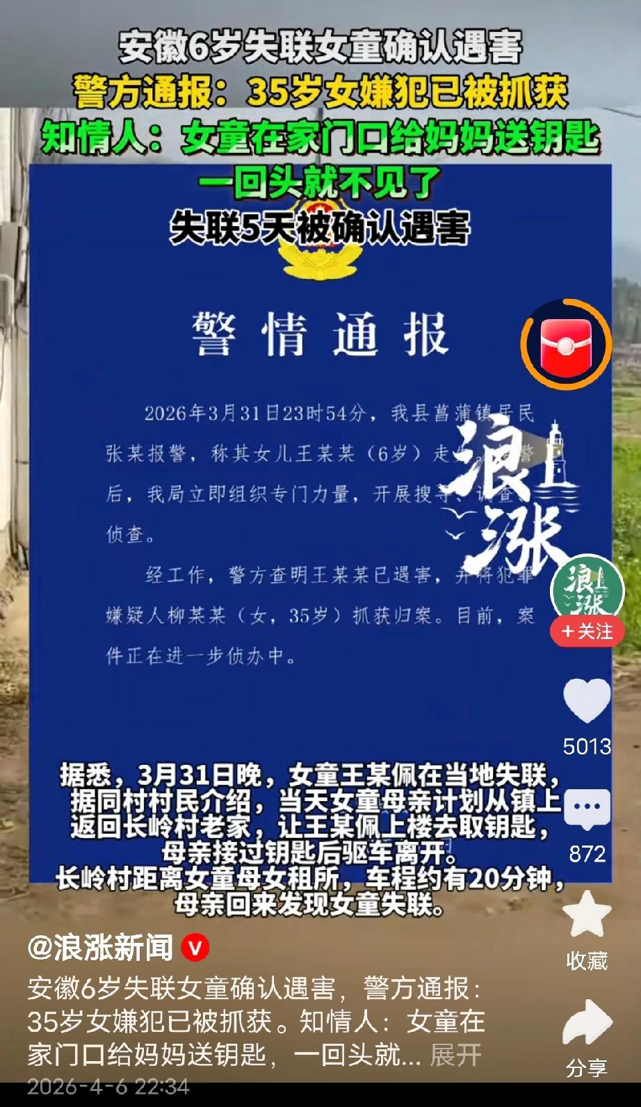 安徽岳西,6岁女孩给妈妈下楼送钥匙后迟迟不回家,家属多方寻找,都没找到,报警处理。警方全力搜寻侦查,一周后通报:孩子已遇害,嫌疑人是35岁女子,目前已被抓。案件引发全网关注:成年人矛盾伤及无辜孩童,令人痛心,期待法律严惩。 3月31日晚上8点多,王先生6岁的女儿甜甜下楼给妈妈送钥匙,20多分后,妈妈回家,发现甜甜并没回家。 一开始家人以为孩子贪玩跟别的小朋友去玩了,就在村子里找。 可是他们找了一圈,没有孩子的踪影,为了尽快找到孩子,王家人开始发动更多的人扩大范围找。 可每一个角落,每一位认识孩子的小朋友都问过了,都没有孩子的下落。 王家人急得焦头烂额,也开始担心孩子的安危,4个小时后迫不得已,寻求警方帮助,报警处理。 警方介入后,发动警力全力搜查,可是几天过去了依然没有结果。 直到昨天,4月6号,警方发出通报,孩子已经遇害,嫌疑人柳某某已被抓。 笔者特地去网上搜索,有消息称,此前柳某某的孩子霸凌女童姐姐,王家人报警了,柳某某气愤不已,事后打了女童的姐姐,王家人再次报警,柳某某更加气,最终才对6岁女童下手。 虽然网上有这么一段传言,但是具体原因还得等官方通报。 不过,不管什么原因,孩子不在了是事实,6岁的孩子,像初升的太阳,像含苞待放的花蕊,如果因为成年人的矛盾被无辜伤到,实在令人惋惜。 有网友翻出了柳某某的社交账号,她的账号里,记录的都是她跟孩子互动的生活日常,看起来有爱又有耐心。 可她怎么忍心这么对别人的孩子?你的孩子是宝贝,人家的孩子就不是心头肉了吗? 同为母亲,她应该更懂得守护好孩子的意义,却因为一时的怨恨,把恶意对准了一个没有一点反抗之力的年幼孩子,实在让人无法理解,也没办法原谅。 孩子之间的小摩擦,本可以好好沟通、理性解决,即便是有了矛盾,也不该由成年人用极端方式报复,更不该牵连无辜的小孩。 一条鲜活的小生命就此消失,一个家庭从此陷入无尽的痛苦,这是多少钱、多少后悔都换不回来的。 无论网传的起因是否属实,伤害一条幼小的生命,都已经突破了做人的底线,也触犯了法律的红线。 只希望后续法律能给出公正严肃的判决,也愿这样的悲剧不再重演,每个孩子都能平安长大,被世界温柔以待。 如果柳某某是因孩子纠纷报复而故意杀害6岁女童,就触犯了《刑法》第232条故意杀 人罪,该条规定故意杀 人的处死刑、无期徒刑或者十年以上有期徒刑,情节较轻的处三年以上十年以下有期徒刑。 结合本案来看,如果柳某某是因孩子纠纷报复而故意杀害6岁女童,这种行为性质十分恶劣。 对一个毫无反抗能力的小孩子下手,不仅让一个家庭承受了永远无法弥补的伤痛,也对社会造成了很不好的影响,按照相关法律规定,这种情况通常会在较重的量刑幅度内进行处罚,会依法受到严厉的制裁。 如果柳某某是因对方报警而蓄意报复伤人害命,还涉及《刑法》第293条寻衅滋事罪。 该条规定随意殴打他人、情节恶劣,破坏社会秩序的处五年以下有期徒刑、拘役或者管制。 如果柳某某是因对方报警而蓄意报复伤人害命,她先是殴打女童姐姐,又对年幼的妹妹下狠手,行为连续且针对未成年人,情节十分恶劣。 在法律裁量上也会从严考量,不管最终的动机是否和网上传言一致,伤害无辜孩童的行为都严重违背法律与道德,司法机关一定会根据事实和法律,做出公正严肃的判决,以此维护法律尊严,告慰逝去的小生命。 最后: 生活里难免有矛盾和争执,但再大的怨气,也不该拿无辜的孩子撒气。 孩子是家庭的希望,更是社会需要用心守护的未来,遇事多一份冷静,少一份冲动,多一点沟通,少一点极端,才是成年人该有的担当。 希望每个孩子都能在平安中长大,希望类似的悲剧永远不再发生,也希望法律的公正能抚慰受伤的家庭,守护好我们身边每一份纯真与美好。
