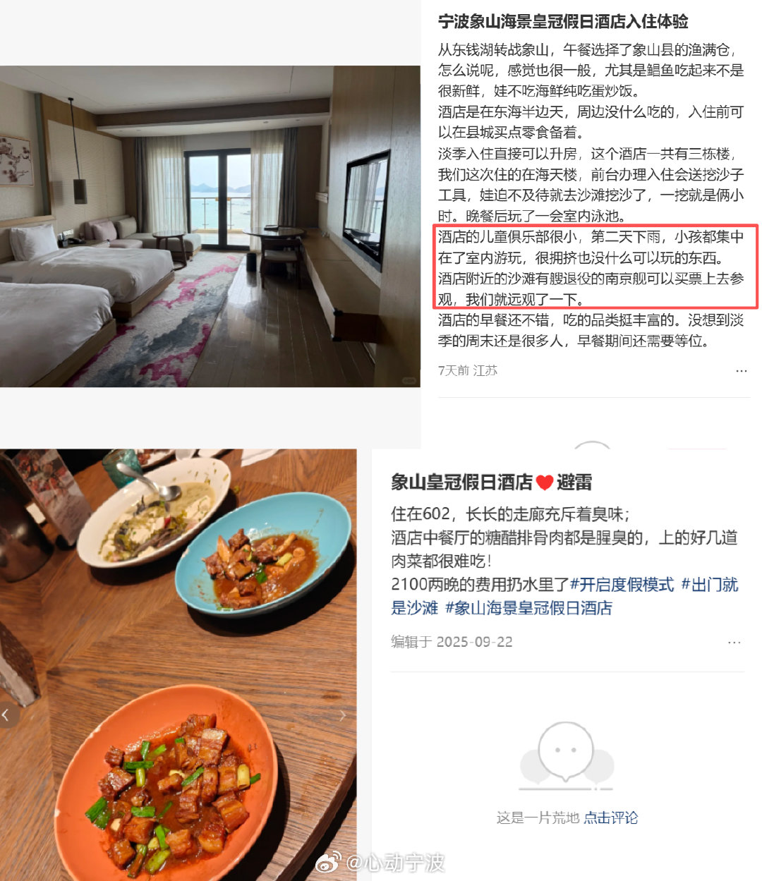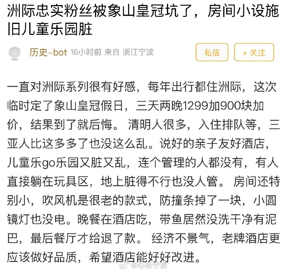 宁波象山皇冠假日酒店入住体验太踩雷 2026年清明假期,有网友吐槽入住宁波象山海景皇冠假日酒店体验极差。该酒店为洲际旗下五星级酒店,位于东海半边山度假区,2016年开业。