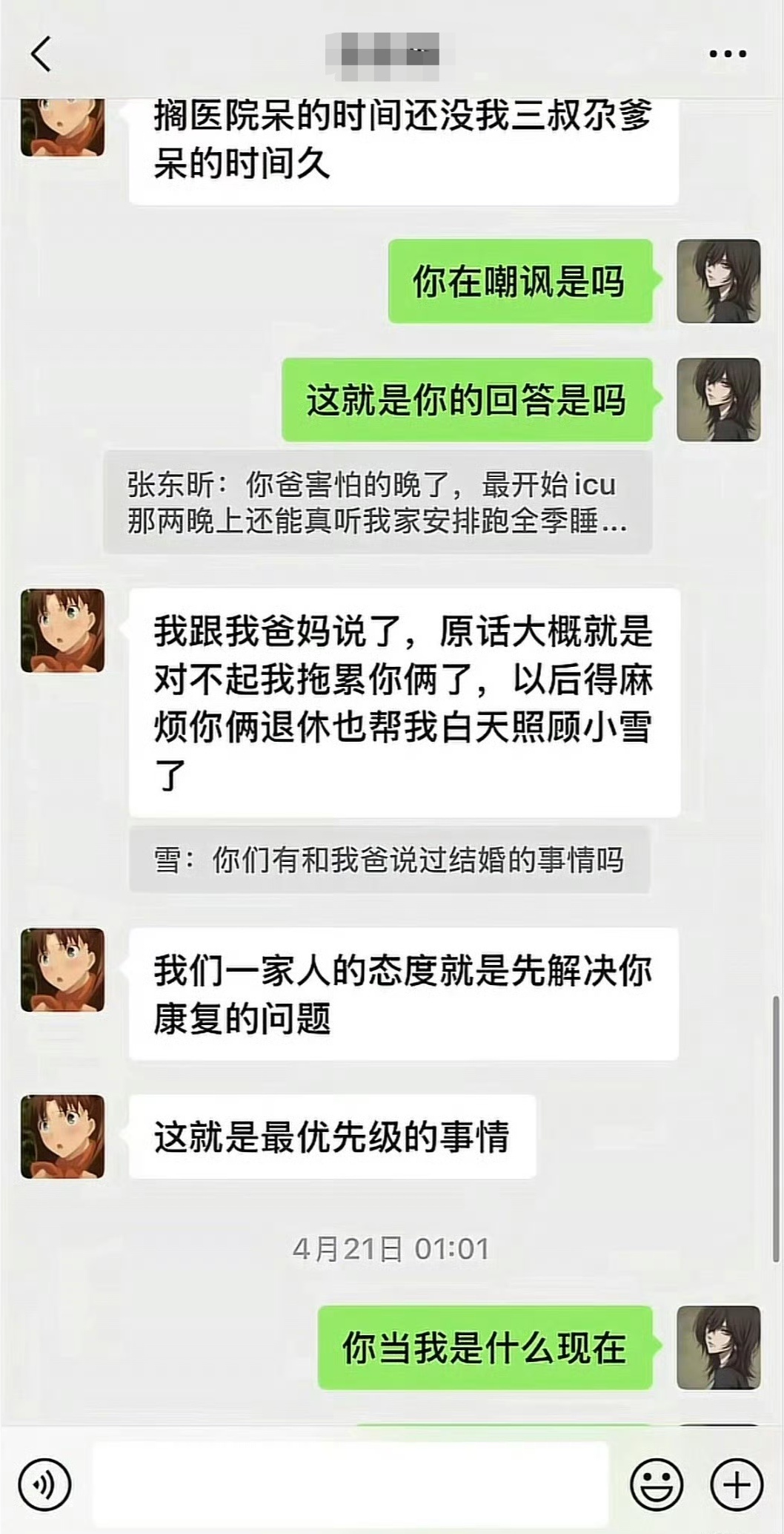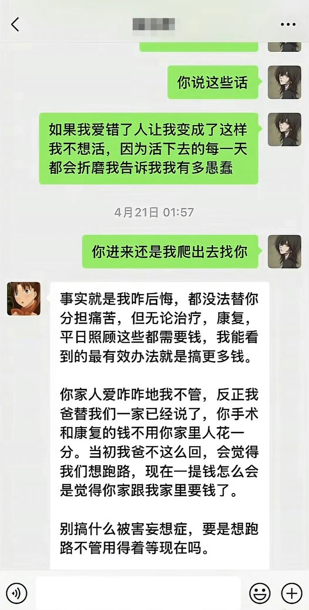 然而,白女士不仅没有丝毫感恩,反而当面辱骂悉心照顾她的长辈,态度恶劣。更过分的是,白女士家人还跑到男友父亲和男友的工作单位无理取闹,严重扰乱两人正常工作,最终导致父子俩双双丢了工作,生活陷入困境。从白女士发出的聊天截图也能证实,事发初期男友一家始终积极配合,全程照料、承担医疗开销,从未有过逃避的想法,只是白女士一味发泄负面情绪,无休止地纠缠闹事,丝毫不顾及对方的付出与难处。