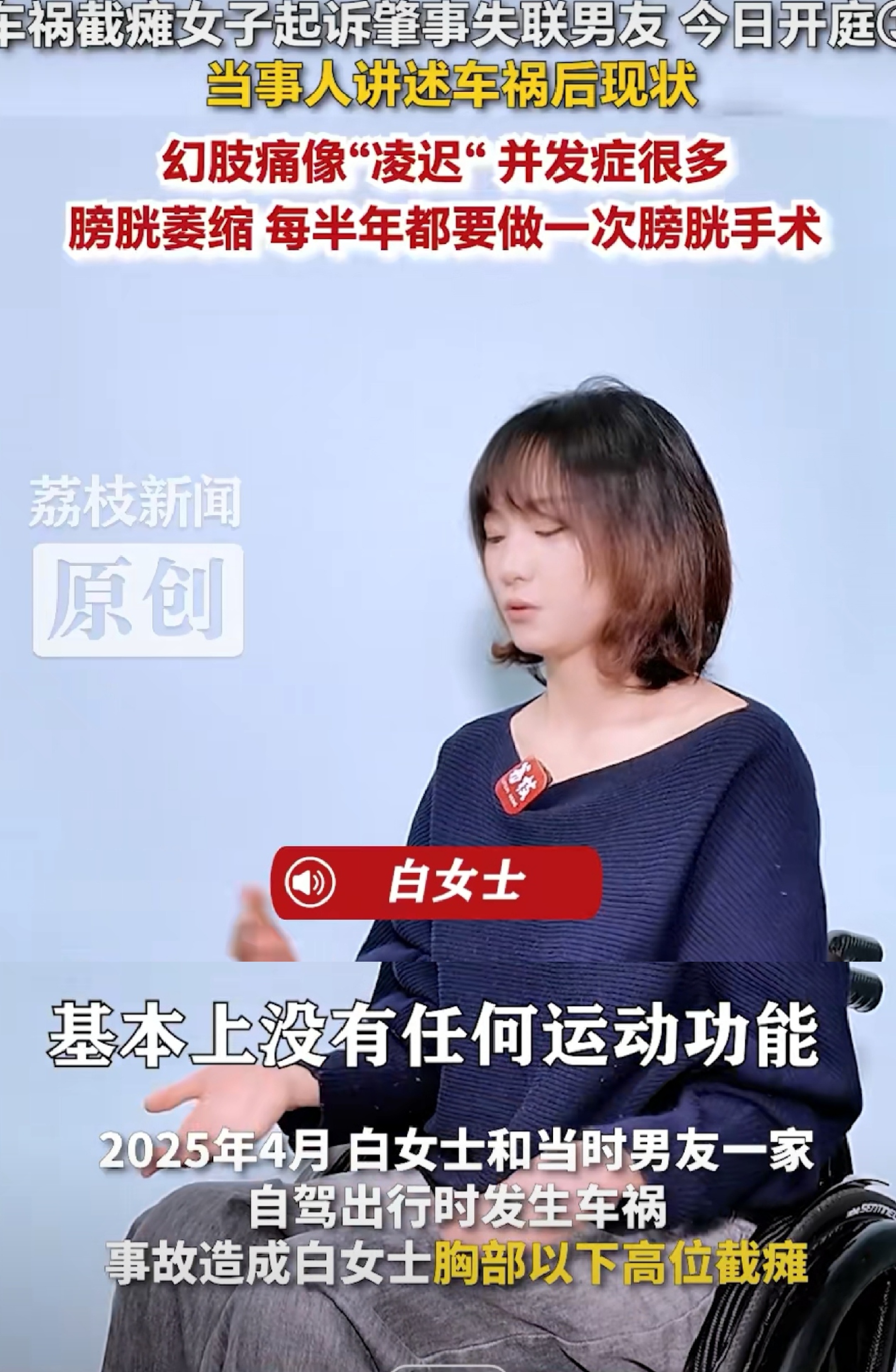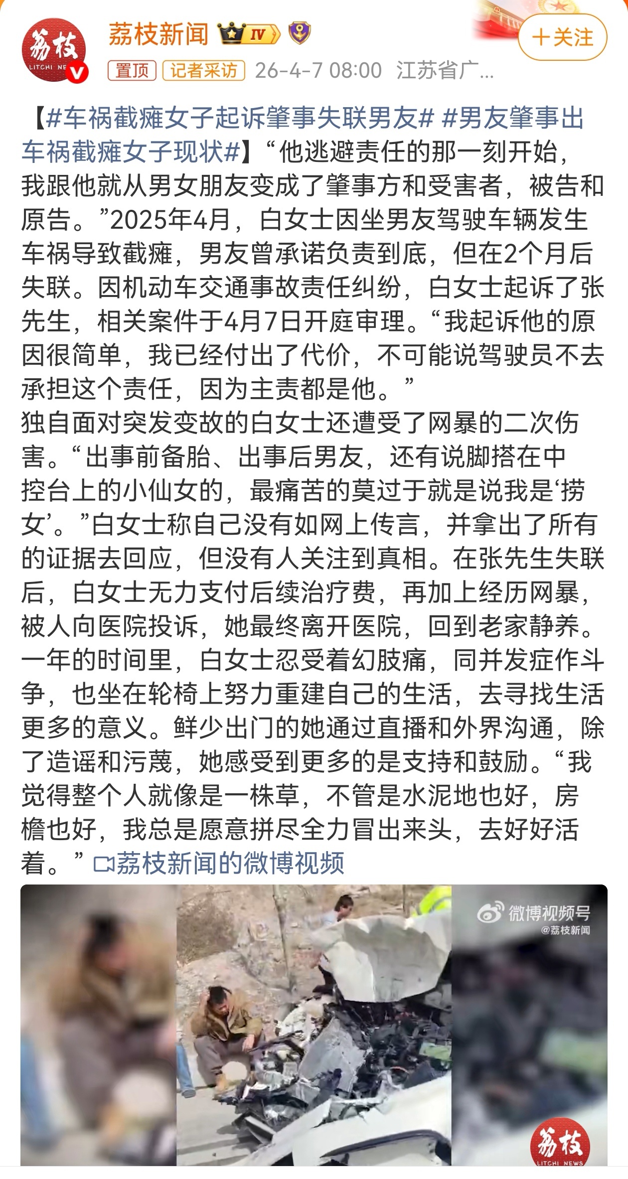 当事人白女士在车祸导致截瘫后,迅速将自己打造成被男友抛弃的可怜受害者。她先是在社交媒体置顶与男友的合照,大肆宣扬两人的甜蜜爱情故事,塑造出遭遇变故、被爱人背弃的悲情形象,博取全网同情。