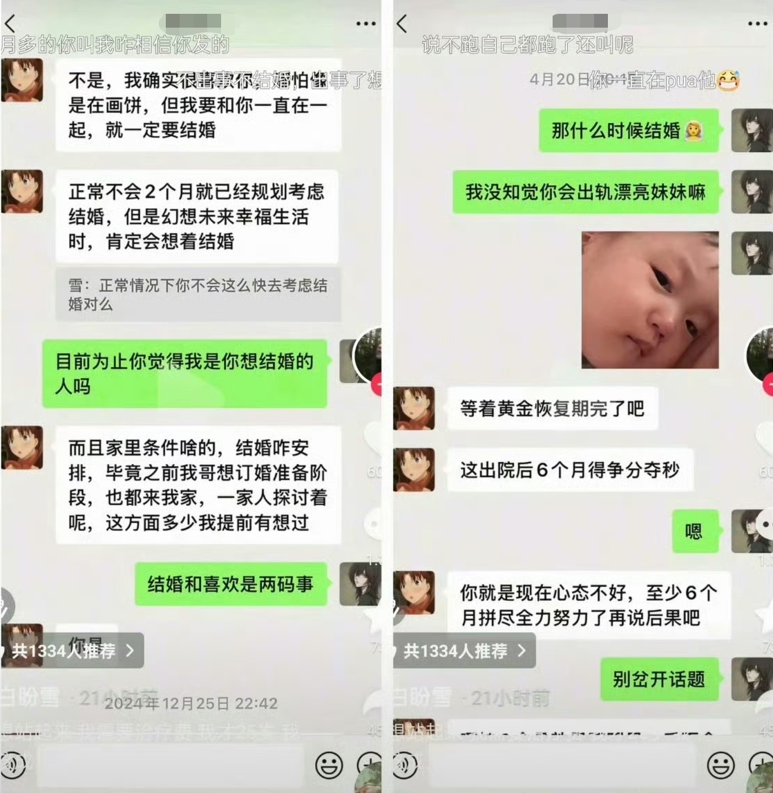 可网友深挖后发现,白女士在车祸发生前,社交平台全程维持“单身人设”,从未发布过任何与男友相关的内容,刻意隐瞒恋爱状态,与出事之后急着绑定男友、打造深情情侣的模样,事故前后的反差表现,让人不禁质疑白女士的动机。出事之前,男友曾多次主动提及结婚,认真规划两人的未来,可白女士却明确表示“结婚和喜欢是两码事”,态度敷衍,丝毫没有步入婚姻的打算,可见其彼时并未将这段感情放在心上。