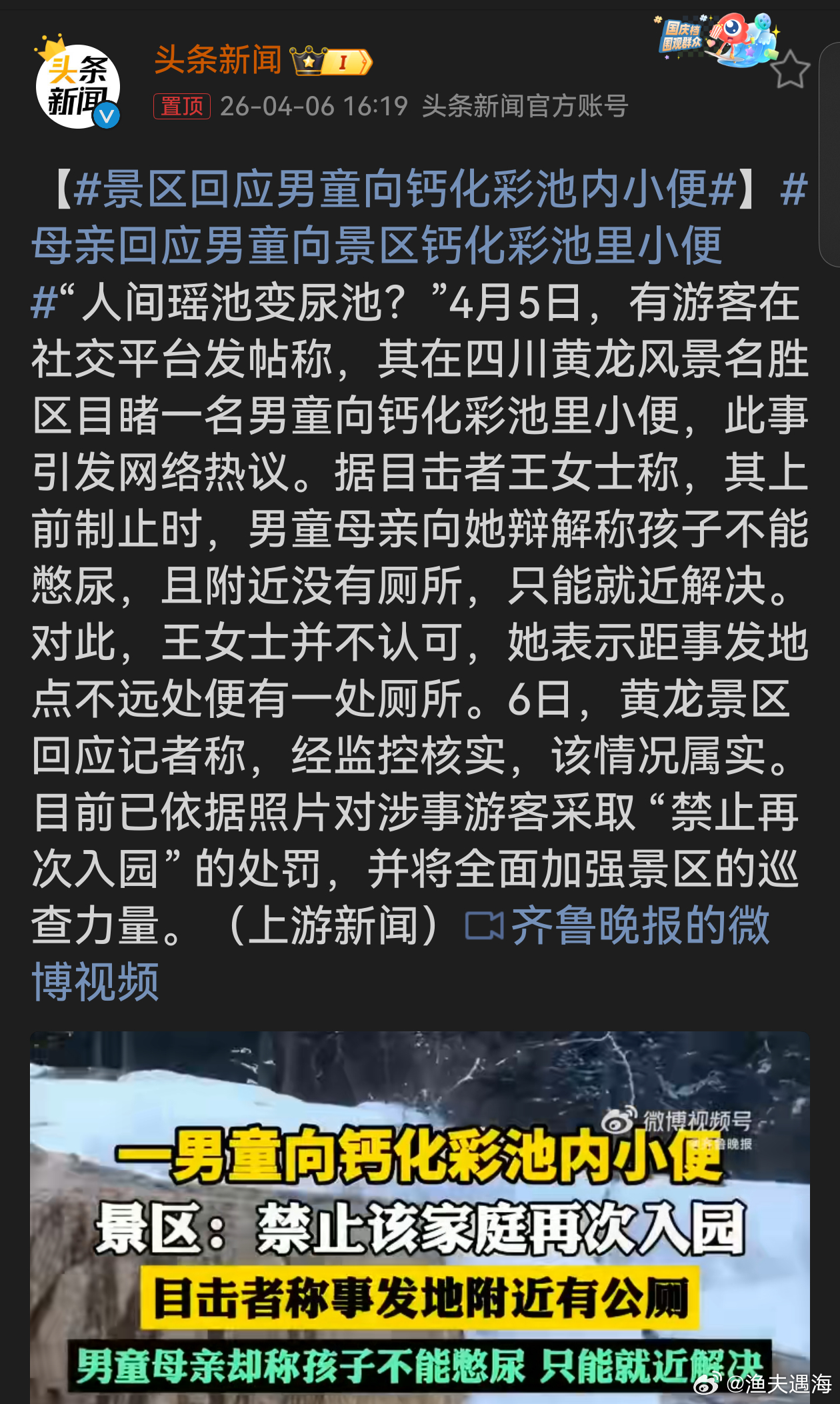 母亲回应男童向景区钙化彩池里小便男童向钙化彩池小便,母亲的辩解苍白无力,这不仅是不文明行为,更反映出规则意识的缺失。景区及时核实情况并作出处罚,加强巡查,值得肯定。每个人都应自觉保护公共环境,遵守景区规定,共同维护旅游的美好体验。
