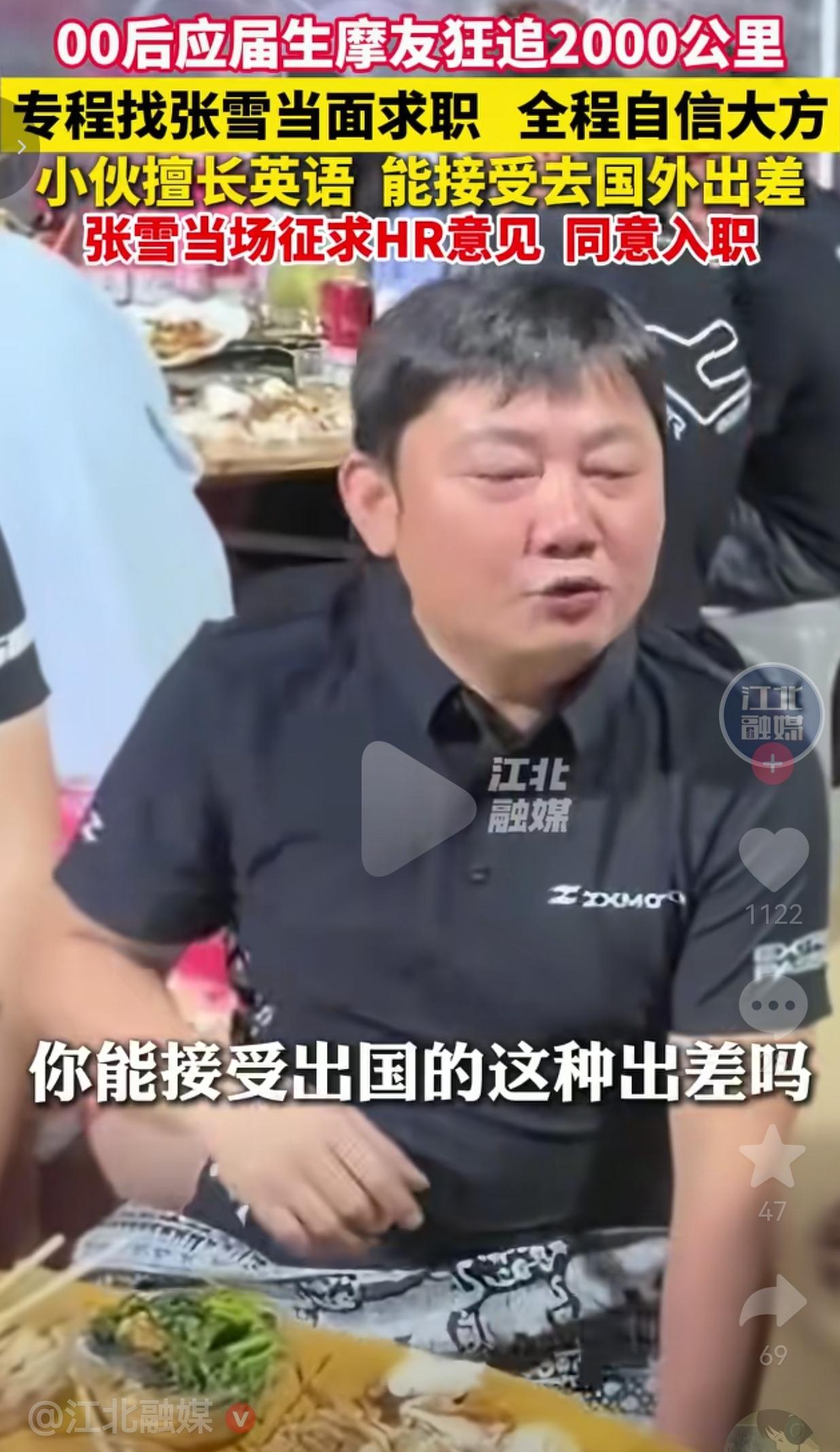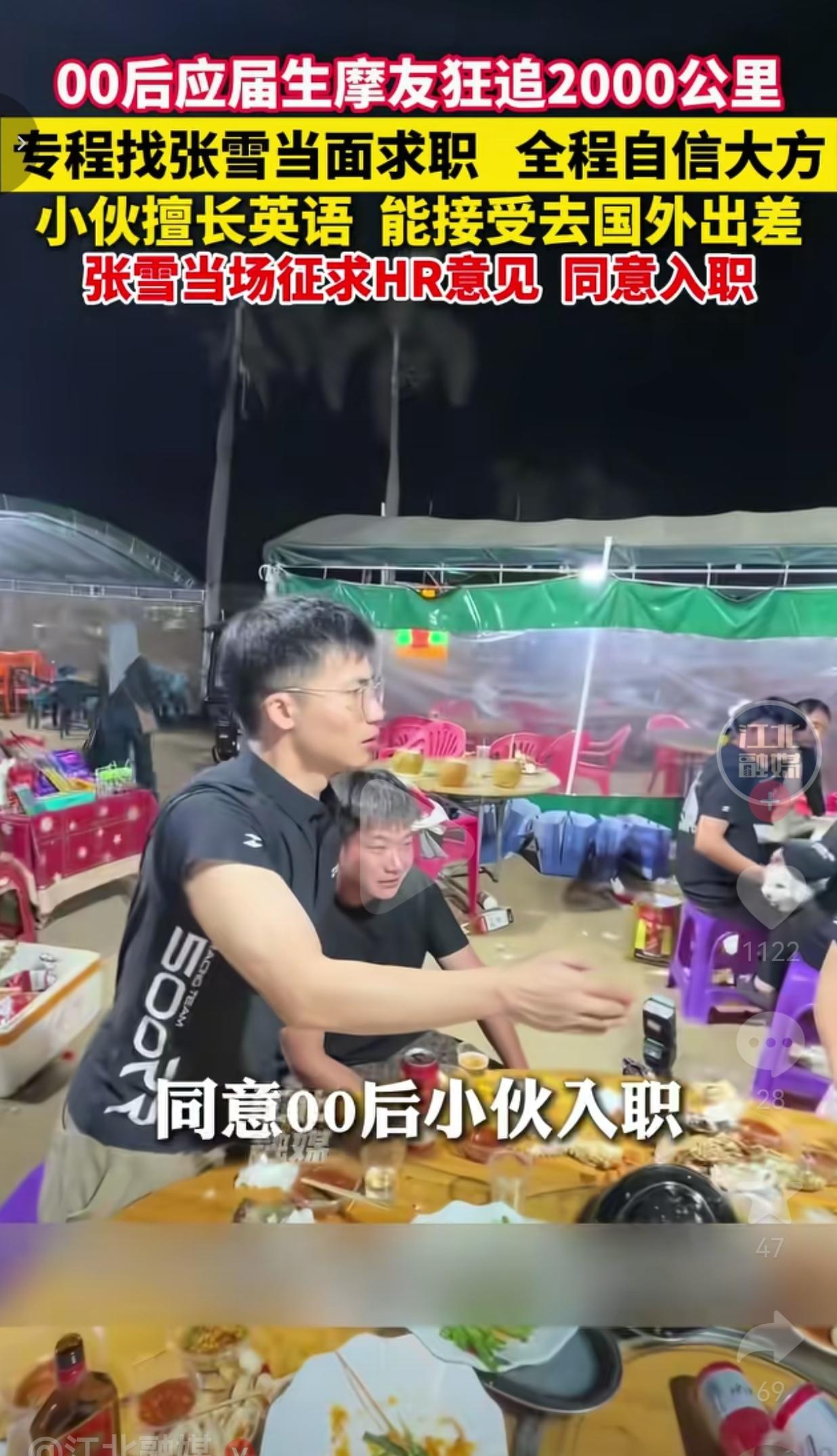 太羡慕了!这才是00后找工作的天花板!一个00后应届毕业生,骑摩托狂追2000公里,直接堵到张雪的夜市饭局上毛遂自荐,全程自信大方不怯场,张雪当场喊HR,直接录用! 4月7日,一名00后应届毕业生,穿着洗到发白的张雪机车工服,骑着摩托辗转2000公里,从外地一路追到海南,就为了当面给张雪递简历、求入职。 当时张雪正和团队在夜市吃夜宵,小伙直接走到桌前,没有丝毫怯场,不卑不亢地开口:“张总,我今年的愿望就是入职张雪机车!我是应届生,英语特别好,之前摩博会我还带过一波客户去参观工厂,全英文接待完全没问题!” 张雪当场就被这股冲劲打动了,直接开口问他:“你能接受出国的这种出差吗?” 小伙想都没想,斩钉截铁地回答:“完全能接受!我就喜欢全世界到处跑!” 全程眼神坚定,逻辑清晰,把自己的优势、能给公司带来的价值说得明明白白。 张雪当场就拍了板,转头就喊旁边的HR:“HR在那呢,这小伙子我要了!”HR当场征求意见后,直接拍板同意,小伙当场圆梦,成功入职! 网友看到后评论说:我直接看傻了!这才是找工作的正确打开方式!多少人投简历石沉大海,人家直接追2000公里堵老板,这勇气我给100分 也有的网友说:同样是00后,人家追2000公里入职,我投100份简历没人理!这差距,真的破防了! 还有的网友说:张雪这老板也太敞亮了!当场拍板录用,不搞虚的,就冲这魄力,这公司就差不了! 更有网友表示:这才是真正的热爱!为了进心仪的公司,骑摩托追2000公里,这股劲谁能不佩服? 要我说,这才是00后该有的样子!不内耗、不躺平、不玻璃心,想要什么就自己去争取!多少应届生找工作,投完简历就等着,被拒了就emo,就抱怨大环境不好,可人家呢?直接用脚投票,骑摩托追2000公里,把机会攥在自己手里! 有人说他“莽撞”“不懂规矩”?那你告诉我,什么叫规矩?能拿到结果的就是好规矩!职场不看你有多听话,看你有多想要、有多能拼! 更难得的是,他不是空有冲劲!人家英语好,能接国外出差,还做过客户接待,有真本事!不是瞎闹,是有备而来!2000公里的路程,是他的诚意,更是他的底气! 再看张雪,这才是真正的老板!不摆架子、不搞流程,当场识人、当场拍板,给年轻人机会!就冲这份魄力,张雪机车能火,真的不是没道理! 最戳我的是什么?是小伙身上那股“我命由我不由天”的劲!他用行动告诉所有应届生:机会不是等来的,是追来的!你不敢迈出那一步,就永远只能当旁观者! 这件事,从来都不是一个简单的“求职成功”的故事。 它是给所有躺平、内耗、迷茫的年轻人,最响亮的一记耳光,也是最热血的一针强心剂! 这个时代,从来都不缺有学历的人,缺的是有勇气、有冲劲、有执行力的人!你不敢追,就别怪机会溜走;你不敢闯,就别怪生活平庸! 00后已经用行动证明:想要的,就自己去拿! 最后,我想说的是:机会从来不会等你,你跑多快,未来就有多顺!敢闯敢拼,才是年轻人最牛的简历! 对此,你怎么看?