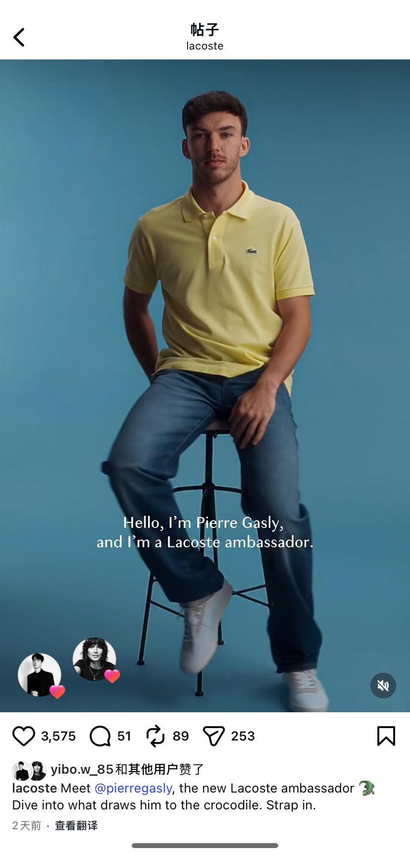 王一博点赞LACOSTE 官宣新品牌大使 Pierre Gasly 的贴子。加斯