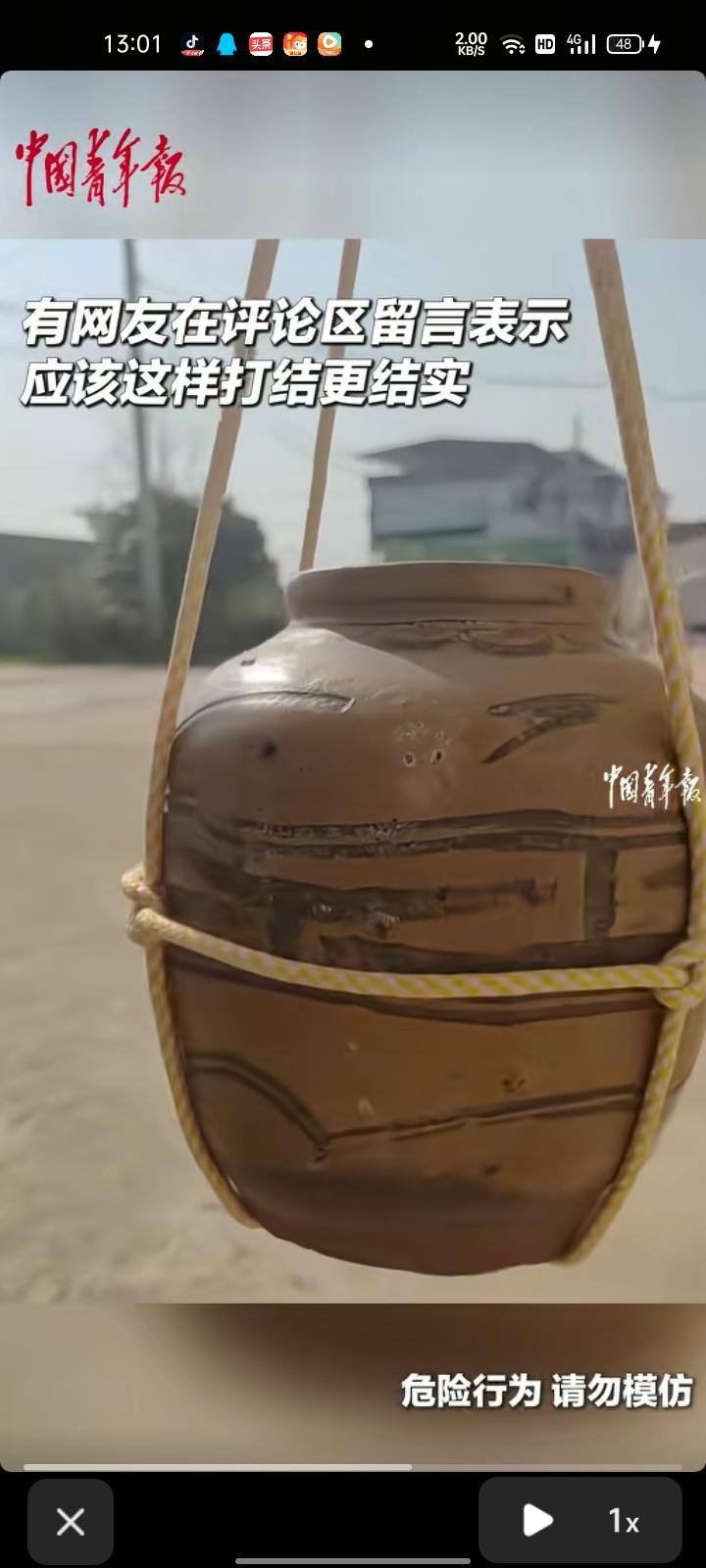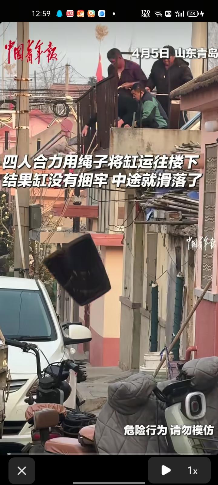 4月5日,山东青岛。四人合力用绳子把缸运到楼下,结果缸没捆牢,中途滑落到地,碎了。这缸的成本不高,没砸到周围的车辆。 有网友在评论区留言表示,用十字吊结法吊缸更牢靠。