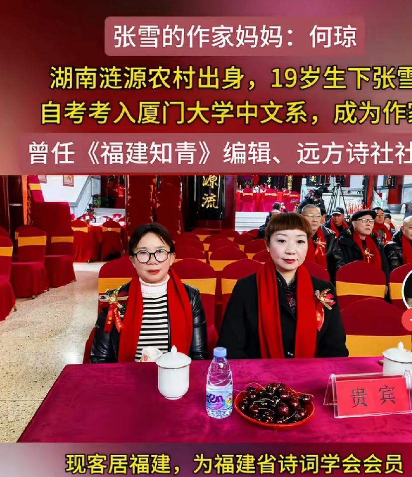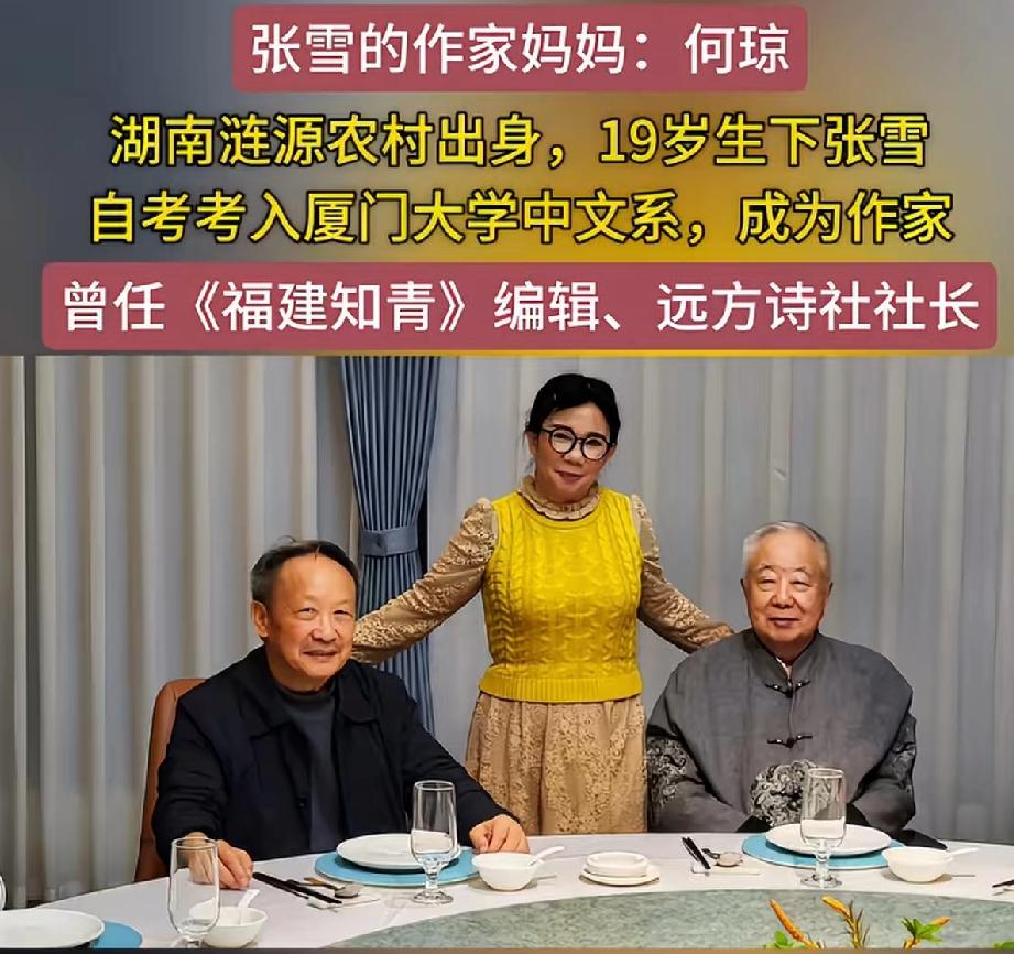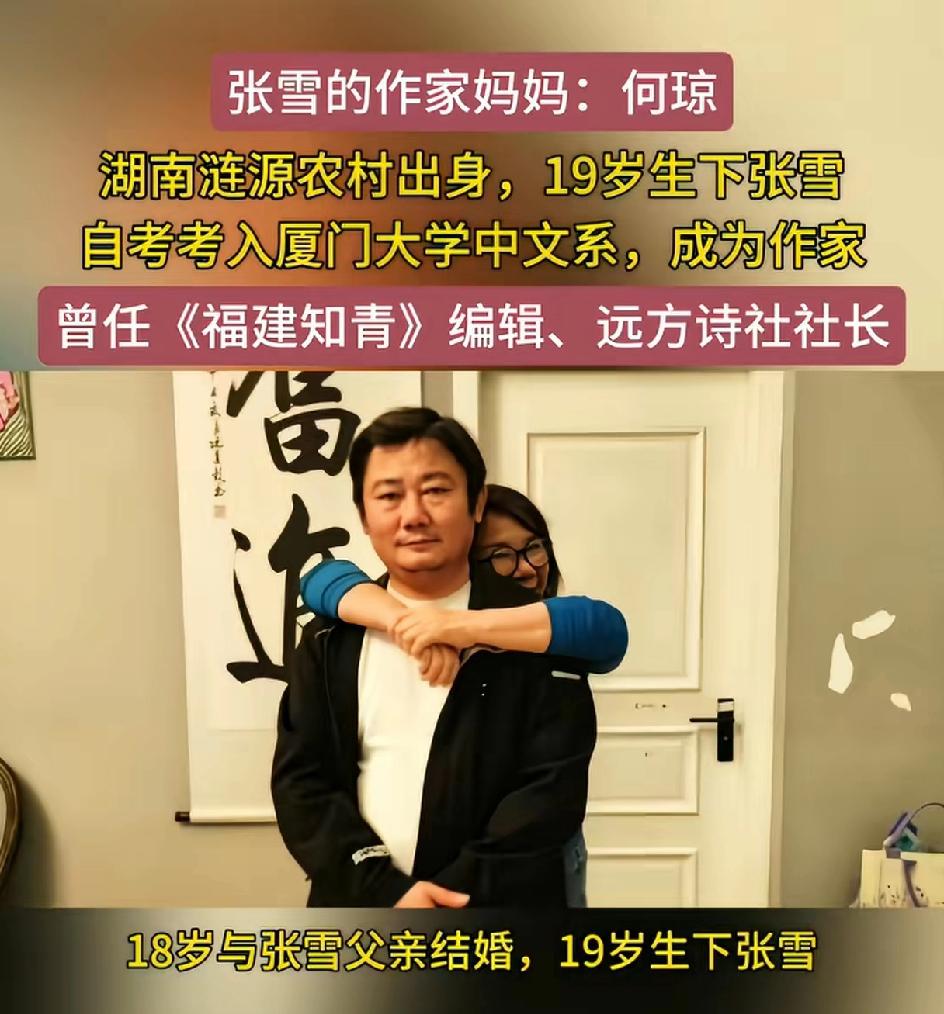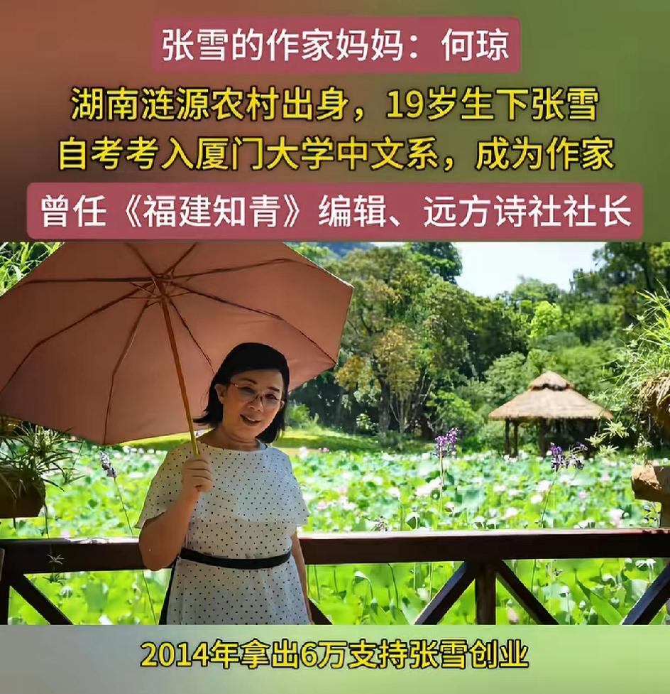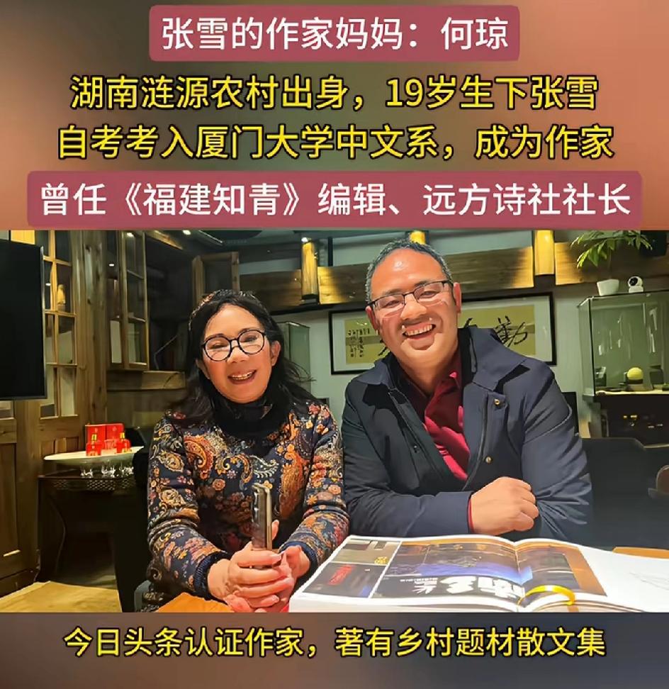 张雪的作家妈妈何琼女士,也是一位“我命由我不由天”的女性。她的儿子也秉承了她的个性。何琼今年58岁,18岁结婚,19岁生子。后来到了福建,通过自考取得厦门大学中文系的学历。还当上了远方诗社的社长,出了诗集和散文集,成为女作家。这对于其他湖南山村60年代的普通妇女来说简直是无法想象的事。张雪的故事很励志,他母亲的人生也很励志,他们都是一样的人。就像马斯克和他的母亲一样。