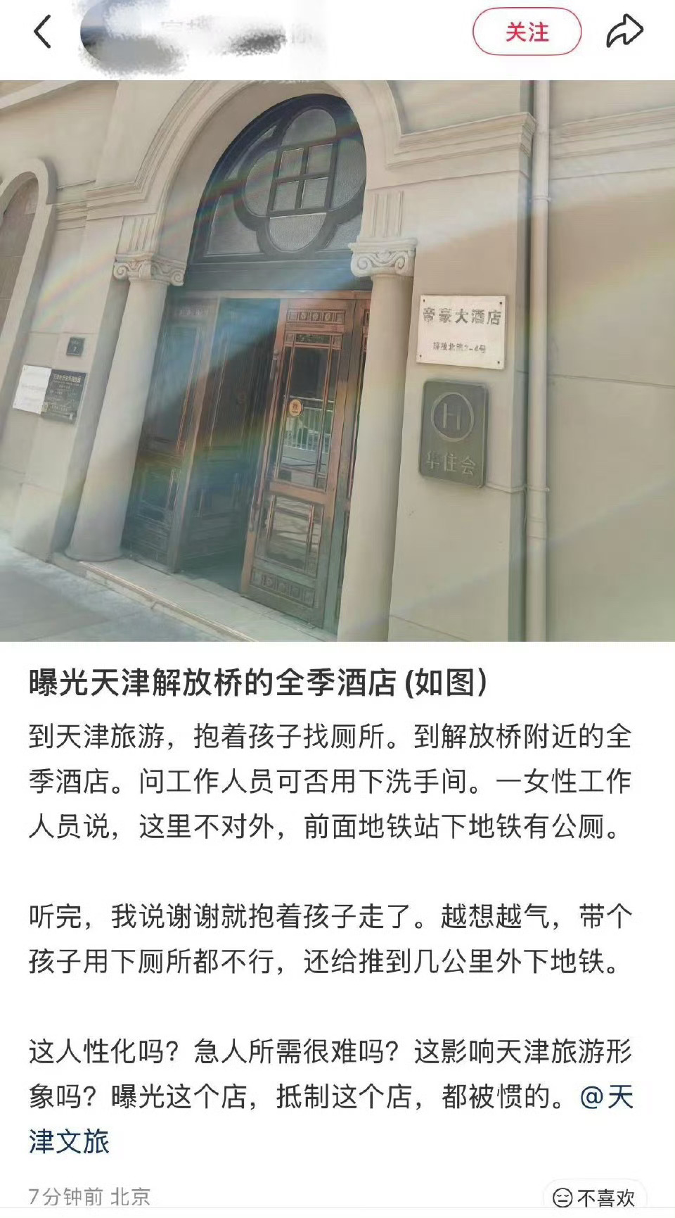 今天看到这家卫生间的牌子想起来前两天天津全季酒店卫生间被“曝光”人家不让你用卫生间,没必要曝光人家~让你用是好心,不让你用也没毛病