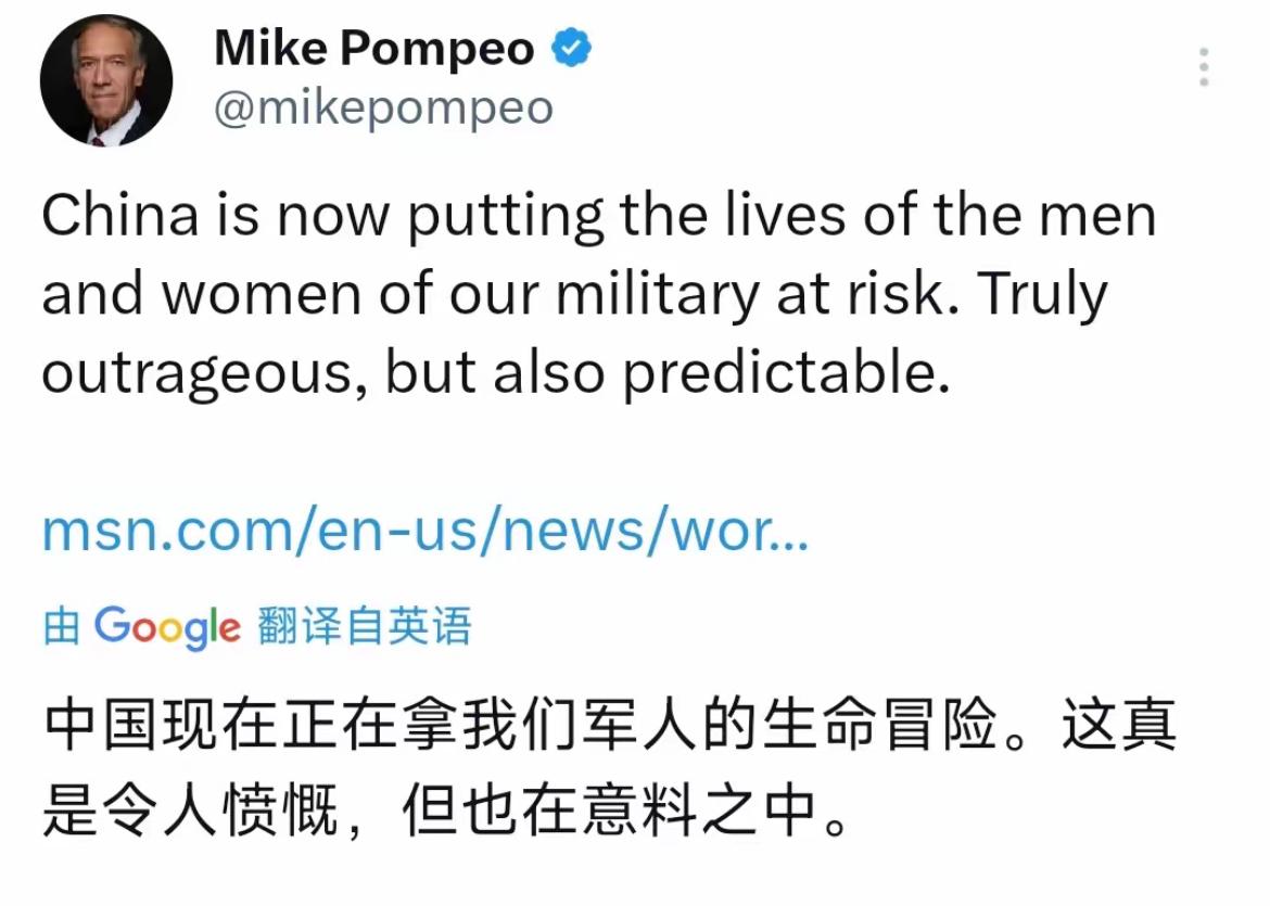 美国前国务卿蓬佩奥今天(北京时间4月7日)发文写道:“中国现在正在拿我们军人的生命冒险。这真是令人愤慨,但也在意料之中。” 喷几句:[比心]近期中美两军刚完成海上军事安全磋商,持续落实海空相遇安全准则,一线沟通保持畅通,美方高频抵近侦察才是风险源头,相关言论无任何实证支撑。此类表述是典型的政治操弄,刻意颠倒责任、制造对立,忽视中美军事沟通的务实成果,本质是借抹黑中国博取舆论关注。