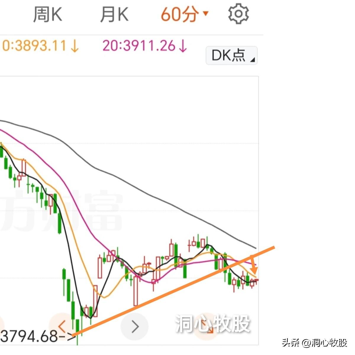 从大盘走势来看,今天反弹最高点达3902点,没有过上周五阴线的一半3903点,视为弱!离这次反弹趋势线还较远。