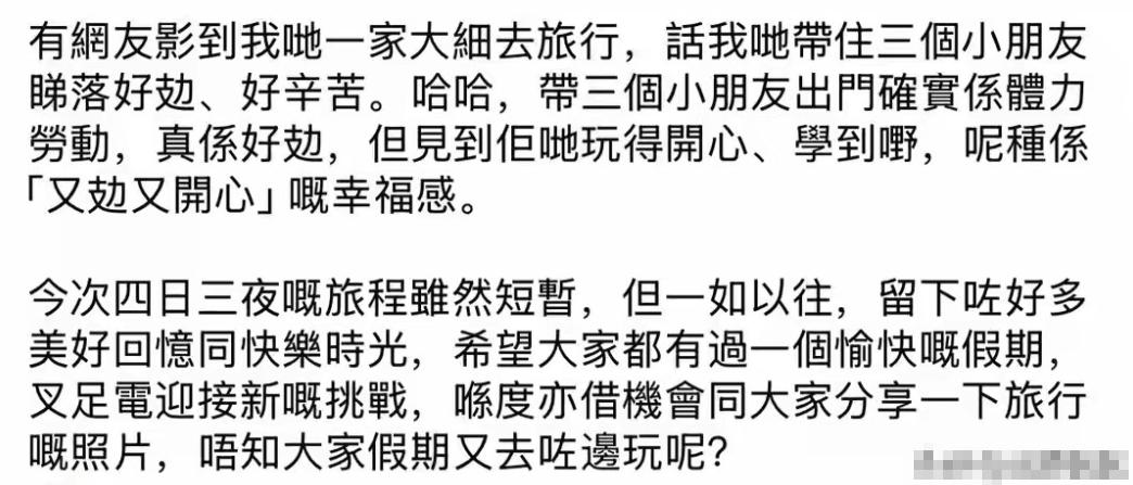 霍启刚,高调发文! 4月7日,霍启刚突然在香港社媒高调发文,他大方公开分享了多张全家在广西旅游的照片,画面十分的幸福珍贵。   很多人不知道,这段看似轻松的三日深度亲子游,背后藏着霍启刚独自带娃的辛苦。   2026年清明假期,香港学校放假,霍启刚原本计划带着三个儿女好好放松,郭晶晶因要全力备战巴黎奥运会裁判工作,仅参与了部分行程,网传她缺席是忙于带小女儿避暑,其实是在为自己的事业全力冲刺。   从奥运跳水冠军到国际泳联裁判长,郭晶晶用了整整二十年,这份坚持值得所有人敬佩,而霍启刚则默默扛起家庭重担,独自带着三个孩子完成了这段旅程,全程没有保镖和保姆陪同,活脱脱一个普通又尽责的父亲。   让人揪心的是,这份简单的亲子时光,却屡屡被打扰。   霍启刚一家此次出游特意没有带安保,只想安安静静地散散步、陪陪孩子,可一路上总有人举着手机跟拍,严重影响了他们的出行体验。   这并不是霍启刚第一次被这样打扰,去年三月香港展会,有人强行搂着他拍照,他当即明确表明态度,合影可以,但不能碰他;去年十一月玉龙雪山,郭晶晶因工作未出席一场婚礼,网上就出现了各种不实猜测,忽略了她早已排满的工作行程。   霍家向来低调,孩子们的作业需要家长亲自检查,日常行程也从不随意乱发,可外界拍摄他们的频率,甚至比自家相册还要高,这实在让人无奈。   面对这样的困扰,网友们看法不一,有人支持霍启刚,认为每个人都有私人空间,即便身为公众人物,也有权享受不被打扰的家庭时光;也有人指责他摆架子,觉得豪门子弟不该如此“矫情”。   其实仔细想想,霍启刚的反抗,从来不是摆架子,而是为了守护家人的安宁,他挡镜头的那一下,和儿子抱起妹妹的举动本质上是一样的,一个守护家庭空间,一个守护兄妹温情。   更值得一提的是,目前法律上对偷拍行为的界定并不明确,部分偷拍行为甚至不算违法,再加上一些平台刻意推送“偶遇豪门”的标签博取流量,进一步加剧了这种乱象,这不仅困扰着霍启刚一家,也是很多公众人物共同的烦恼。   抛开这些困扰,霍启刚和郭晶晶的育儿方式,一直被很多人认可。   他们身为豪门,却从没有溺爱孩子,反而一直坚持朴素的教育理念。   郭晶晶自己生活十分节俭,扎着五毛钱一根的头绳,背着几百块的帆布包,逛平价超市,给孩子买打折童装,而霍启刚名下仅收租物业就有二十八处,遍布香港、内地和海外,他们不是没钱,而是明白,给孩子金山银山,不如教他们立身之本。   他们会在周末带着孩子素颜爬山,郭晶晶陪着孩子们观察植物昆虫,培养他们的好奇心; 2024年,他们带着三个孩子下田插秧,烈日当头,一家五口踩在泥水里,没有半点豪门架子,郭晶晶还当场教孩子背诵“谁知盘中餐,粒粒皆辛苦”,让他们懂得珍惜粮食; 2020年元旦,霍启刚更是让孩子们通过劳动赚取零花钱,妹妹年纪小,就洗车换零食,哥哥则通过洗碗、倒垃圾赚钱,让他们从小就明白,钱不是大风刮来的,幸福要靠自己争取。   平日里,孩子们上下学、逛商场、坐地铁,也从没有保姆和保镖陪同,和普通家庭的孩子一样,过着平凡的生活。   很多人只看到霍启刚带娃的辛苦,却忽略了他兼顾家庭与工作的担当。   作为人大代表,他积极履行职责,曾提出关于香港回归庆典的建议;在生活中,他始终保持亲民作风,去年带娃去山西出游,也延续着这份朴素,从不刻意摆豪门排场。   他和郭晶晶之间,没有豪门婚姻的算计,只有彼此互补的默契,郭晶晶专注事业冲刺,他就在家里稳稳兜底,郭晶晶出差时,他一个人包揽了辅导作业、照顾孩子吃喝、哄睡陪玩所有事情,即便疲惫不堪,也从没有抱怨过。   霍启刚参与马拉松时,会特意给妻子拍照,这些小细节,藏着最真挚的温情。   霍启刚用自己的行动告诉我们,豪门的底色从来不是金碧辉煌,而是责任、担当与教养,而他和郭晶晶,只是用心做好了好好相爱、好好养娃这两件最普通的事,却活成了很多人羡慕的样子。   如果各位看官老爷们已经选择阅读了此文,麻烦您点一下关注,既方便您进行讨论和分享,又能给带来不一样的参与感,感谢各位看官老爷们的支持!