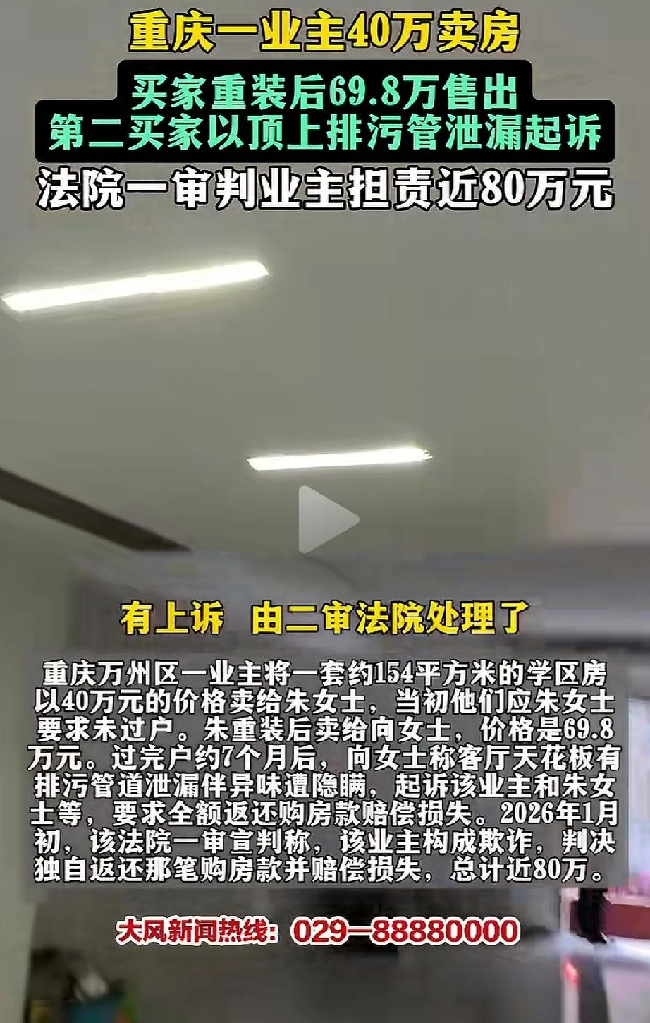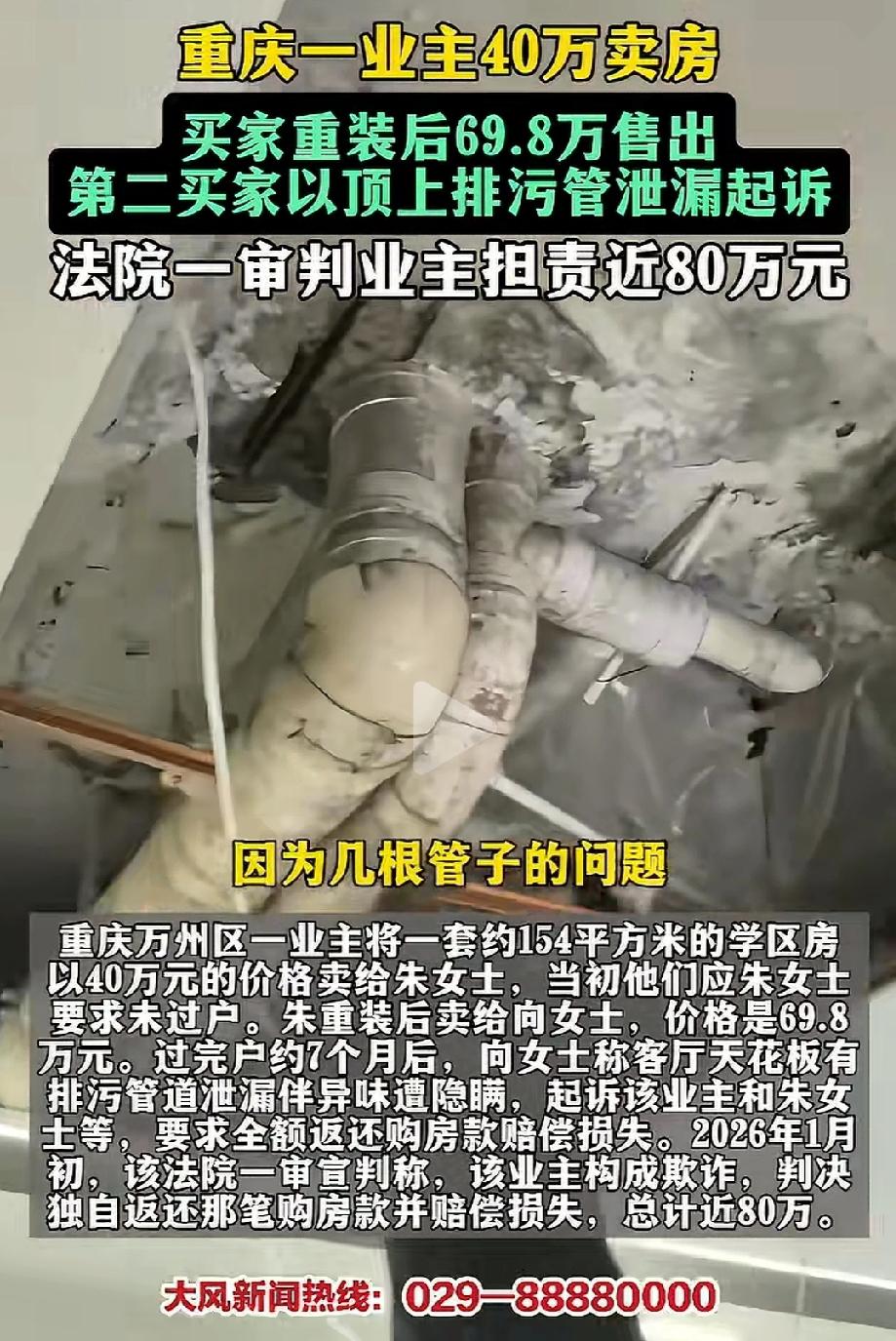 谁该负责?重庆万州,吴女士把一套154平方米的学区房,通过中介卖给了朱女士,价格40万,签了合同,但没有办过户。两个月后,朱女士把房子简单装修了一下,转手就以69.8万的价格卖给了向某。万万没想到,向某住进后发现客厅天花板排污管道泄漏,起诉索赔。法院一审判吴女士担责近80万! 2024年9月,吴女士把一套154平方米的学区房,通过中介卖给了朱女士,价格40万,签了合同,但没有办过户。 两个月后,朱女士把房子简单装修了一下,转手就以69.8万的价格卖给了向某。 注意,这次卖房是吴女士的家人委托朱女士去签的合同。也就是说,房子直接从吴女士名下过户给了向某,中间跳过了朱女士。 2025年7月,向某住进去后发现客厅天花板上有整栋楼的排污主管道,管道漏水、发臭,天花板都黑了。向某认为卖方隐瞒了这个大问题,于是起诉。 法院派人去现场看了,发现客厅天花板的排污管道又旧又脏,周围全是污渍,天花板都发黑了。而且管道外面包着塑料薄膜,明显是装修时故意遮住的。 2026年1月,万州区法院一审判决:吴女士一家返还向某购房款、利息、税费、中介费、律师费,加起来将近80万。 吴女士一家觉得很冤。首先,她自己根本不知道管道漏水这回事,房子是1998年建的老房子,管道是开发商设计的,她一个普通业主哪懂这些?她没有任何故意隐瞒。 卖房的房款从头到尾只拿到了40万,那69.8万里多出来的29.8万全被朱女士拿走了,法院却让她赔全部69.8万,这不是让她替朱女士背锅吗? 吴女士不服,2026年4月已经上诉到重庆二中院。目前案子还在等二审结果。 很多人看到这里都懵了:吴女士自己才拿到40万,凭什么要赔80万?我给大家拆解一下这里面的关键点。 朱女士用40万跟吴女士签了买房合同,但故意不过户。然后她花钱简单装修了一下,转手就找到买家向某,报价69.8万。朱女士请吴女士的家人做委托,由朱女士代替卖方跟向某签合同。 这样一来,朱女士净赚差价29.8万,另外还收了向某一万块中介费。等于两头赚钱,自己却不用当房主。 吴女士做错了什么?她老老实实卖房,40万虽然不算高,但也是你情我愿。她不懂管道漏不漏水,也没有故意瞒谁。 用吴女士自己的话说:“我房子才卖40万,法院判我赔80万,相当于我那套房子白给了,还得倒贴一套首付。”一个普通家庭,哪经得起这种折腾? 可朱女士呢?她知道管道有问题,不但不告诉买家,反而用装修把问题盖住。这不就是典型的“我知道有问题,我偏不说,我还包装一下卖高价”吗? 这种行为如果不严惩,反而让老实人赔得倾家荡产,那以后谁还敢卖房?谁还敢当委托人? 业主40万卖房 一审被判担责近80万