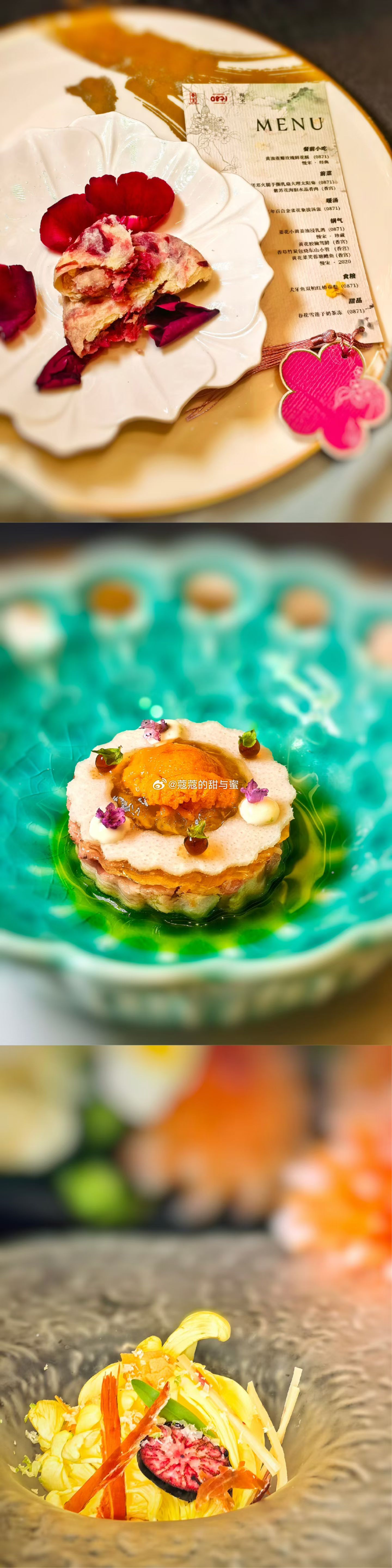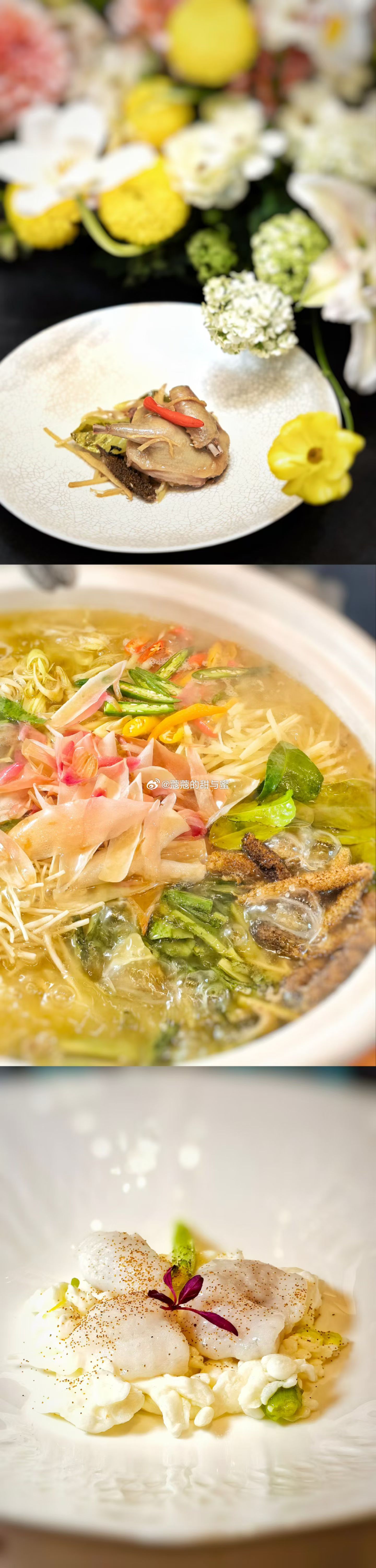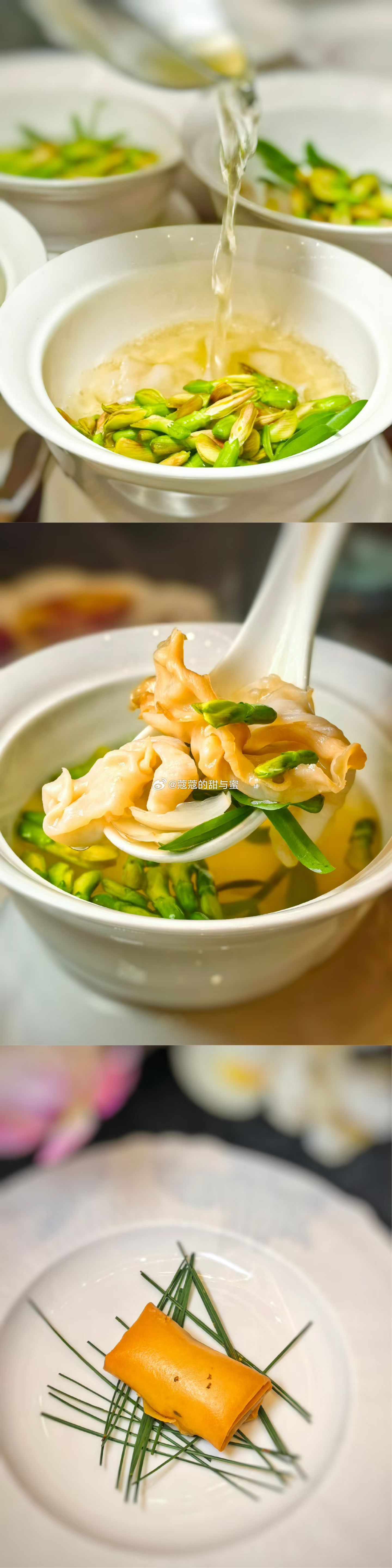 广陵春韵,滇地繁花,【扬州香格里拉】与【泓0871臻选云南菜】联袂,两相缱绻。以花为馔,共品滇味风华,取云滇奇材,合江南春鲜,融淮扬细烹之技,专意铺陈春日意趣。重瓣玫瑰、金雀花、太阳菊、姜花次第入肴,酿春之芳甜于箸间;春笋、香椿、塘鳢鱼诸般时鲜,尽得春令本味之真。席间多载滇地风物与调味,以0871为记,诺邓火腿、大理乳扇、版纳石斛苗、香茅草、小黄姜一一呈献,与江南食事之清雅细腻相融,成跨域珍味之奇。黄油重瓣玫瑰鲜花酥一枚小食启全席春序。酥取滇省八街重瓣玫瑰,和黄油、麦粉起酥,皮酥落屑,馅蕴浓馥花香,一口噙之,春之甜润,漫于唇齿。诺邓火腿手撕乳扇大理太阳菊三年陈诺邓火腿,滇省非遗珍味,咸香醇厚;配大理乳扇,奶香绵密;更兼银鱼干之鲜、太阳菊之清、滇小松仁之脆、临沧夏威夷果酱之甘,诸味层递,一口尽揽云滇山野之致。紫苏花海胆水晶肴肉取淮扬经典水晶肴肉,巧思新创,融海胆之鲜甘、紫苏之清芬,鱼胶片凝之,口感清嫩Q弹,为传统肴味,添一番新味灵韵。三年百合金雀花象拔蚌汤汤以土鸡汤慢煨为底,配象拔蚌脆嫩鲜美,复入滇地春时金雀花、三年百合、版纳石斛苗,汤清而不寡,入口得鸡汤之醇、花材之甘、菌鲜之回,清润怡人。姜花小黄姜油浸乳鸽乳鸽以滇省小黄姜、姜花炼香油浸之,佐撒菜根、香柳、柠檬叶诸香提味,鸽肉皮滑肉嫩,姜香浓馥而不辛烈,清芳解腻,适口至极。黄花胶腌笃鲜循淮扬腌笃鲜旧法,以春笋、莴笋、咸肉、排骨熬汤,添入三头黄花胶,笋脆、肉香、花胶胶糯绵密相融,存家常温软,更增滋补醇厚之味。香草竹炭包烧东山小管取滇省包烧古法,鲜东山小管配香茅草、小叶罗勒、迷迭香十余种香草,以荷叶、竹筒裹之,加紫皮蒜、猪油、竹炭盐提鲜,炭火炙成,小管鲜腴,裹满山野香草之气,入口弹韧,鲜芳相击,味极清奇。黄花菜芙蓉塘鳢鱼塘鳢鱼片若凝脂白玉,配芙蓉蛋滑嫩,黄花菜清甘,伊比利亚火腿咸香相佐,味致细腻清雅,淡而弥鲜。双柏红椿犬牙鱼春卷双柏红椿,合犬牙鱼细肉、柴鸡蛋,裹春卷皮炸至金黄,点黑醋解腻,外皮酥香,内馅鲜软,椿香清逸,满口皆是春气。春花雪莲莲子奶茶冻以茉莉花茶为底,和牛乳、淡奶油、雪莲子慢制凝冻,口感绵密顺滑,花香清甘不腻,解前席之浓,复应春花食馔之旨,为全席春宴,留一缕温软悠长之韵。春日尝鲜指南我的美食日记我的美食探店清单 扬州·香格里拉酒店