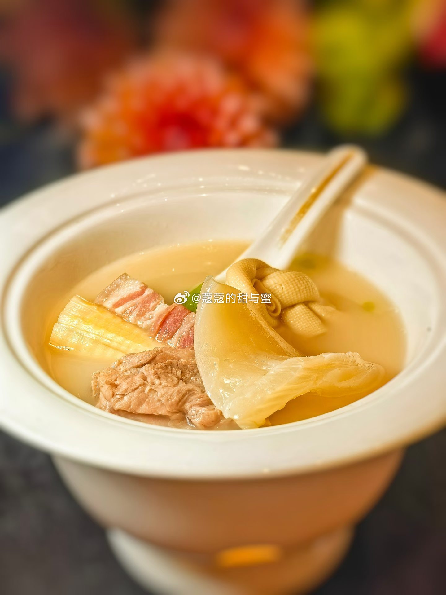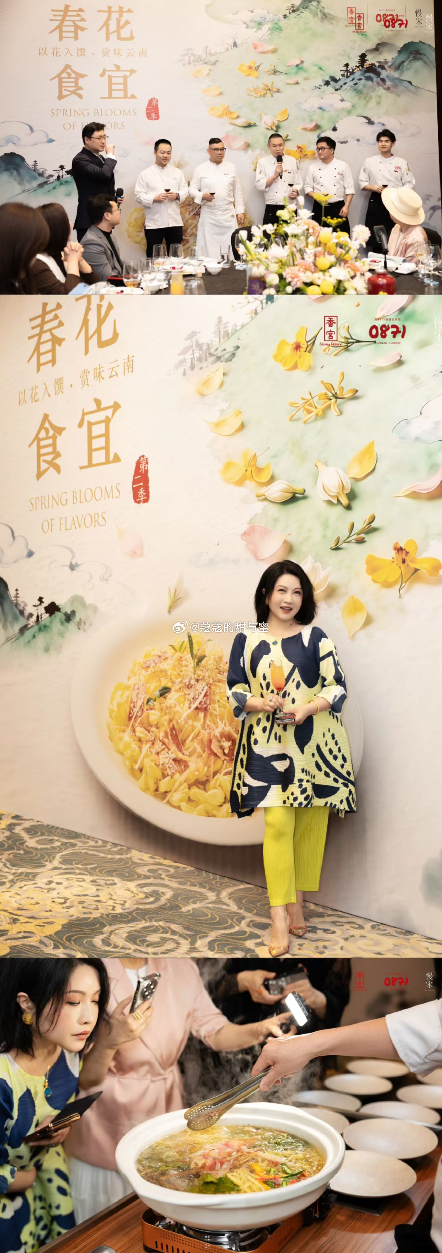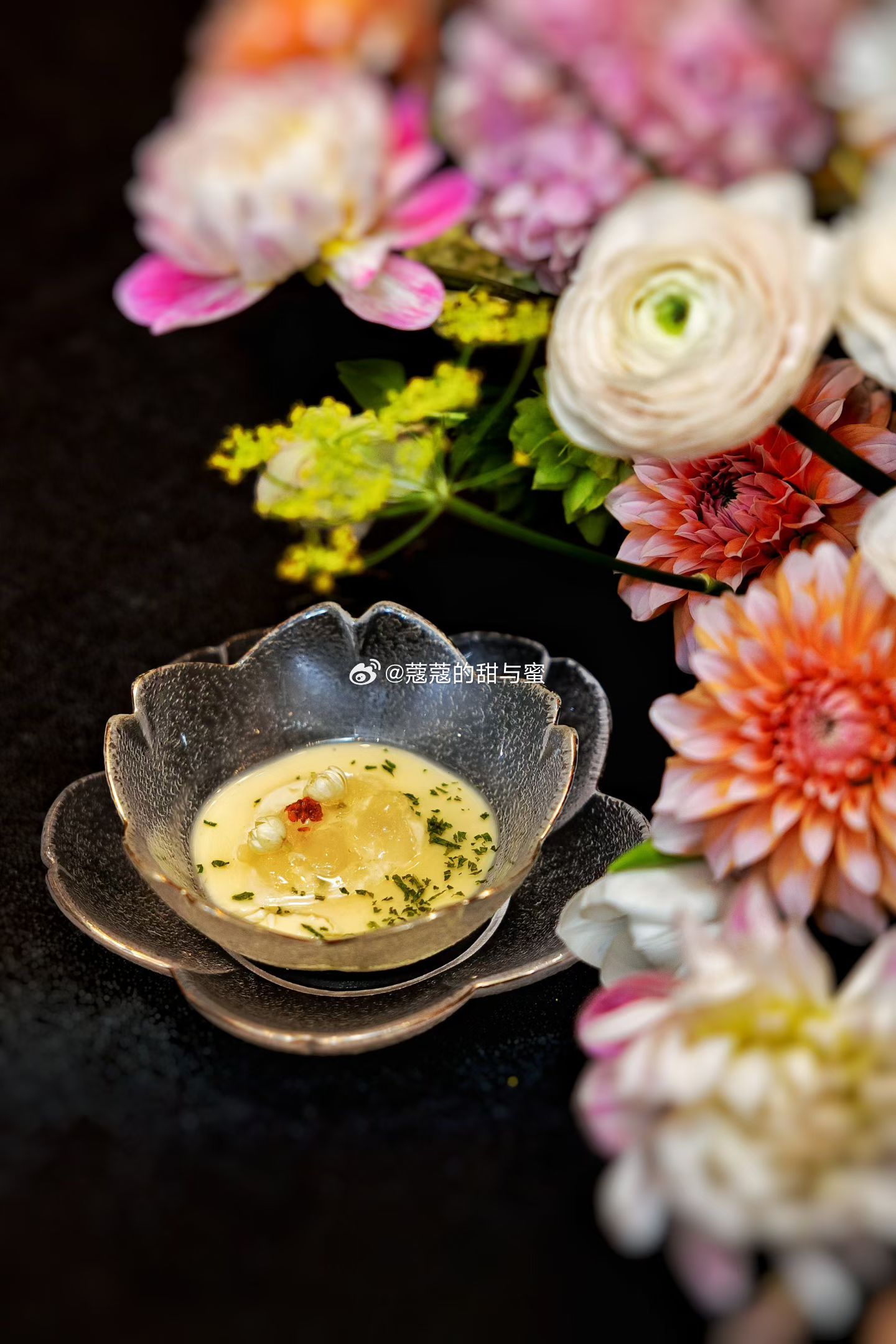 广陵春韵,滇地繁花,【扬州香格里拉】与【泓0871臻选云南菜】联袂,两相缱绻。以花为馔,共品滇味风华,取云滇奇材,合江南春鲜,融淮扬细烹之技,专意铺陈春日意趣。重瓣玫瑰、金雀花、太阳菊、姜花次第入肴,酿春之芳甜于箸间;春笋、香椿、塘鳢鱼诸般时鲜,尽得春令本味之真。席间多载滇地风物与调味,以0871为记,诺邓火腿、大理乳扇、版纳石斛苗、香茅草、小黄姜一一呈献,与江南食事之清雅细腻相融,成跨域珍味之奇。黄油重瓣玫瑰鲜花酥一枚小食启全席春序。酥取滇省八街重瓣玫瑰,和黄油、麦粉起酥,皮酥落屑,馅蕴浓馥花香,一口噙之,春之甜润,漫于唇齿。诺邓火腿手撕乳扇大理太阳菊三年陈诺邓火腿,滇省非遗珍味,咸香醇厚;配大理乳扇,奶香绵密;更兼银鱼干之鲜、太阳菊之清、滇小松仁之脆、临沧夏威夷果酱之甘,诸味层递,一口尽揽云滇山野之致。紫苏花海胆水晶肴肉取淮扬经典水晶肴肉,巧思新创,融海胆之鲜甘、紫苏之清芬,鱼胶片凝之,口感清嫩Q弹,为传统肴味,添一番新味灵韵。三年百合金雀花象拔蚌汤汤以土鸡汤慢煨为底,配象拔蚌脆嫩鲜美,复入滇地春时金雀花、三年百合、版纳石斛苗,汤清而不寡,入口得鸡汤之醇、花材之甘、菌鲜之回,清润怡人。姜花小黄姜油浸乳鸽乳鸽以滇省小黄姜、姜花炼香油浸之,佐撒菜根、香柳、柠檬叶诸香提味,鸽肉皮滑肉嫩,姜香浓馥而不辛烈,清芳解腻,适口至极。黄花胶腌笃鲜循淮扬腌笃鲜旧法,以春笋、莴笋、咸肉、排骨熬汤,添入三头黄花胶,笋脆、肉香、花胶胶糯绵密相融,存家常温软,更增滋补醇厚之味。香草竹炭包烧东山小管取滇省包烧古法,鲜东山小管配香茅草、小叶罗勒、迷迭香十余种香草,以荷叶、竹筒裹之,加紫皮蒜、猪油、竹炭盐提鲜,炭火炙成,小管鲜腴,裹满山野香草之气,入口弹韧,鲜芳相击,味极清奇。黄花菜芙蓉塘鳢鱼塘鳢鱼片若凝脂白玉,配芙蓉蛋滑嫩,黄花菜清甘,伊比利亚火腿咸香相佐,味致细腻清雅,淡而弥鲜。双柏红椿犬牙鱼春卷双柏红椿,合犬牙鱼细肉、柴鸡蛋,裹春卷皮炸至金黄,点黑醋解腻,外皮酥香,内馅鲜软,椿香清逸,满口皆是春气。春花雪莲莲子奶茶冻以茉莉花茶为底,和牛乳、淡奶油、雪莲子慢制凝冻,口感绵密顺滑,花香清甘不腻,解前席之浓,复应春花食馔之旨,为全席春宴,留一缕温软悠长之韵。春日尝鲜指南我的美食日记我的美食探店清单 扬州·香格里拉酒店