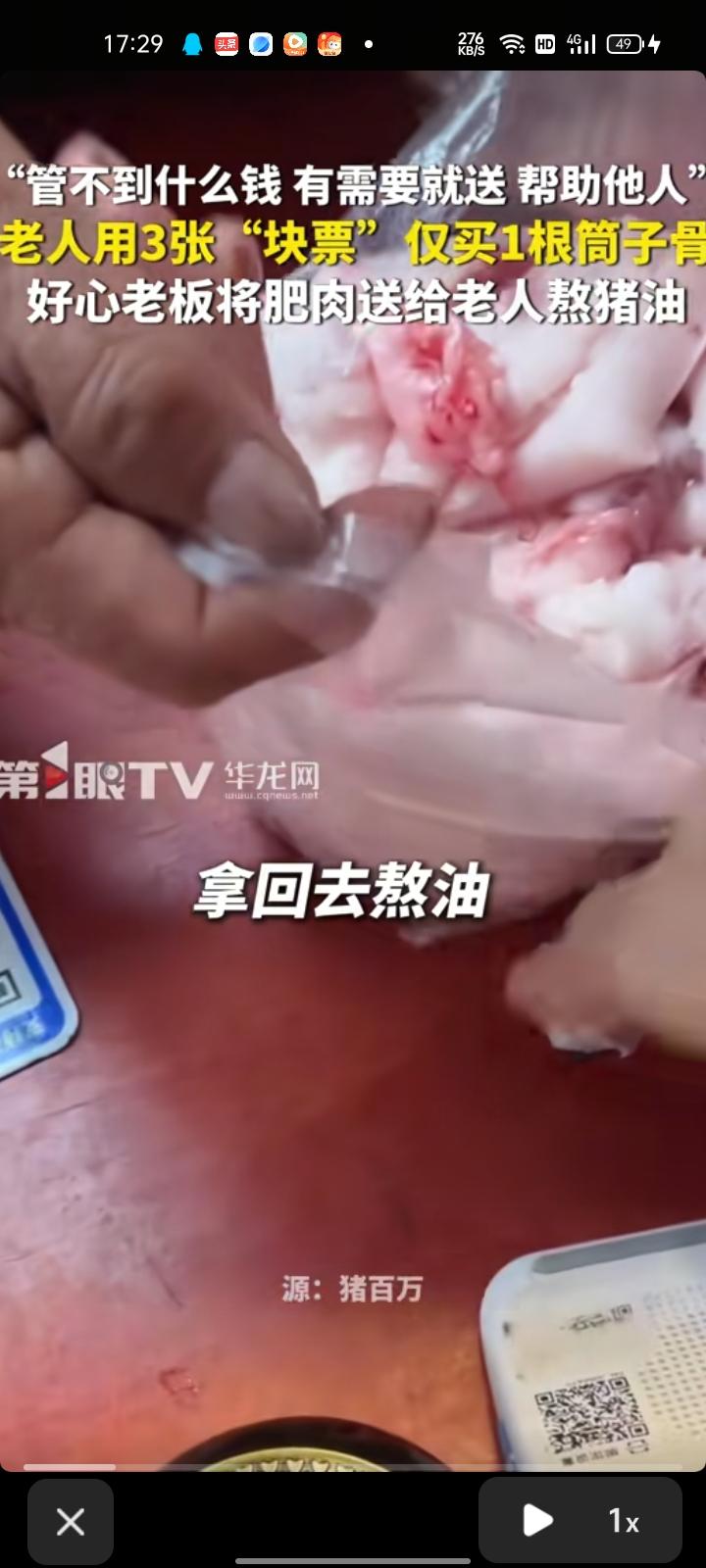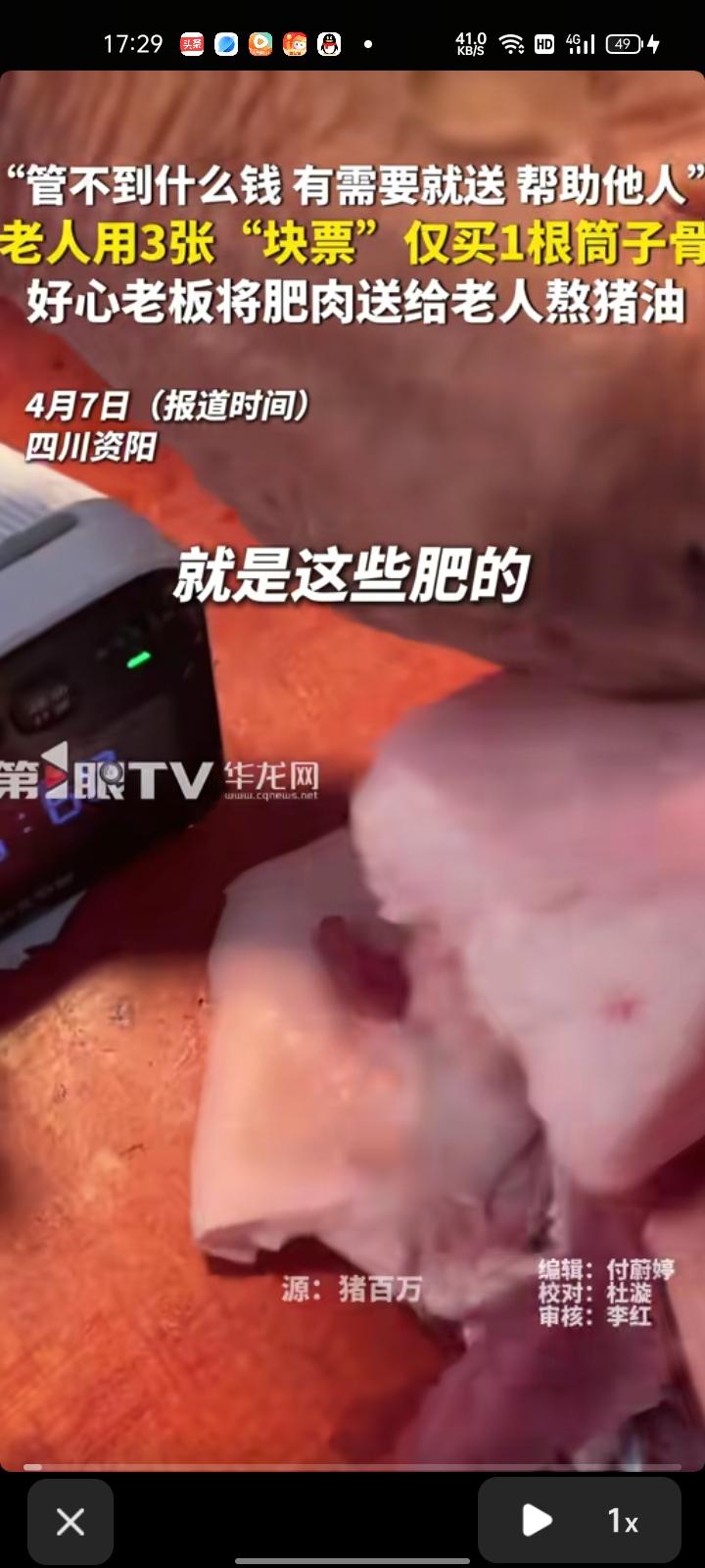 4月5日,四川资阳。老人用三张一块钱现金只买一根筒子骨,老板感觉老人挺不容易,就想到自家摊位还有多余肥肉,就顺便送给他。 老板黎女士表示,我本身是不想拿他的三块钱,看他年龄蛮大,没看到他买其他东西,空起手光买筒子骨,对于卖肉的来说是微不足道的,因为我们自身吃不了也吃不完那些,他们有需要我们就尽量送。