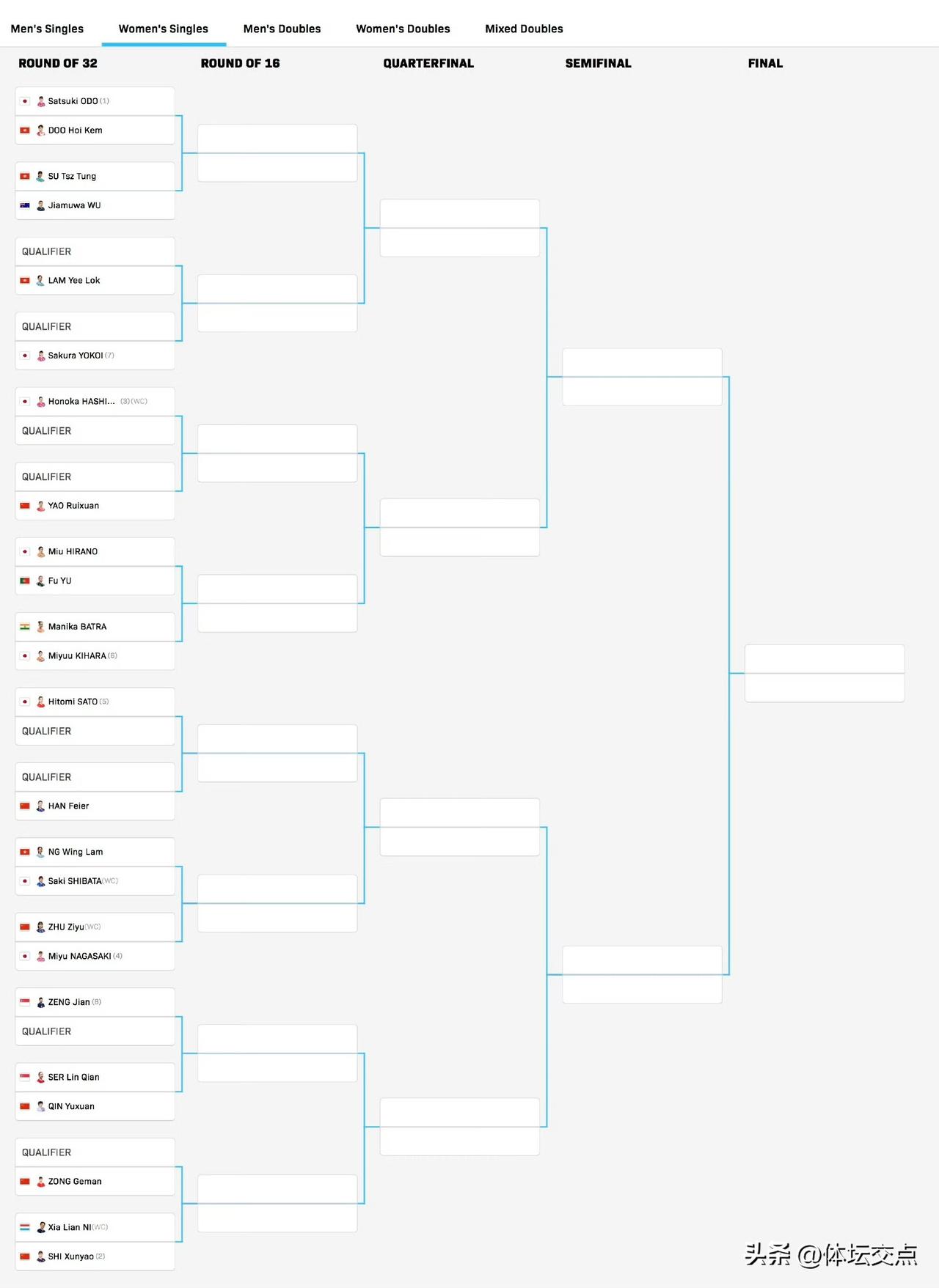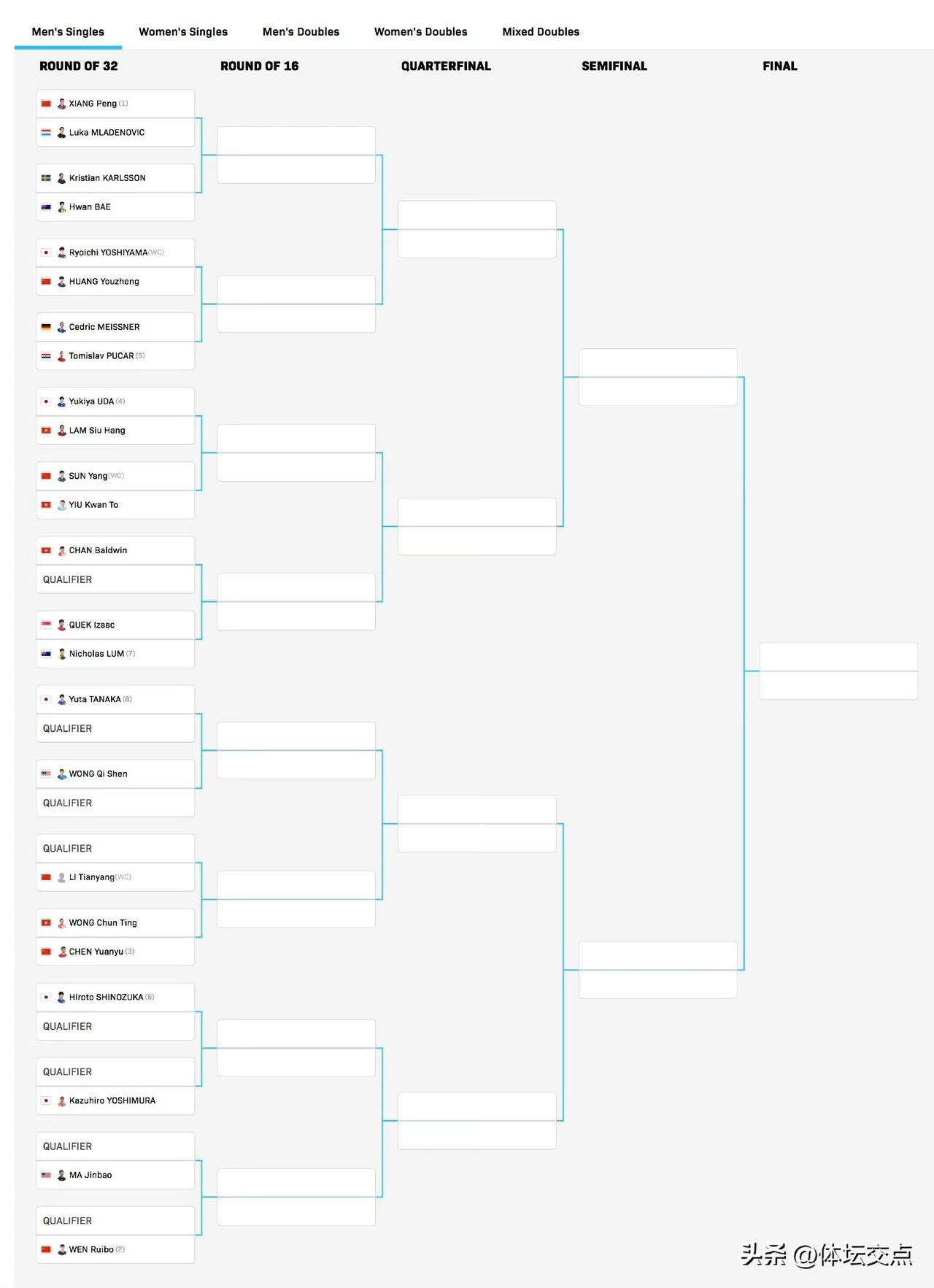 WTT常规挑战赛太原站抽签已经揭晓, 重返赛场的林诗栋,本站比赛只参加男双。他与黄友政的搭档首轮就遭遇了国乒德比,将会对阵队友孙阳/李天阳。 在男单的抽签中,头号种子国乒队员向鹏首轮的对手是倪夏莲老师的队友,来自卢森堡的梅拉德维奇。温瑞博首轮将会对阵资格赛选手,目前还未确定。但他这个四分之四区有日本名将筱冢大登。 女单头号种子大藤沙月首轮就要对阵杜凯琹。国乒参赛的队员,上半区只有姚睿轩一人,全部扎堆在下半区。石洵瑶首轮将会迎战倪夏莲阿姨,纵歌曼对阵资格赛选手,覃予萱迎战舒麟茜,三名国乒队员扎堆四分之四区。