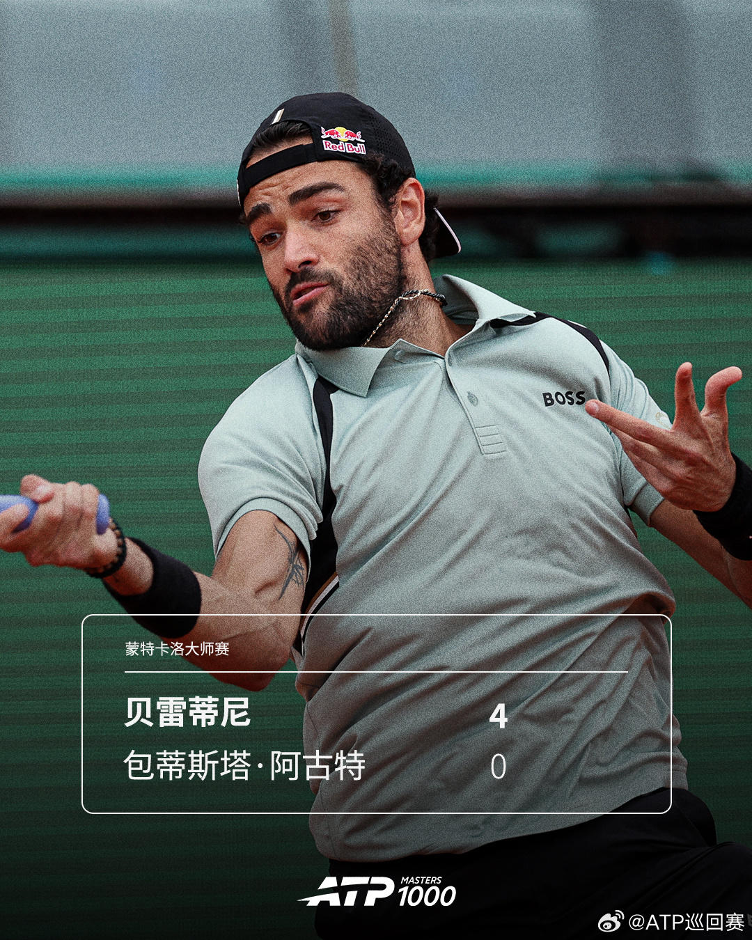 ATP1000 蒙特卡洛大师赛首轮,贝雷蒂尼在首盘4-0领先时,对手包蒂斯塔·阿古特因伤退赛,意大利名将将在次轮对阵梅德维德夫。祝Roberto早日康复🙏