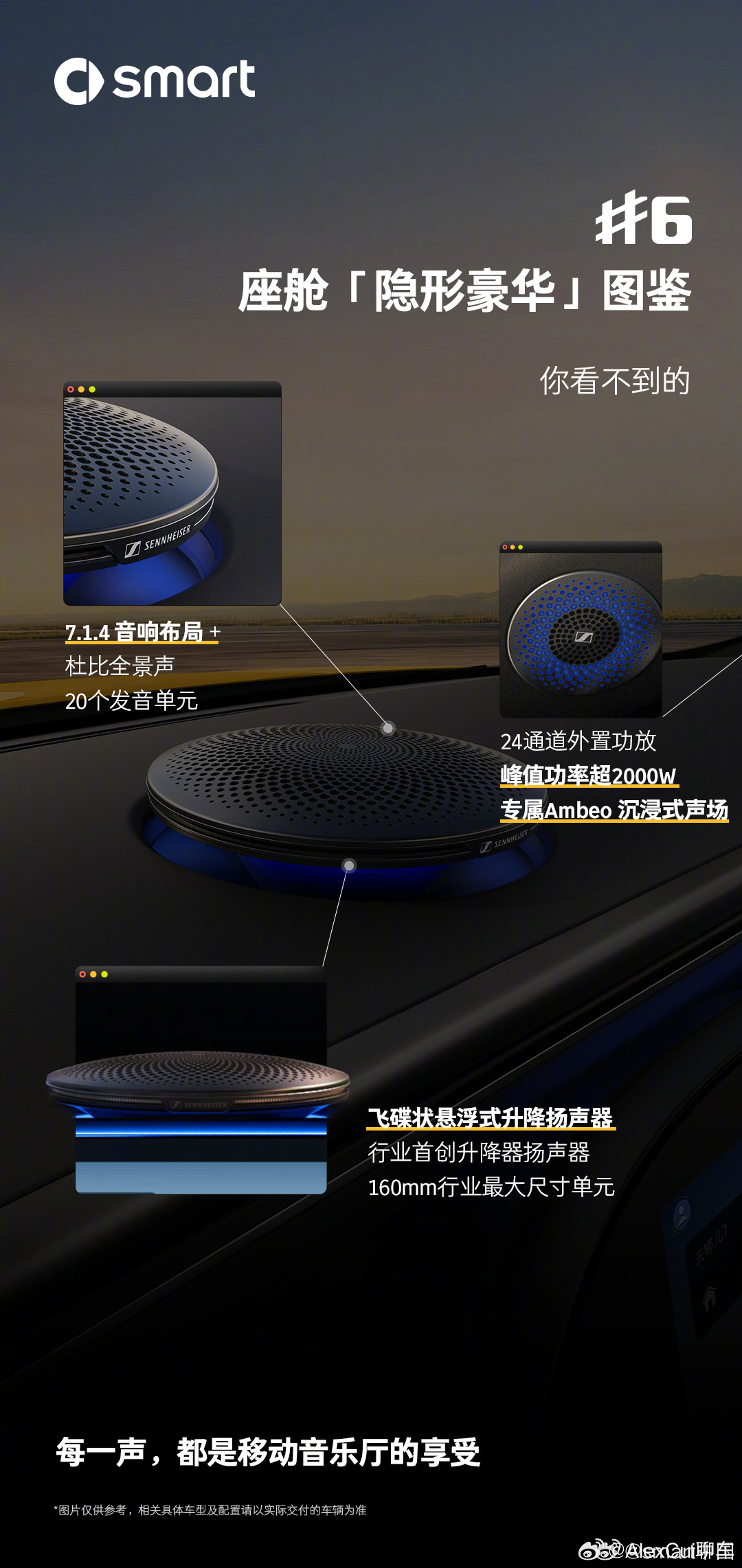 你愿意为车内的仪式感买单吗 smart 精灵 6 号这个升降扬声器,真不是花架子!一启动就缓缓升起,仪式感直接拉满。