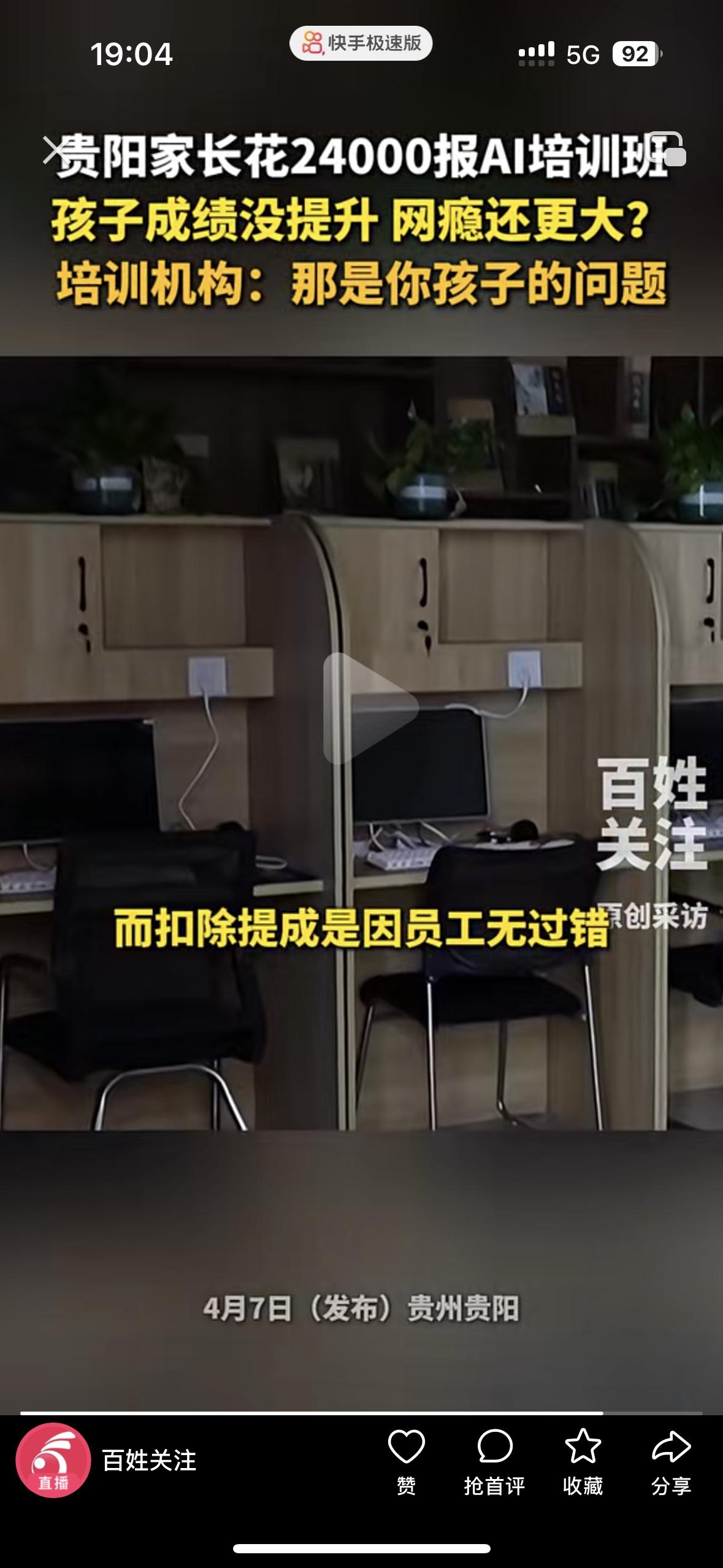 AI自习室刚火就塌了?恕我直言,这不就是圈钱的吗? 口口声声说用科技帮助孩子进步,贵阳这位家长花了24000元帮孩子报了个AI自习室,不仅成绩没提升退步了,还有了网瘾。可机构负责人却说,我们只负责监督和学习机教授课程,成绩未提升归结于孩子自己。 最后好说歹说才退还了9500,家长们还是擦亮眼睛吧,毕竟AI学习机有些题型他自己都没有,说难听点就是上网课,对于学生也没针对性,这种太不靠谱了