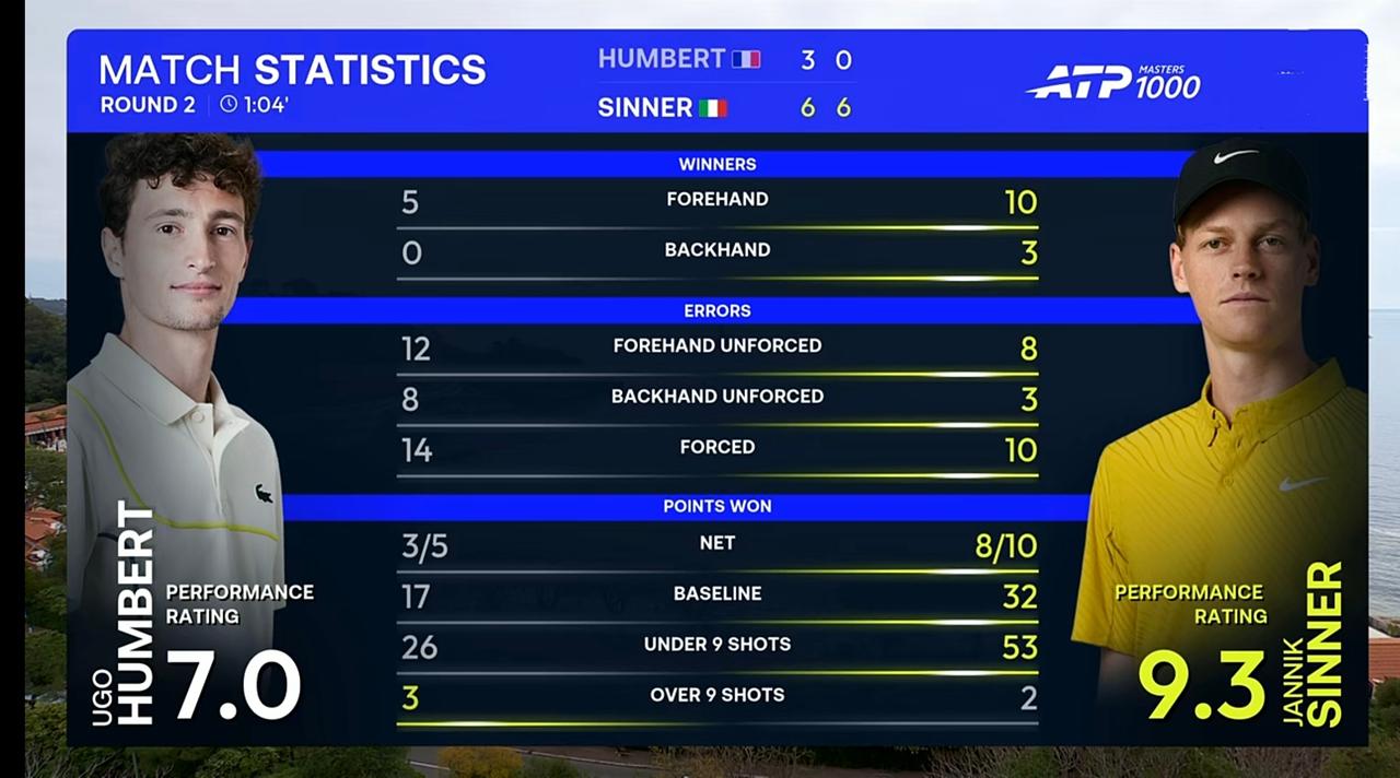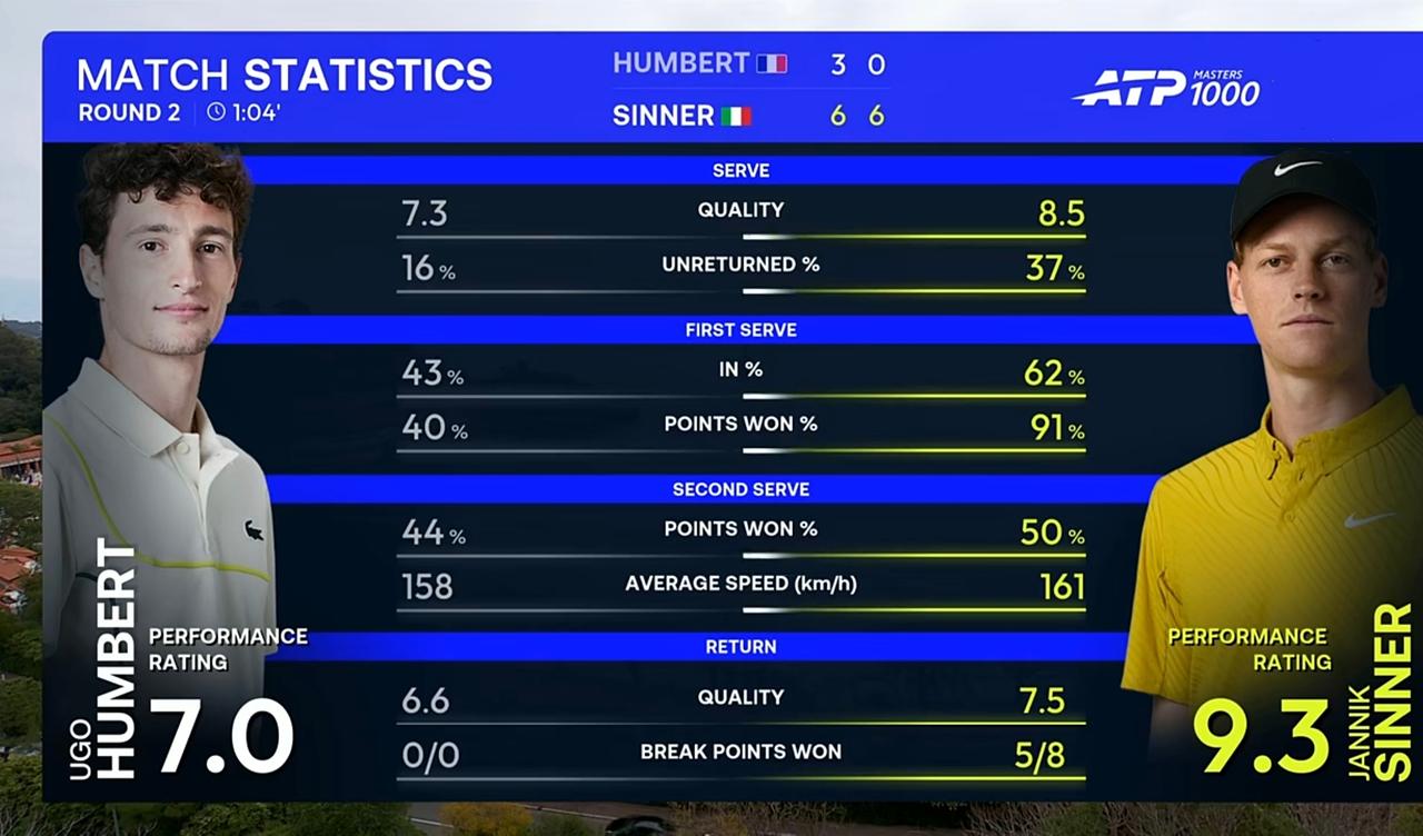 辛纳以血洗方式开启蒙特卡洛大师赛 北京时间2026年4月7日晚上,蒙特卡洛大师赛第二轮,辛纳对阵安贝尔。 结果,激战两盘,耗时1小时04分钟,辛纳以2:0的比分残暴血洗安贝尔,强势晋级。 具体比分为6:3、6:0。 整场比赛,辛纳共轰出6记ACE,比对手多5记;发出2个双误,与对手持平;一发得分率高达91.30%,比对手高出50多个百分点;二发得分率50.00%,比对手高近6个百分点;成功破发5次,比对手多5次;总得分55分,比对手多26分。 这场比赛势不均力不敌,整场比赛仅让对手拿下三局,第二盘送蛋,辛纳碾压式残暴血洗对手,强势开启蒙特卡洛大师赛。