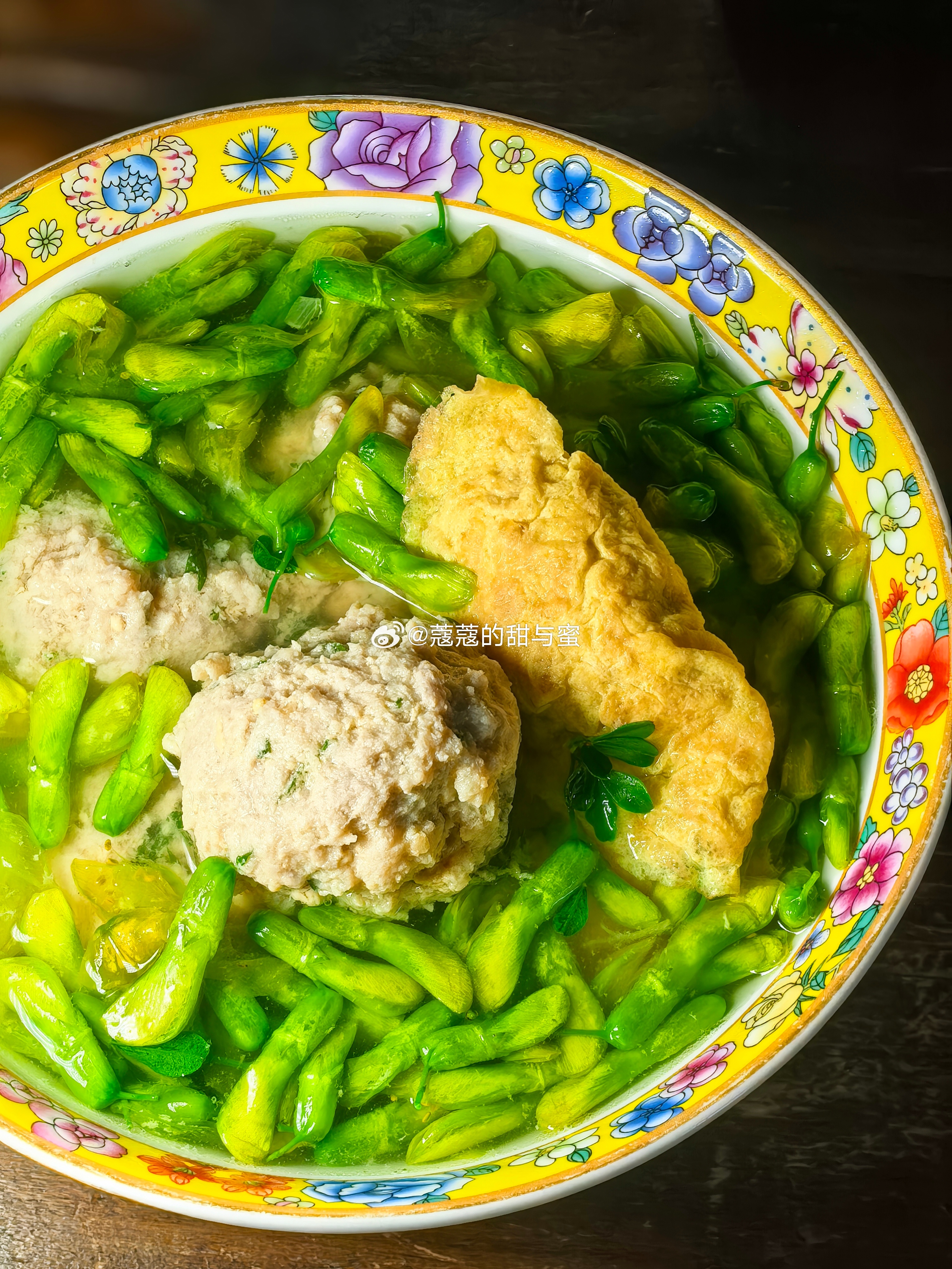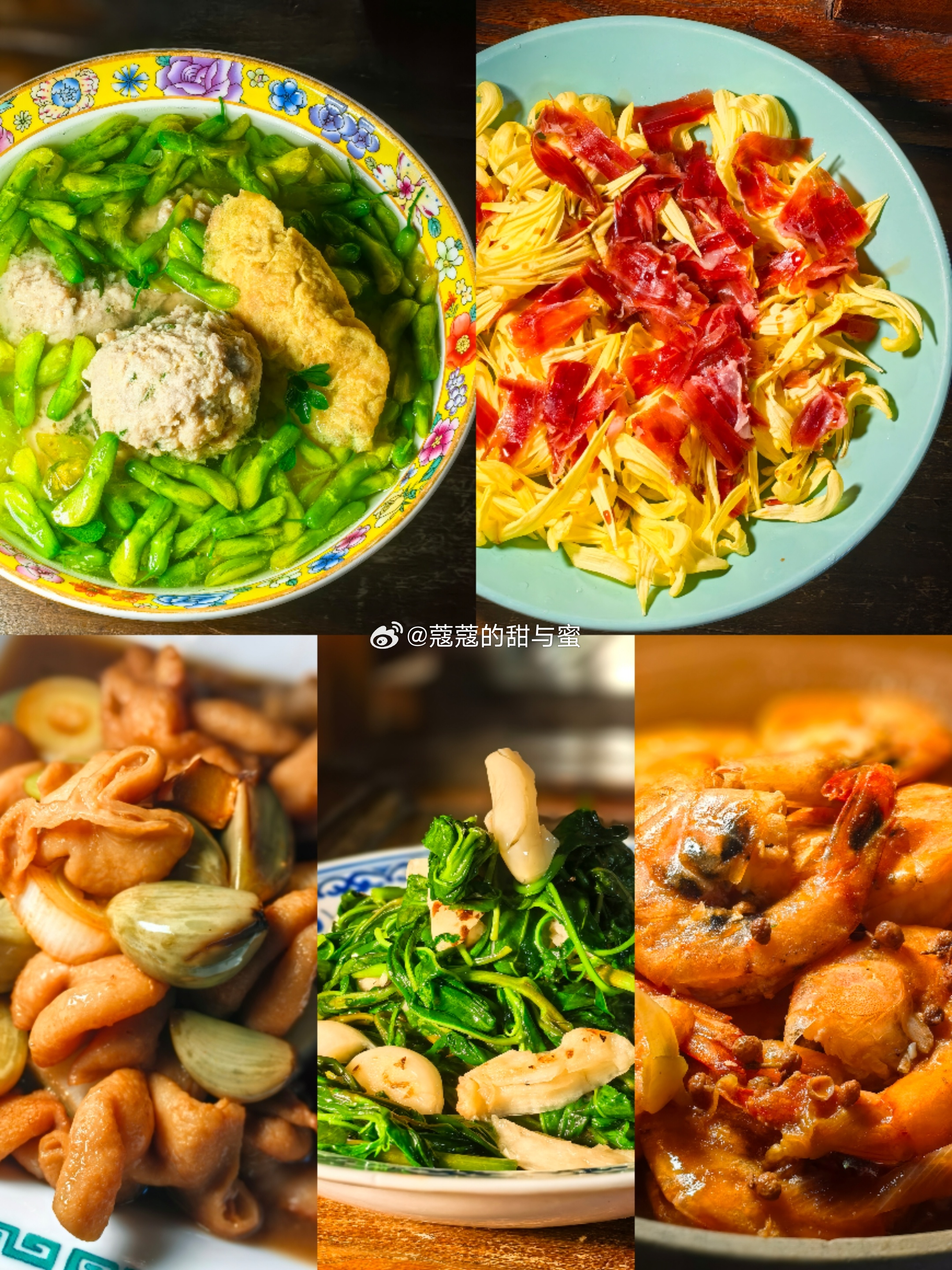 【蔻家餐桌】晚饭做了几道春菜。10年陈摩德纳黑醋伊比利亚火腿拌菊花蔻记腊八蒜炒肥肠清炒枸杞芽茄汁烧大虾自制蛋饺肉圆金雀花汤春日尝鲜指南我的美食日记家常菜