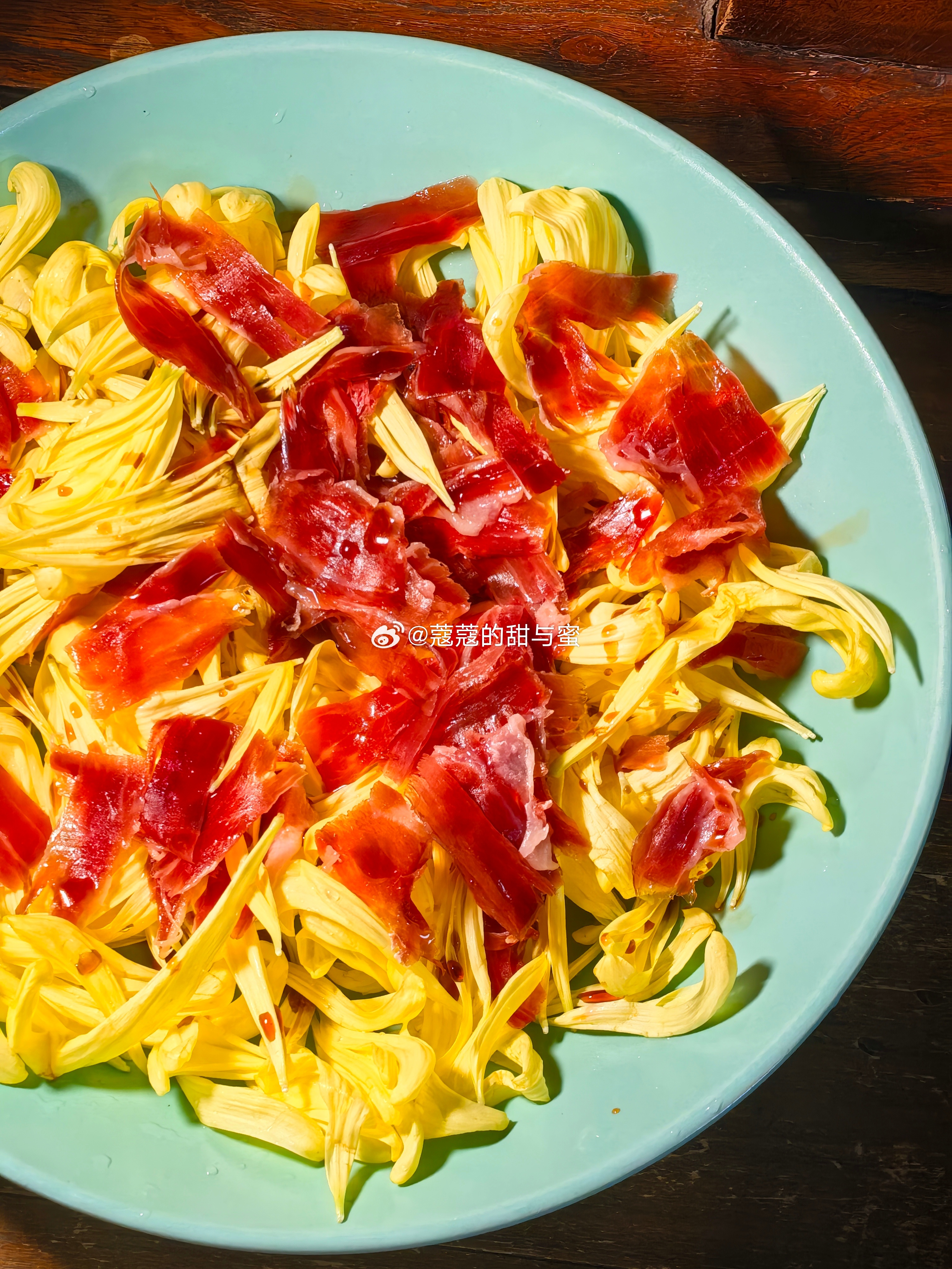 【蔻家餐桌】晚饭做了几道春菜。10年陈摩德纳黑醋伊比利亚火腿拌菊花蔻记腊八蒜炒肥