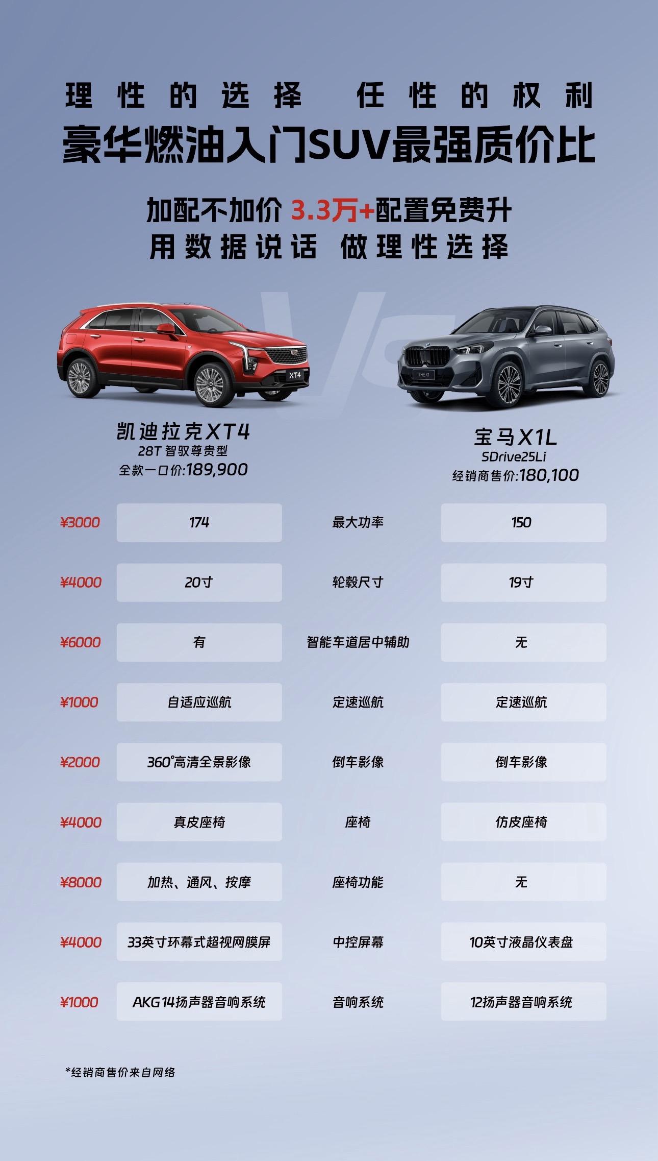 豪华燃油入门SUV怎么选?凯迪拉克XT4对比宝马X1L/奥迪Q3,全款...