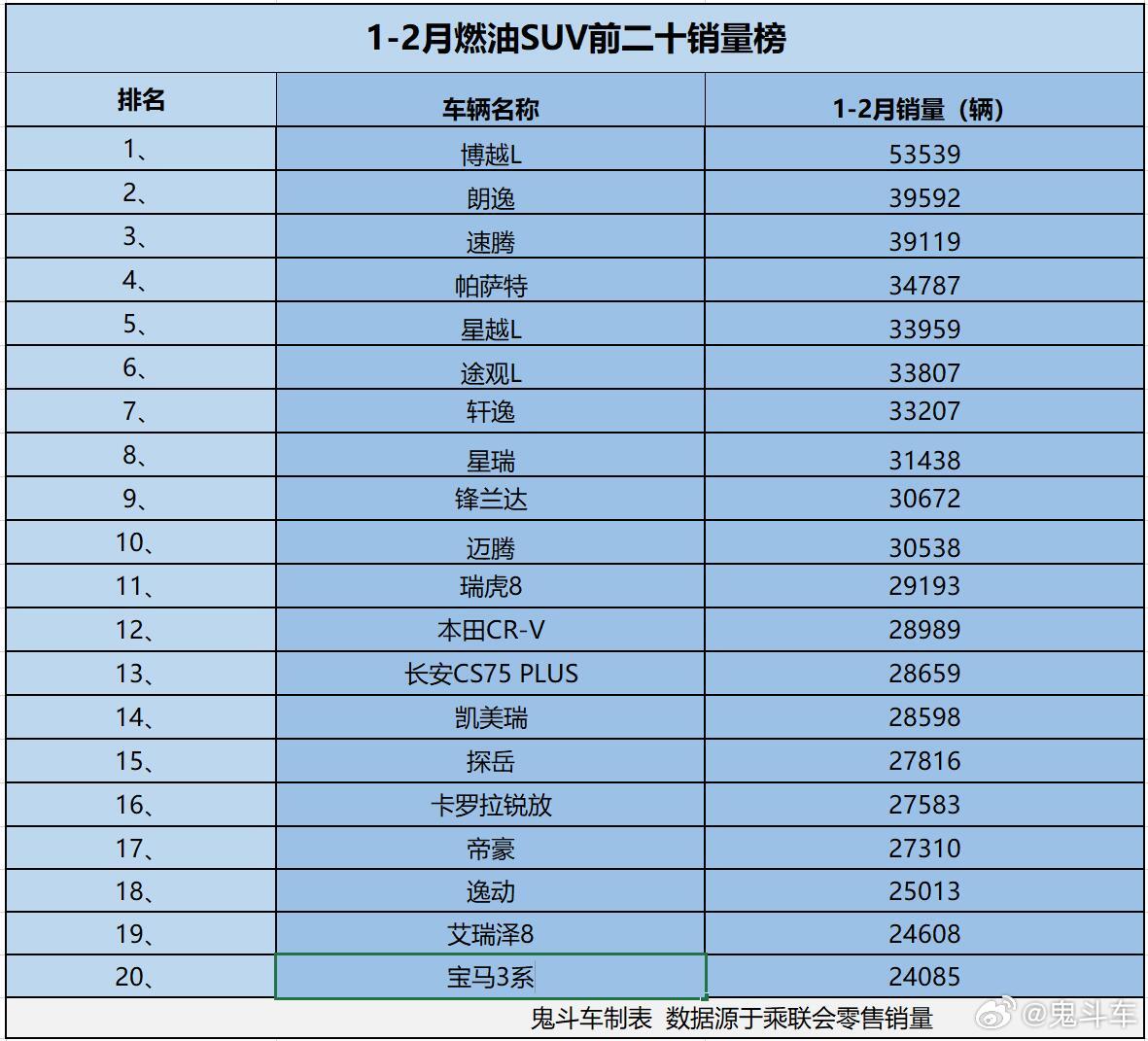 燃油车热度不减!1-2月销量榜出炉 十款销量过3万 星越L第五