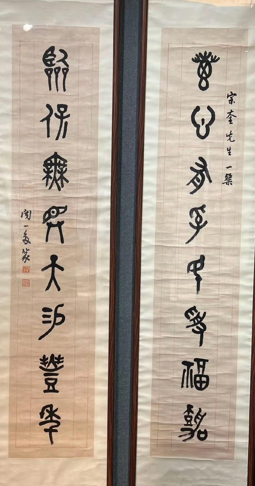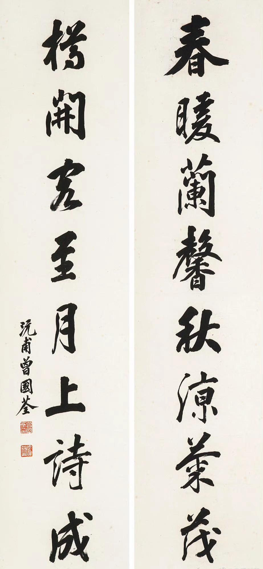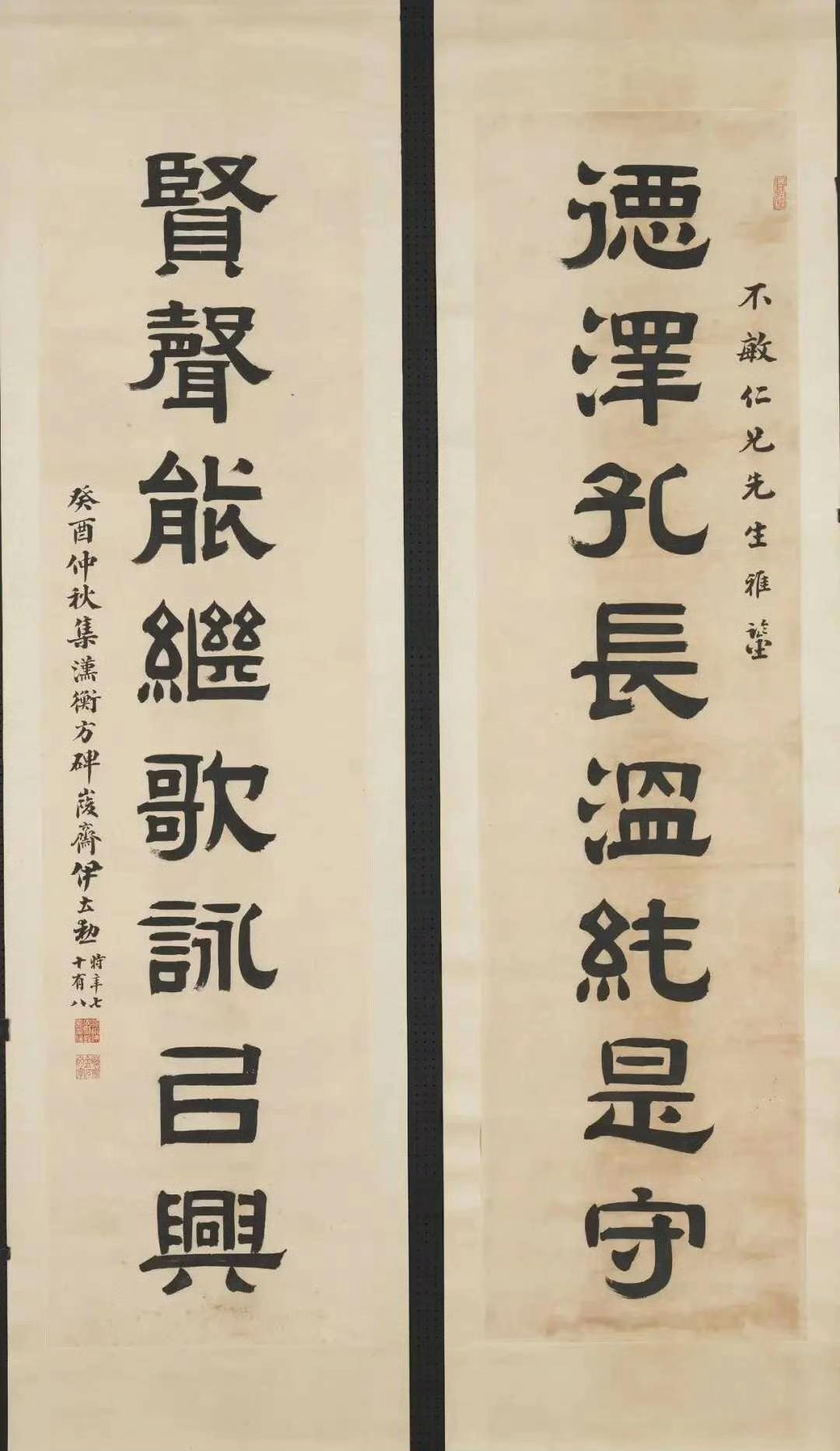 郑孝胥 行书 八言联 《鸾凤清音通乎律吕,鼎彝古色灿若云霞》 吴湖帆 行书 八言联 《槛外长江楼中红袖,天涯倦客海上苍颜》 何绍祺 楷书 八言联, 《雨外舂声日边帆影,琴中绿水屏上青山》 高吹万 行书 八言联 ​​​ 《风月高情南华秋水,琴尊远契北苑春山》 伊立勋 隶书 八言联 《德泽孔长温纯是守。贤声能继歌咏以兴》 曾国荃 行书 八言联 ​​​ 《春暖兰馨秋凉菊茂,樽开客至月上诗成》 于右任 行书 八言联 《以奇用兵以正治国,大方无隅大象无形》 闻一多 篆书 八言联 《惠心有孚民受福嘉, 临保无斁天赐丰年》 于非闇 行书 八言联 ​​​ 《证菩提果观自在心,开蟠桃花祝无量寿》