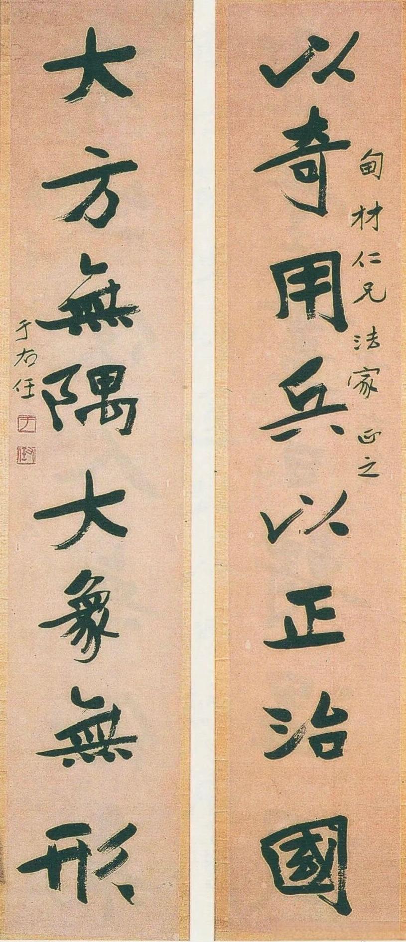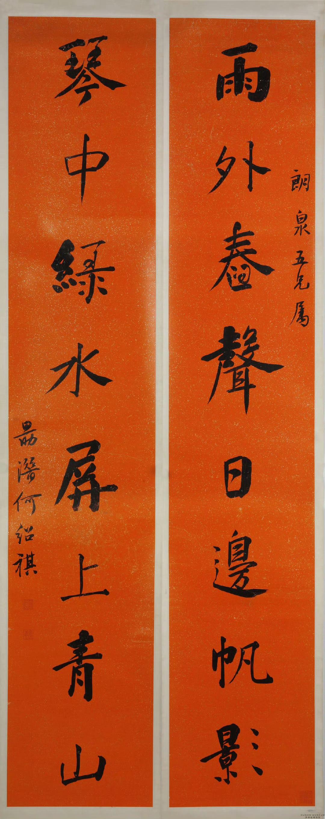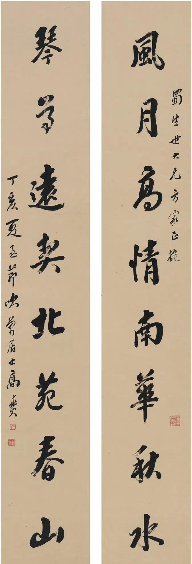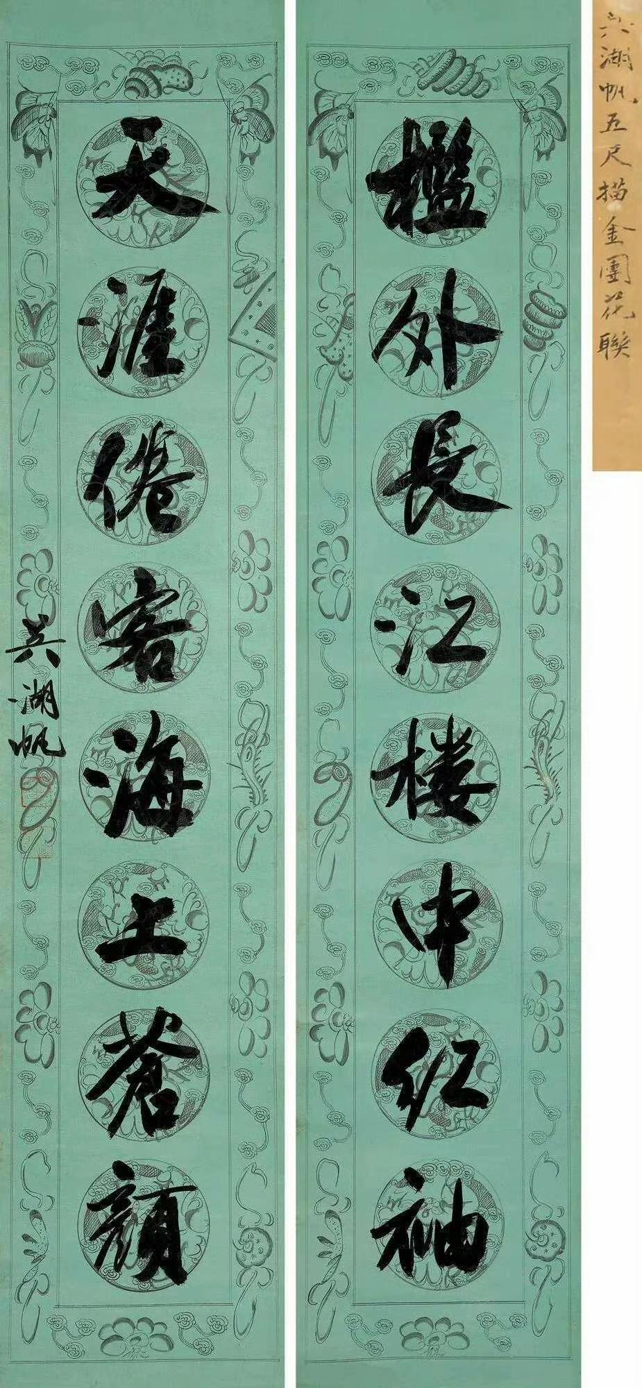 郑孝胥 行书 八言联 《鸾凤清音通乎律吕,鼎彝古色灿若云霞》 吴湖帆 行书 八言联 《槛外长江楼中红袖,天涯倦客海上苍颜》 何绍祺 楷书 八言联, 《雨外舂声日边帆影,琴中绿水屏上青山》 高吹万 行书 八言联 ​​​ 《风月高情南华秋水,琴尊远契北苑春山》 伊立勋 隶书 八言联 《德泽孔长温纯是守。贤声能继歌咏以兴》 曾国荃 行书 八言联 ​​​ 《春暖兰馨秋凉菊茂,樽开客至月上诗成》 于右任 行书 八言联 《以奇用兵以正治国,大方无隅大象无形》 闻一多 篆书 八言联 《惠心有孚民受福嘉, 临保无斁天赐丰年》 于非闇 行书 八言联 ​​​ 《证菩提果观自在心,开蟠桃花祝无量寿》