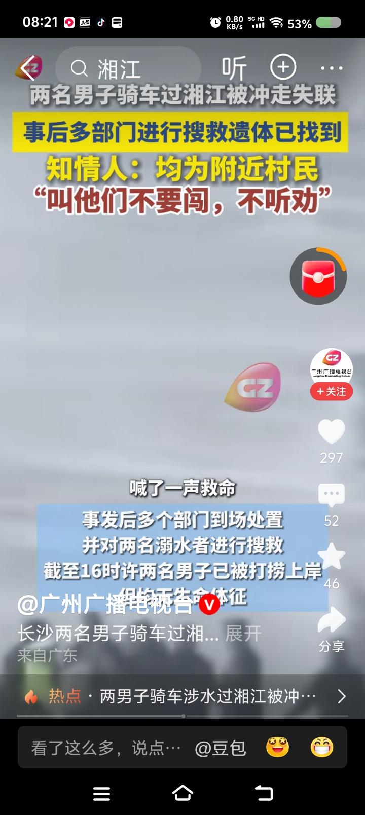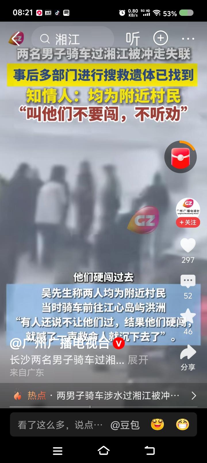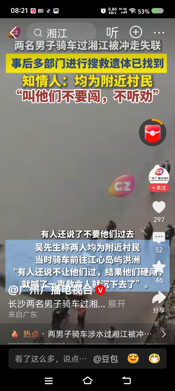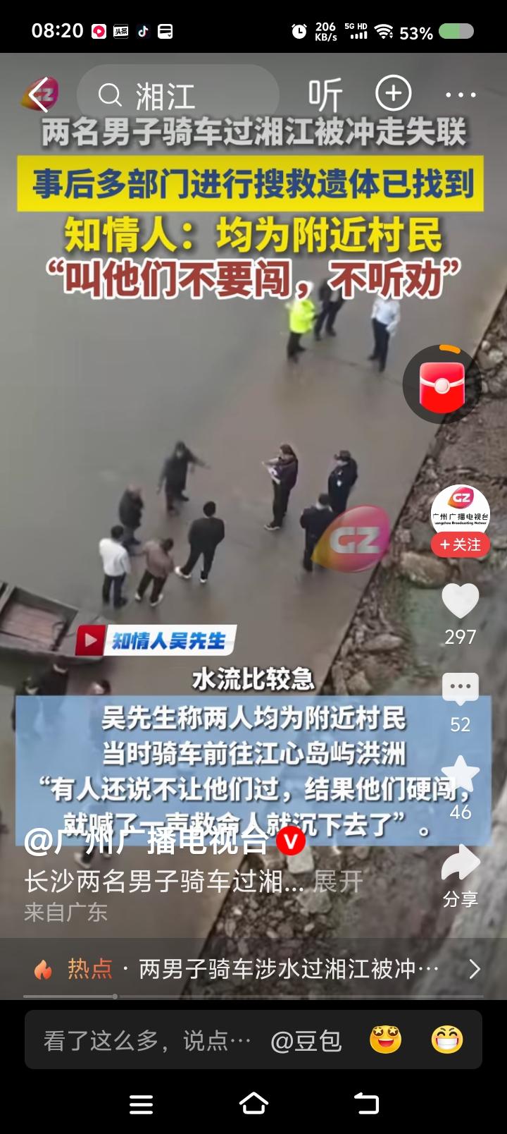 骑车过湘江?—— 据报道,两男子不听劝阻,骑车过湘江,失联,尸体已找到。