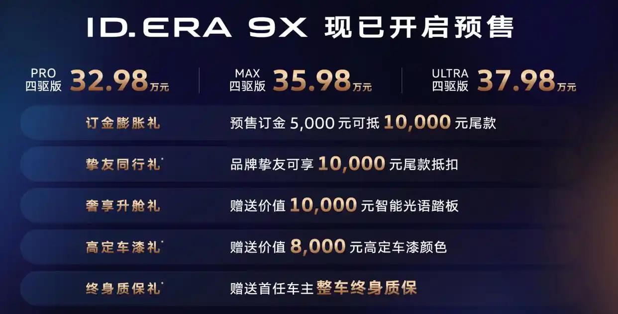 大众 ID. ERA 9X 全系标配四驱,共有 3 个版本,起售价为 32.98 万元。