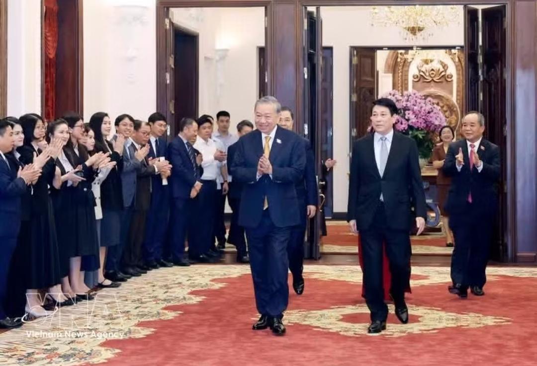 微妙的一幕,全场只有梁强一个人没有鼓掌! 苏林走访看望越南主席办公室全体人员,