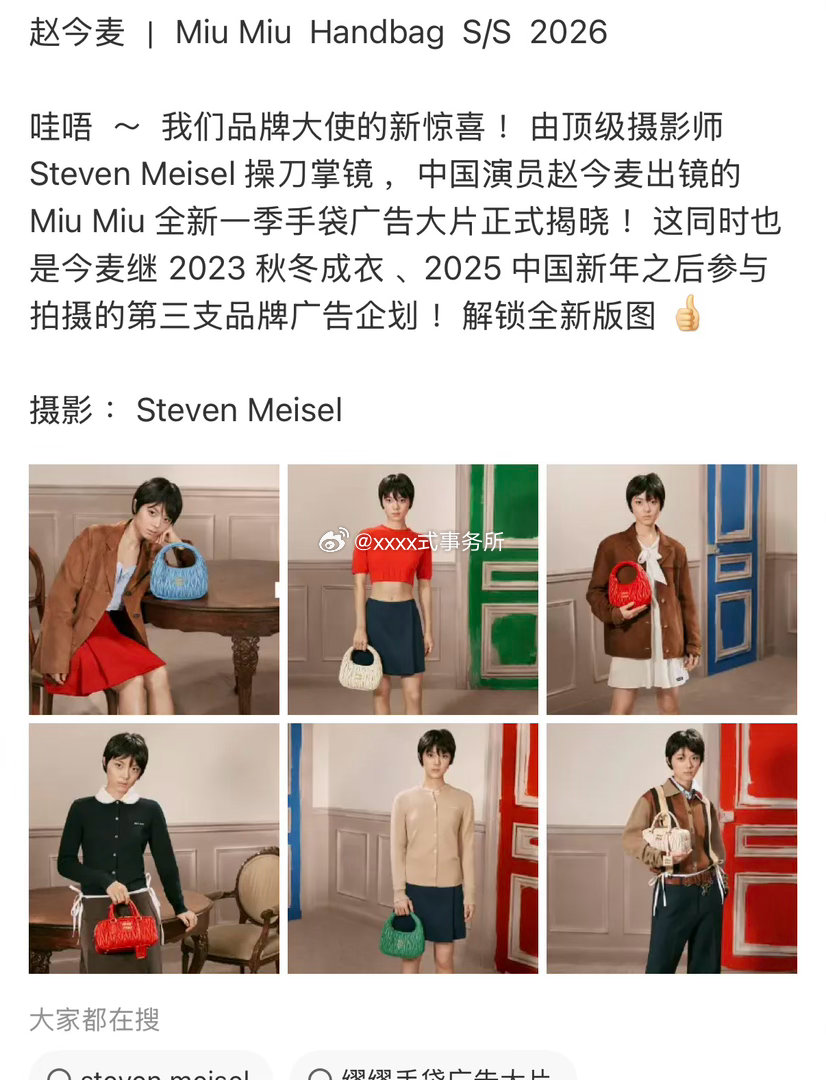 赵今麦出镜的 Miu Miu由顶级摄影师 Steven Meisel 操刀掌镜 ,很强履历的摄影师,这同时也是赵今麦继 2023 秋冬成衣 、2025 中国新年之后参与拍摄的第三支品牌广告企划