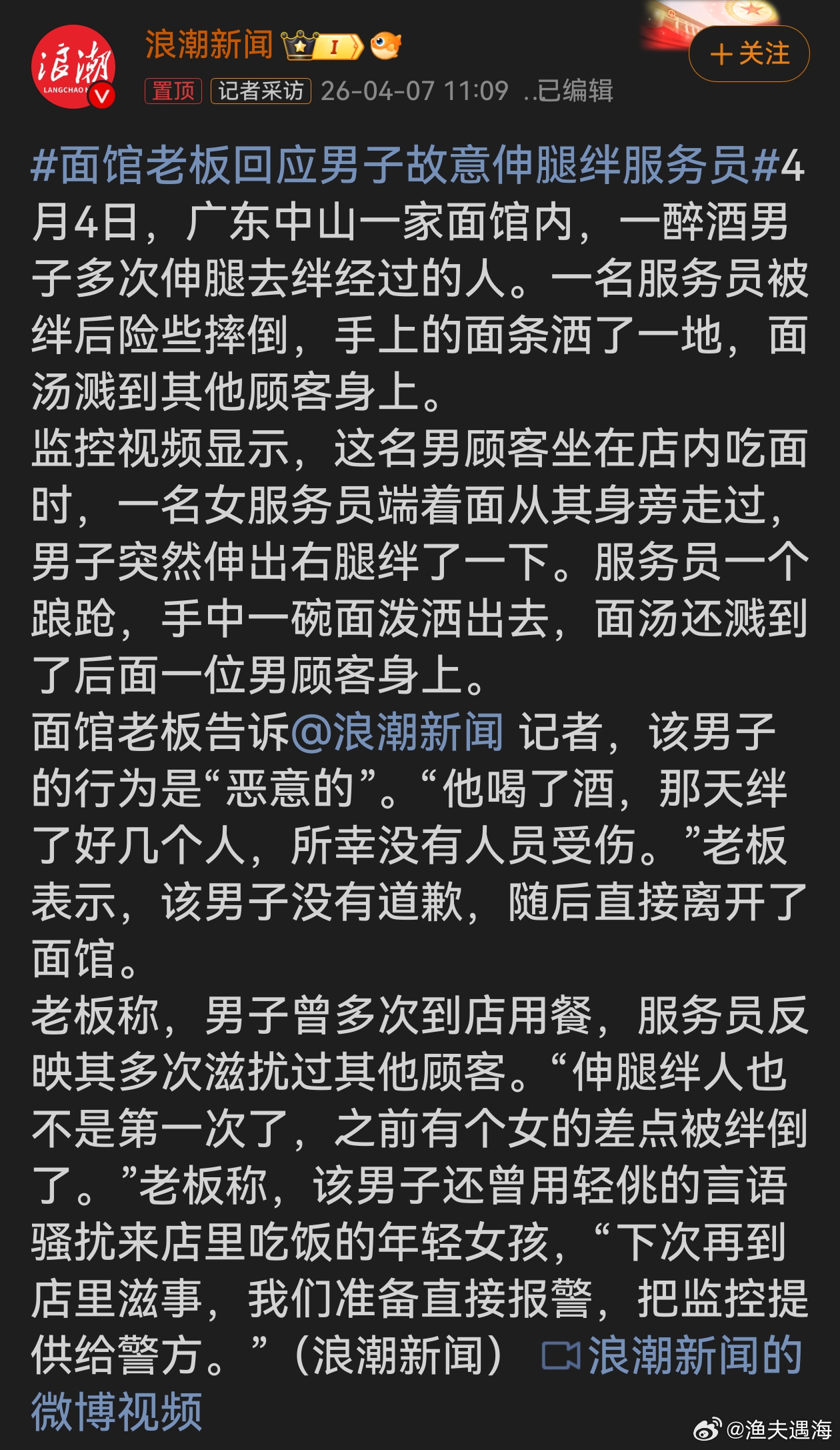 面馆老板回应男子故意伸腿绊服务员该醉酒男子的行为极其恶劣!在面馆多次故意伸腿绊人,滋扰顾客、骚扰女孩,毫无道德底线,严重影响公共秩序与他人安全。面馆老板应立刻报警,将监控提供给警方。此类人必须受到法律制裁,以维护社会公序良俗和大众权益。