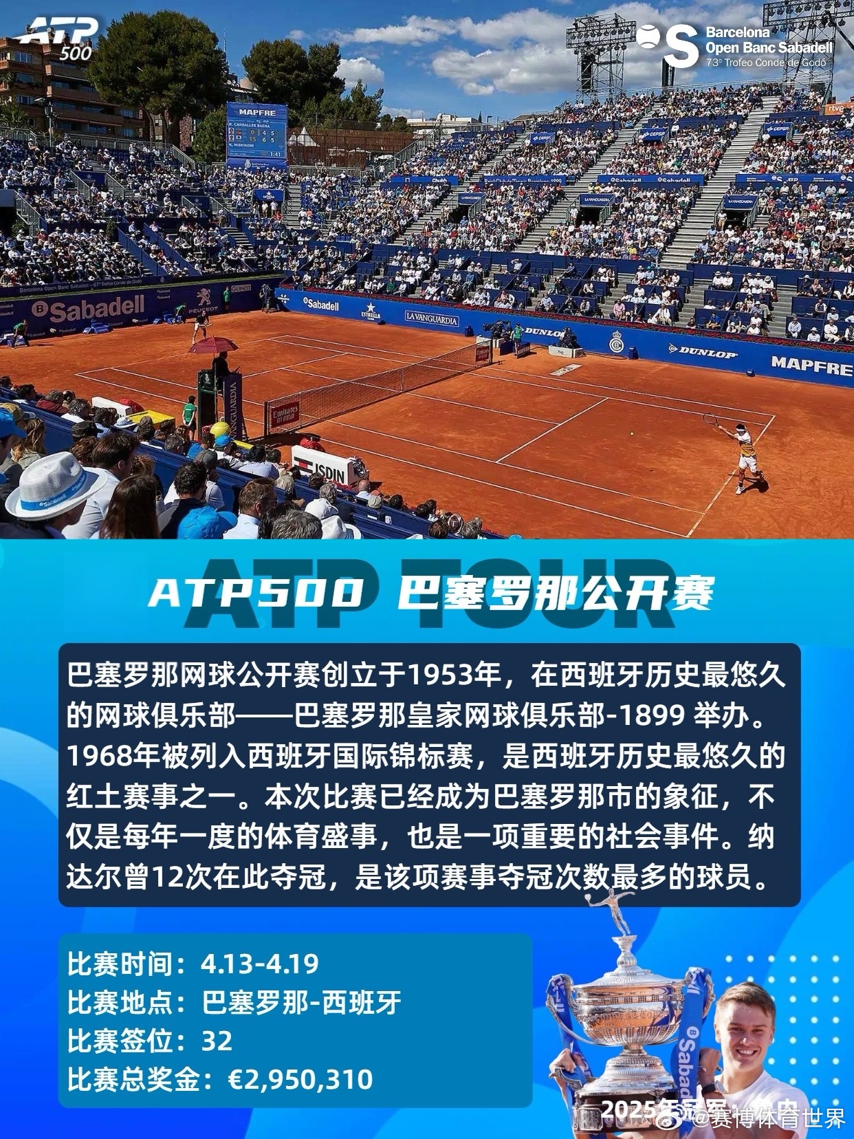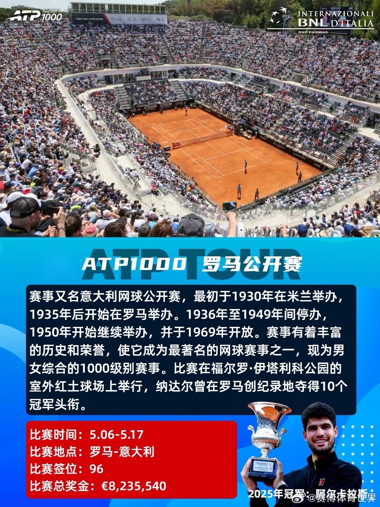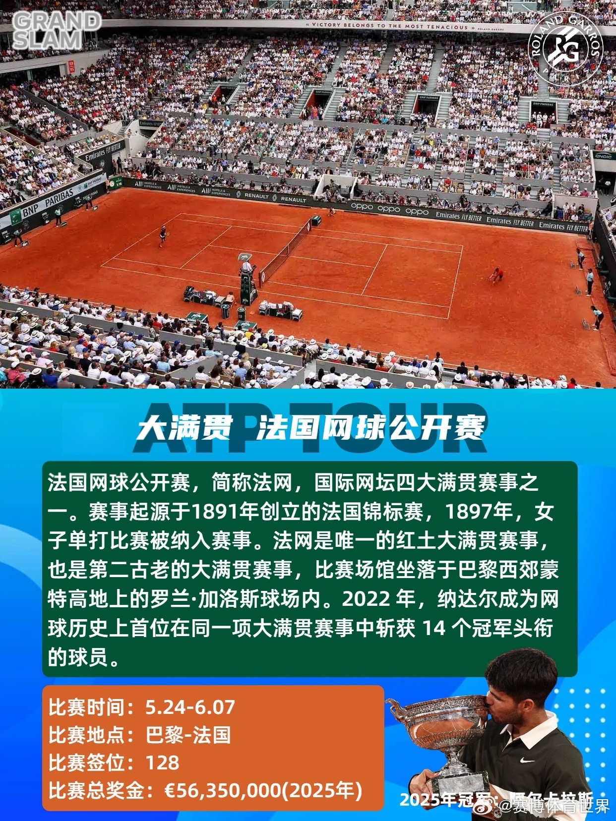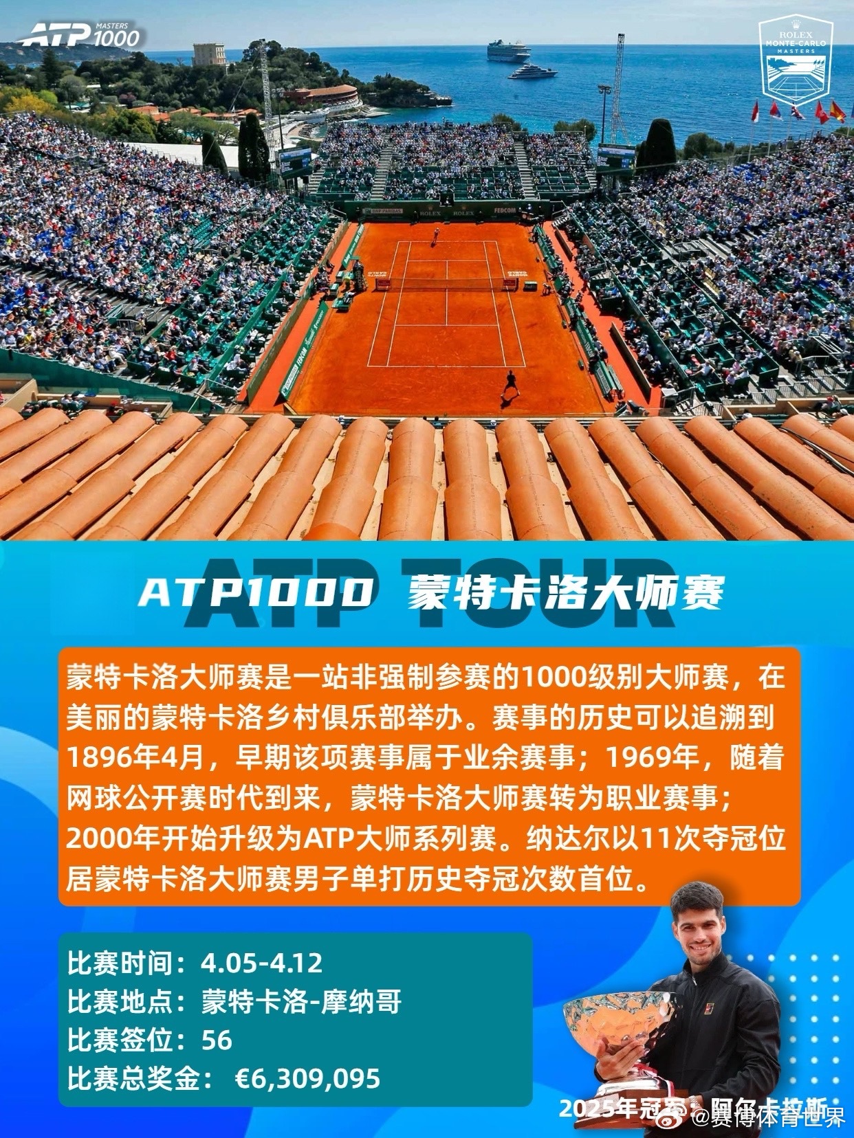 红土赛季ATP法网 ATP2026年4-6月红土赛季共设8站赛事,包括1站大满贯、3站1000赛、3站500赛和1站250赛,时间从4月5日持续至6月7日。具体赛程时间及赛事介绍如图。📆4.05-4.12ATP1000蒙特卡洛大师赛单打签位:56比赛总奖金:💶6,309,095卫冕冠军:🇪🇸阿尔卡拉斯📆4.13-4.19ATP500巴塞罗那公开赛单打签位:32比赛总奖金:💶2,950,310卫冕冠军:🇩🇰鲁内📆4.13-4.19ATP500慕尼黑公开赛单打签位:32比赛总奖金:💶2,561,110卫冕冠军:🇩🇪兹维列夫📆4.22-5.03ATP1000马德里公开赛单打签位:96比赛总奖金:💶8,235,540卫冕冠军:🇳🇴鲁德📆5.06-5.17ATP1000罗马公开赛单打签位:96比赛总奖金:💶8,235,540卫冕冠军:🇪🇸阿尔卡拉斯📆5.17-5.23ATP500汉堡公开赛单打签位:32比赛总奖金:💶2,219,670卫冕冠军:🇮🇹科博利📆5.18-5.23ATP250日内瓦公开赛单打签位:28比赛总奖金:💶612,620卫冕冠军:🇷🇸德约科维奇📆5.24-6.07大满贯 法国网球公开赛单打签位:128比赛总奖金:💶56,350,000(2025年)卫冕冠军:🇪🇸阿尔卡拉斯红土是球速最慢的场地类型,弹跳高,注重相持和上旋打法,胜利往往属于最坚韧的人。期待红土赛季!