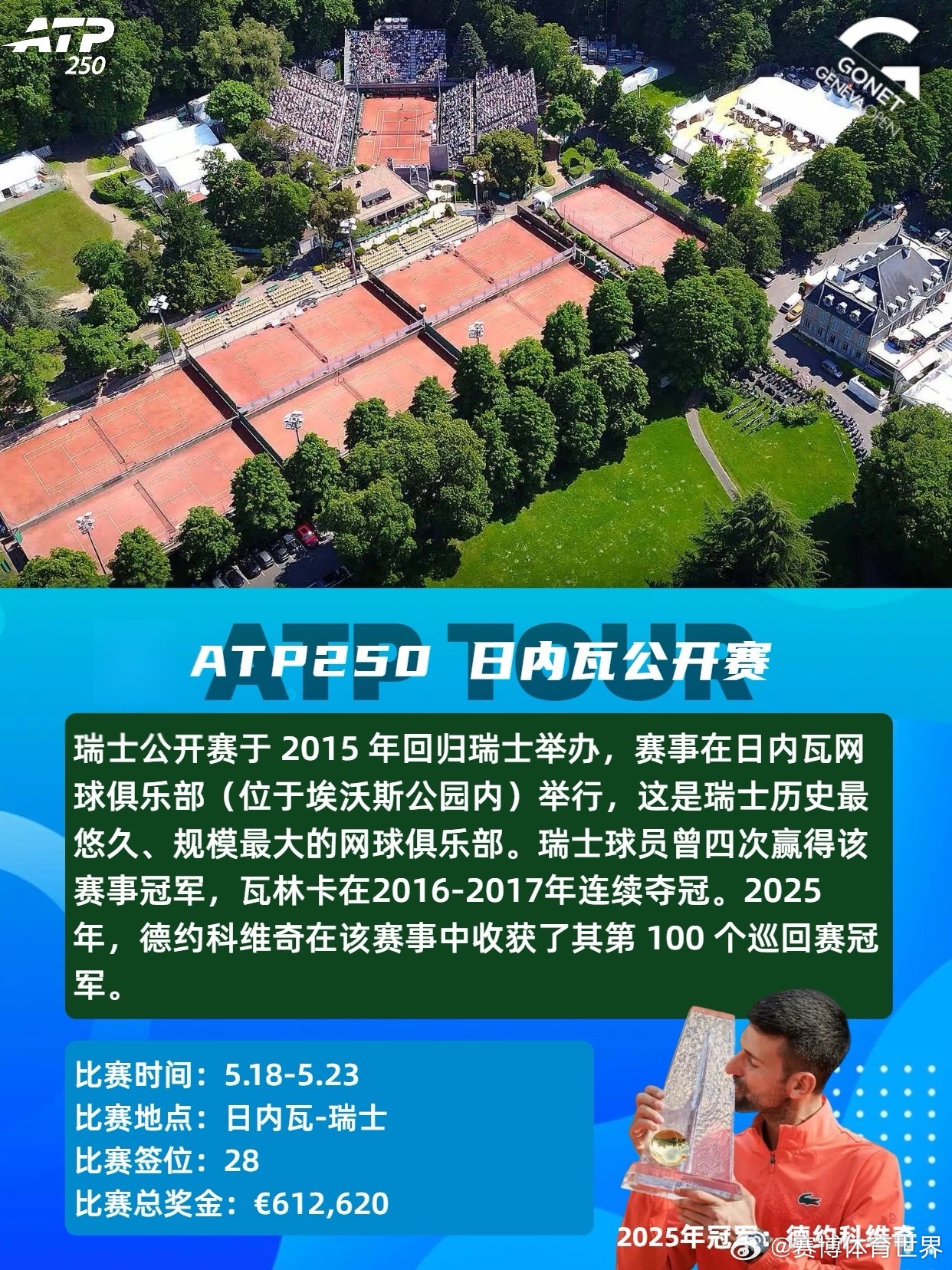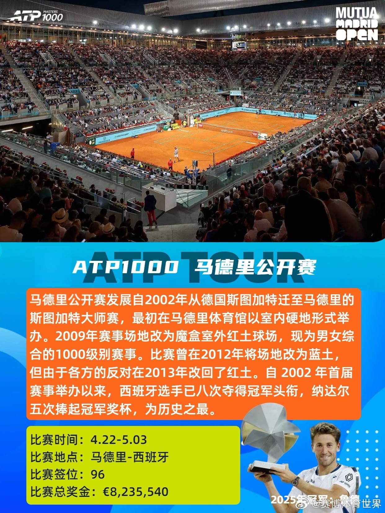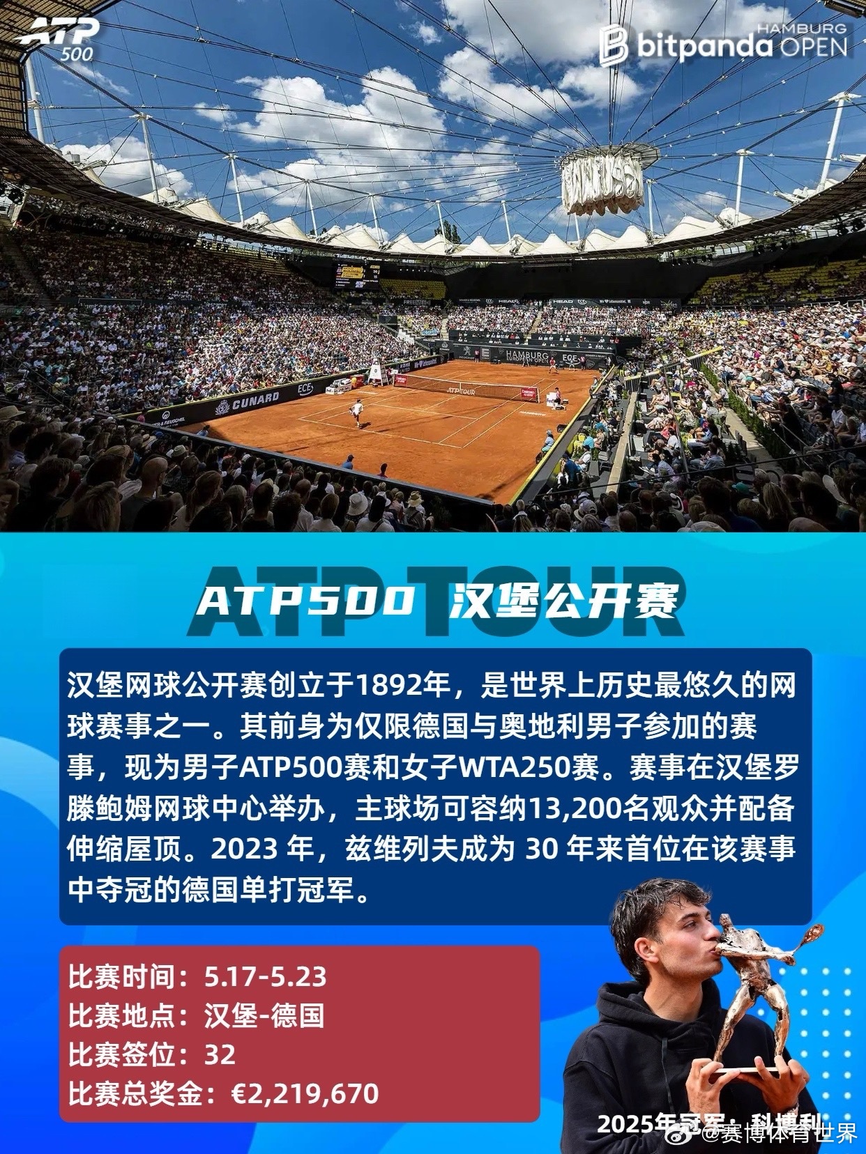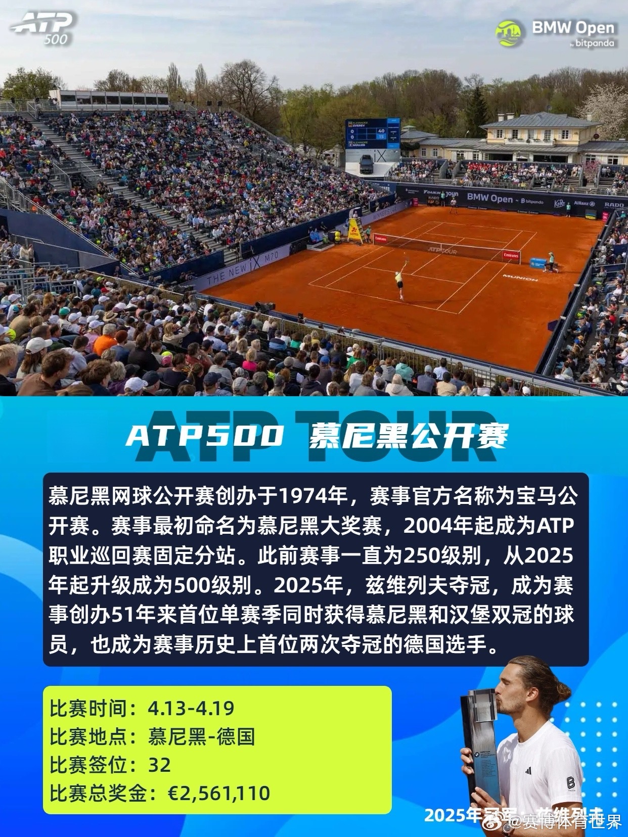 红土赛季ATP法网 ATP2026年4-6月红土赛季共设8站赛事,包括1站大满贯、3站1000赛、3站500赛和1站250赛,时间从4月5日持续至6月7日。具体赛程时间及赛事介绍如图。📆4.05-4.12ATP1000蒙特卡洛大师赛单打签位:56比赛总奖金:💶6,309,095卫冕冠军:🇪🇸阿尔卡拉斯📆4.13-4.19ATP500巴塞罗那公开赛单打签位:32比赛总奖金:💶2,950,310卫冕冠军:🇩🇰鲁内📆4.13-4.19ATP500慕尼黑公开赛单打签位:32比赛总奖金:💶2,561,110卫冕冠军:🇩🇪兹维列夫📆4.22-5.03ATP1000马德里公开赛单打签位:96比赛总奖金:💶8,235,540卫冕冠军:🇳🇴鲁德📆5.06-5.17ATP1000罗马公开赛单打签位:96比赛总奖金:💶8,235,540卫冕冠军:🇪🇸阿尔卡拉斯📆5.17-5.23ATP500汉堡公开赛单打签位:32比赛总奖金:💶2,219,670卫冕冠军:🇮🇹科博利📆5.18-5.23ATP250日内瓦公开赛单打签位:28比赛总奖金:💶612,620卫冕冠军:🇷🇸德约科维奇📆5.24-6.07大满贯 法国网球公开赛单打签位:128比赛总奖金:💶56,350,000(2025年)卫冕冠军:🇪🇸阿尔卡拉斯红土是球速最慢的场地类型,弹跳高,注重相持和上旋打法,胜利往往属于最坚韧的人。期待红土赛季!