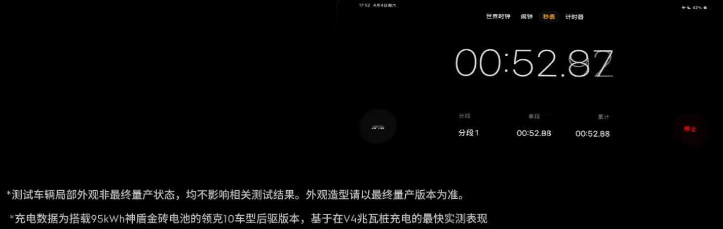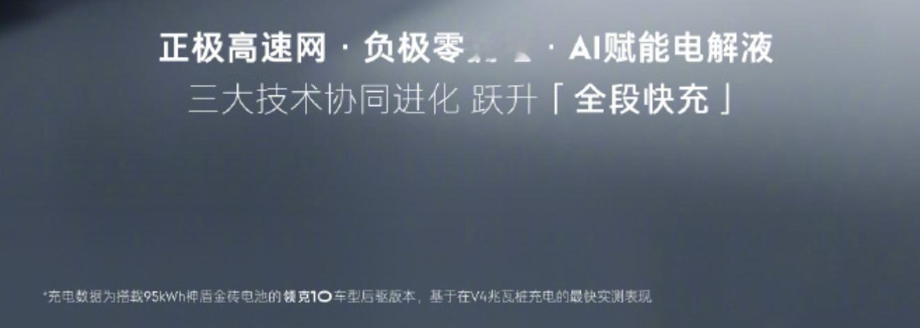 另外再说一下这个领克的充电效率,广告宣传左下角的小字别人没发,那我发出来:充电数据为搭载95kWh神盾金砖电池的领克1O车型后驱版本,基于在V4兆瓦桩充电的最快实测表现。