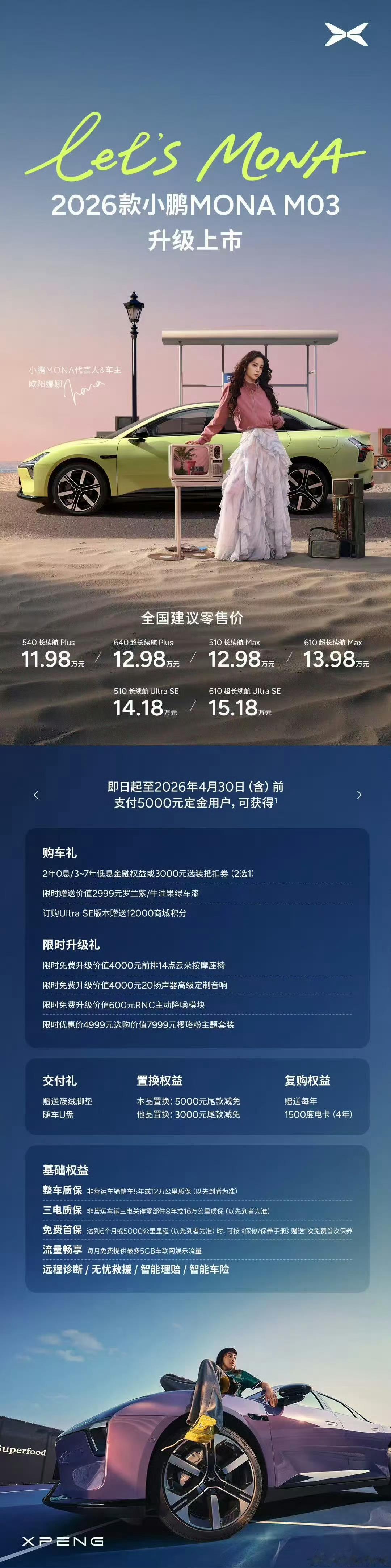 2026款小鹏MONA M03上市,加量不加价,20万级的配置和50万级的智驾体验都给了。香不香?!