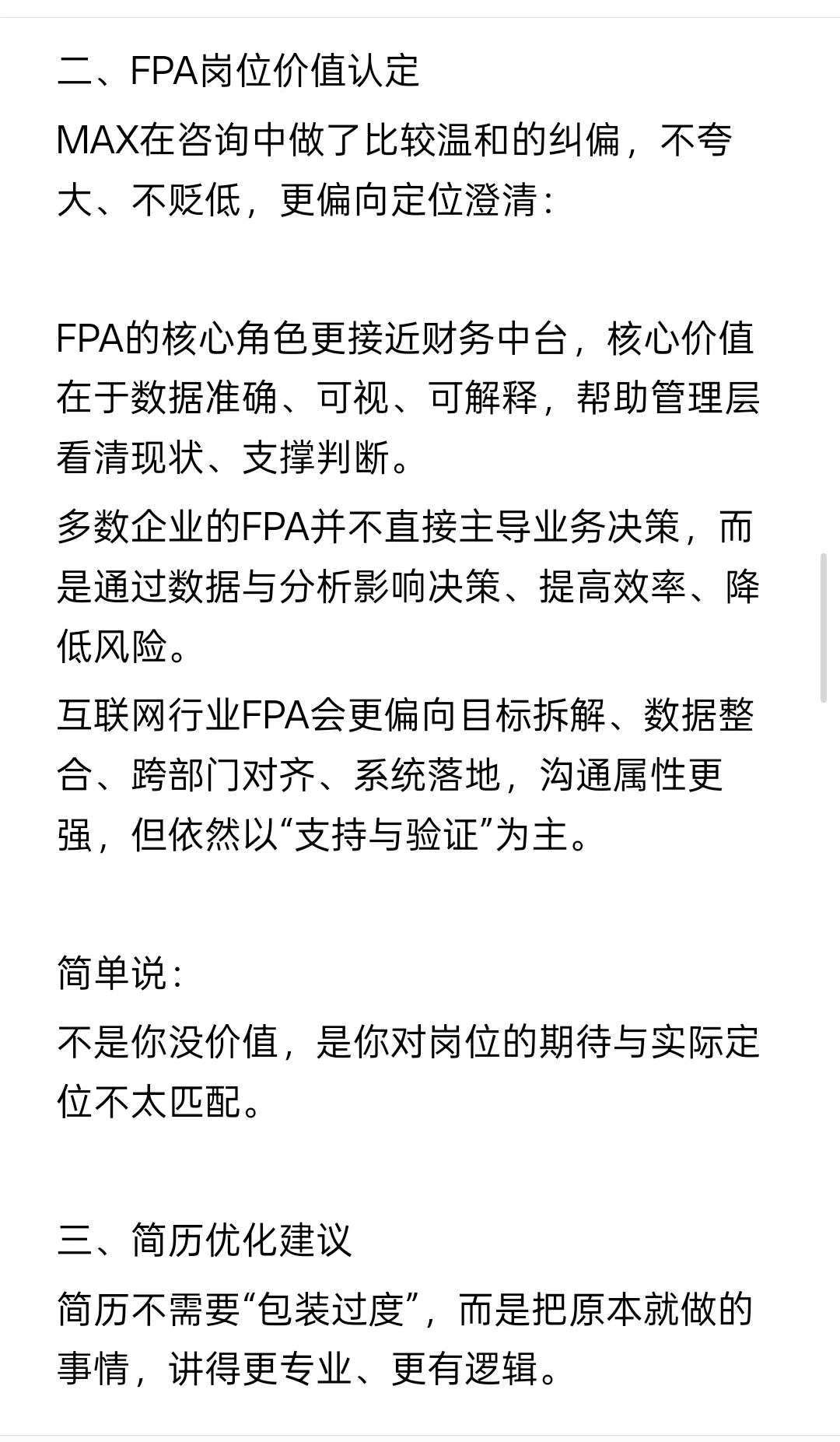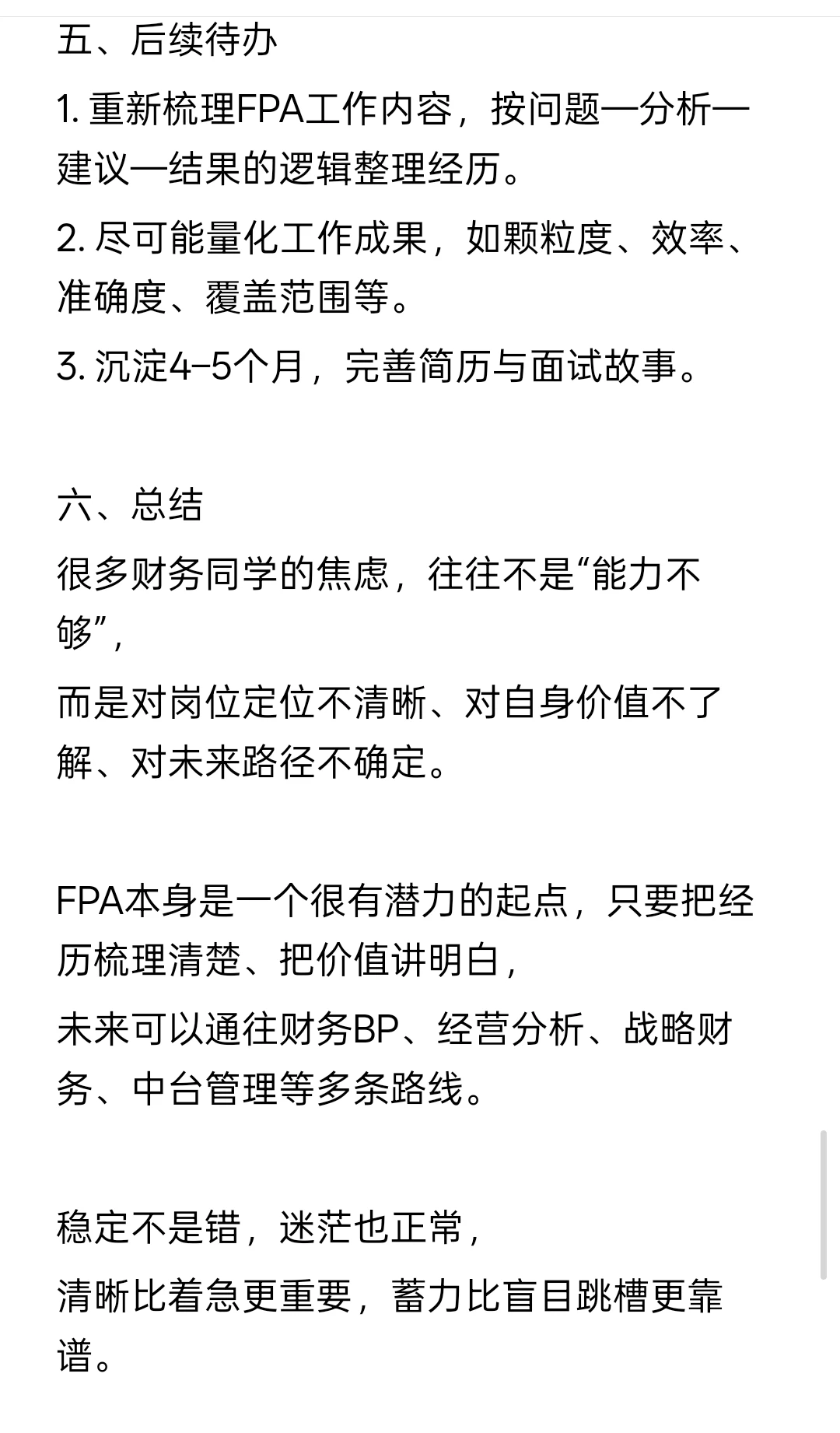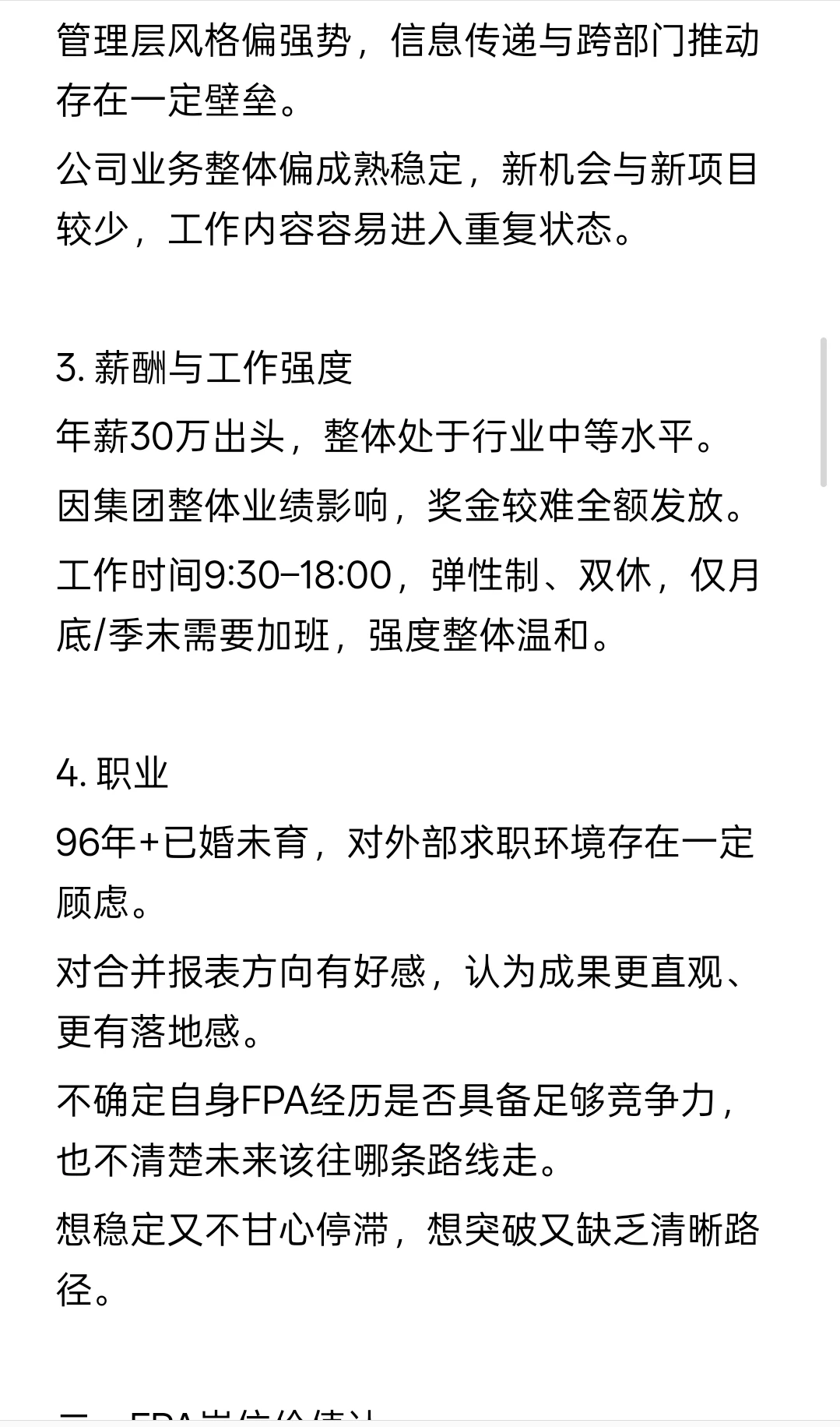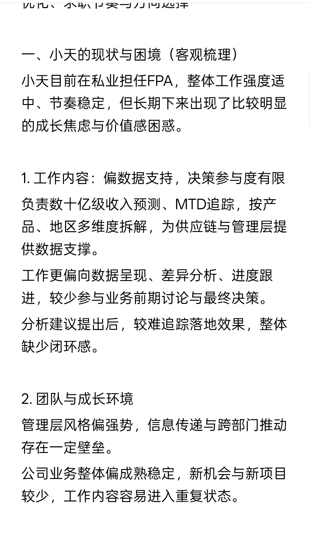小天目前在私业担任FPA,整体工作强度适中、节奏稳定,但长期下来出现了比较明显的成长焦虑与价值感困惑。