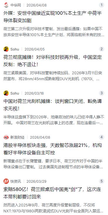 荷兰这次算是把事儿给做绝了。从2025年9月开始,荷兰政府就接连出狠招,先是把NXT:1970i和1980i这两款浸润式DUV光刻机全部拉进禁运清单,彻底切断了向中国市场的供货通道。更过分的是,禁令刚落地没几天,荷兰政府就翻出一部1952年的老法律,直接对中资控股的安世半导体下了行政冻结令,中国籍CEO的权限被当场解除,股权托管也强行接管了。这还只是开头。到了2026年3月,荷兰又宣布把28nm和45nm成熟制程的DUV光刻机也纳入管制,当天生效,不给缓冲、不给豁免,新订单和在途设备全部冻结。这不是贸易管制,这是全方位的科技封锁。面对荷兰这一系列操作,中国的态度现在非常明确:谈判的门已经关上了,豁免的事儿也别再提了。北京不打算再跟荷兰谈什么条件,荷兰也别指望能从中国这里拿到任何让步。甚至可以说,中国巴不得荷兰继续往死里封锁,好让全世界都看清楚一件事——谁要是愿意当美国的马前卒,那就要准备好付出比美国更惨痛的代价。