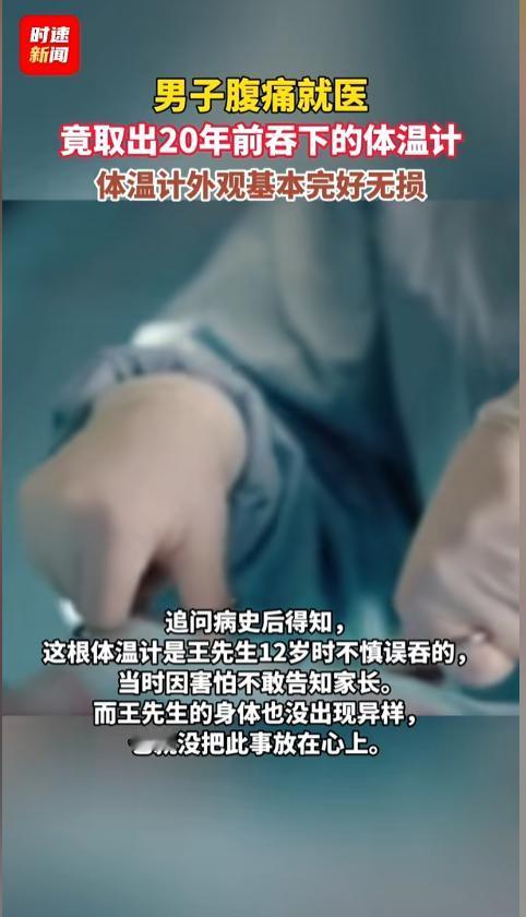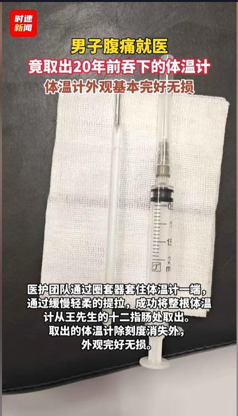信息来源:《男子腹痛就医,竟取出20年前吞下的体温计,体温计外观基本完好无损。》时速新闻