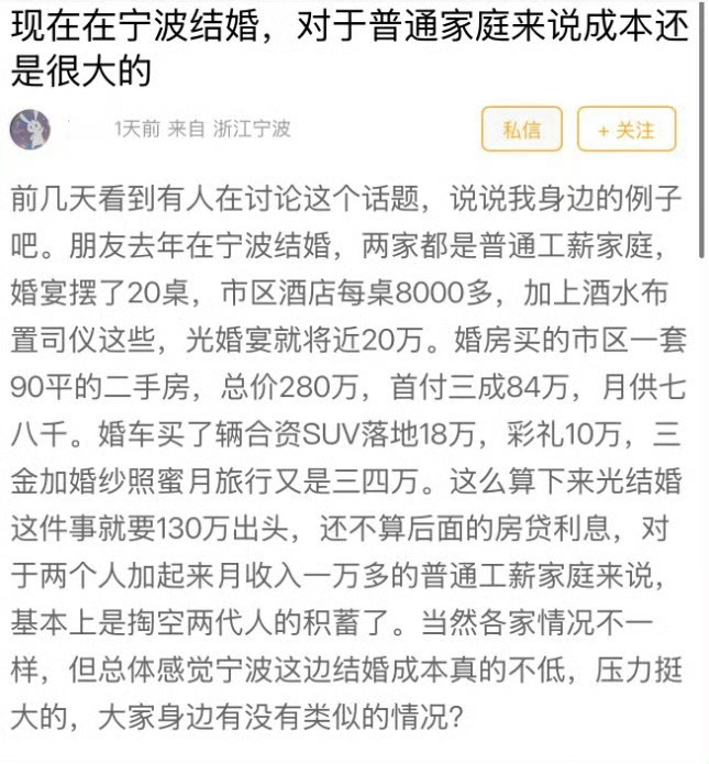 宁波家庭会用多少积蓄托举后代婚姻 在宁波结个婚,要掏空两代人的积蓄吗?网友无语:还是得认清自己的情况!最近,一个宁波结婚成本高的话题,在论坛里引起了热议。有网友发帖表示,身边有一对新人结婚,两边都是普通工薪家庭,最后一拉账单,发现几乎把两代人的积蓄掏空了有网友看到后,表示很能共情,对于很多普通家庭来说,负担确实大。你身边有没有在宁波结婚的朋友?他们结婚花了多少钱呢?