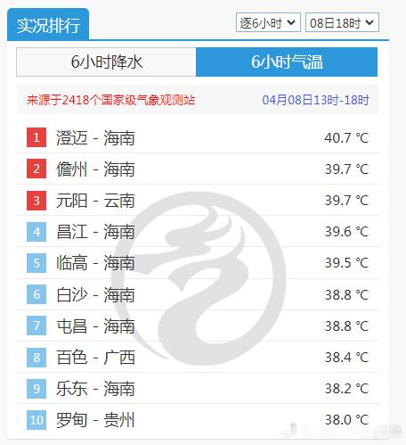 【高温和破纪录】今天最高气温,海南澄迈40.7℃,全国第一。广西百色38.4℃、贵州罗甸38℃,创各自省区今年以来气温新高。今天海南广西贵州新疆,共有8个站点气温打破4月上旬纪录,比如海南儋州39.7℃、乐东38.2℃。明天在海南广西贵州湖南江西福建浙江等地,依然存在气温破纪录的可能。